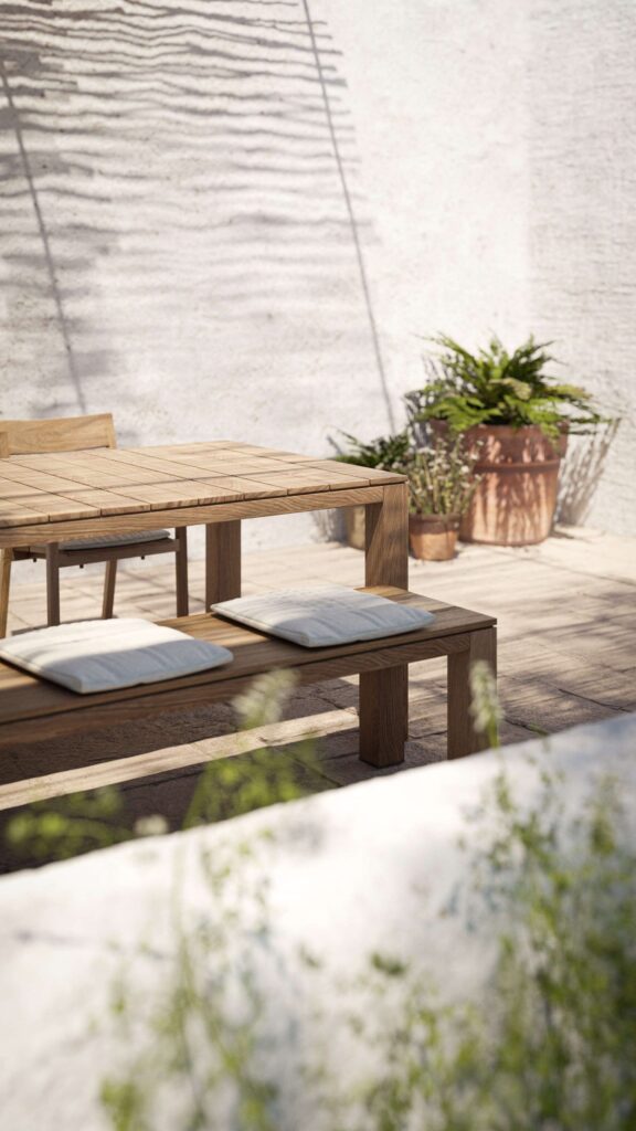 Banco alternativa informal a las sillas a la hora de reunirse alrededor de la mesa, pero también es perfecto como banco independiente en el jardín. Los anchos listones y el diseño puro, dejan ver el lado más robusto y moderno de la teca.