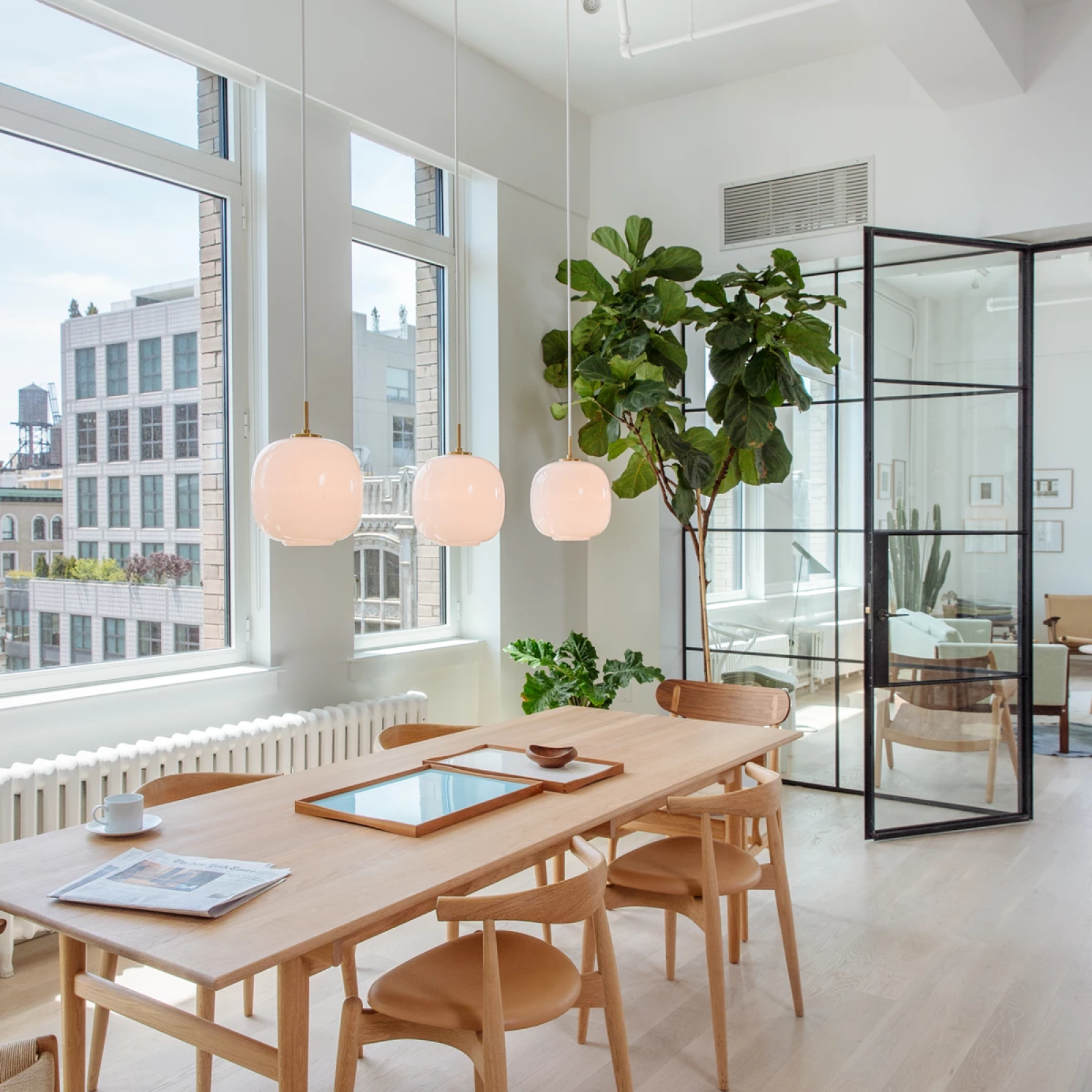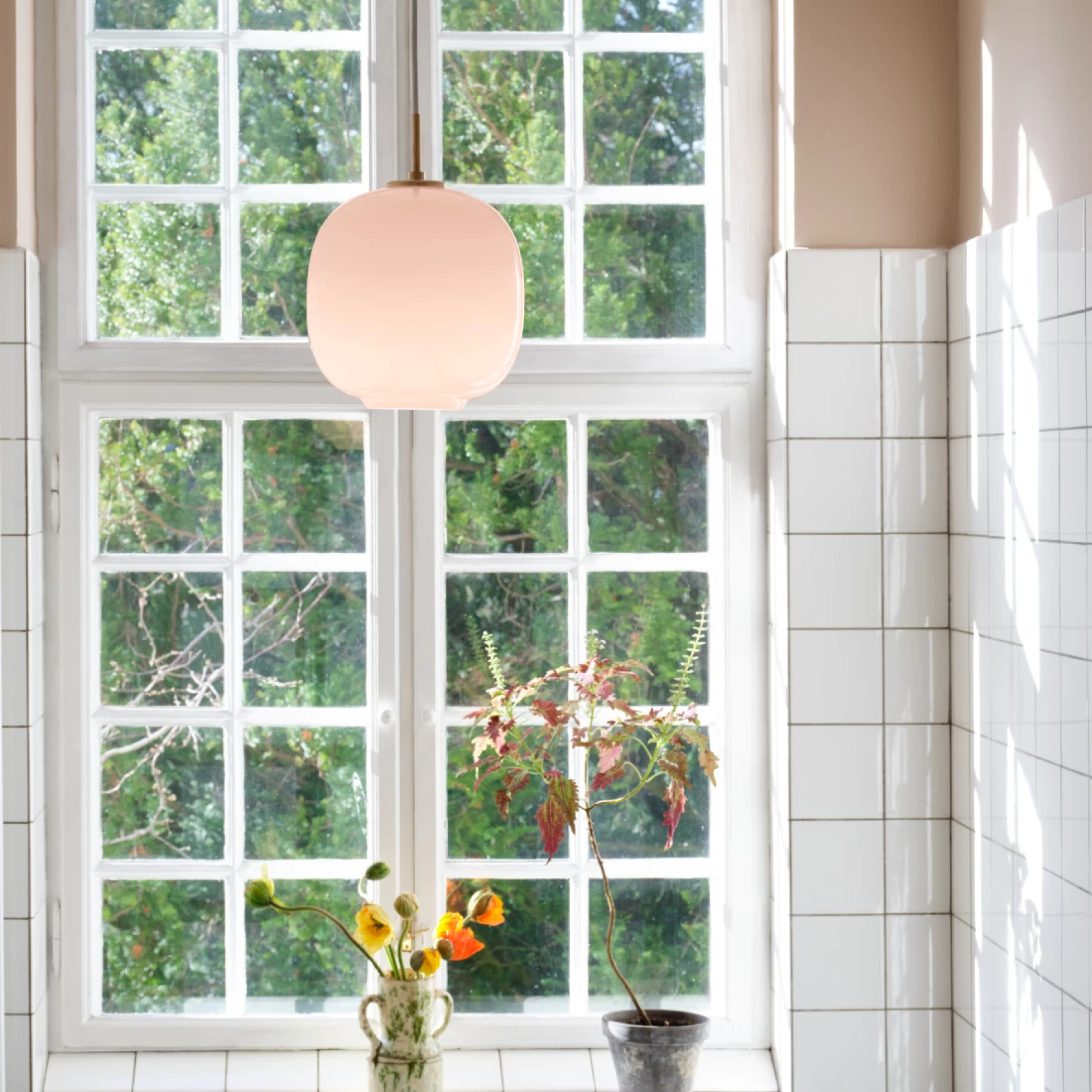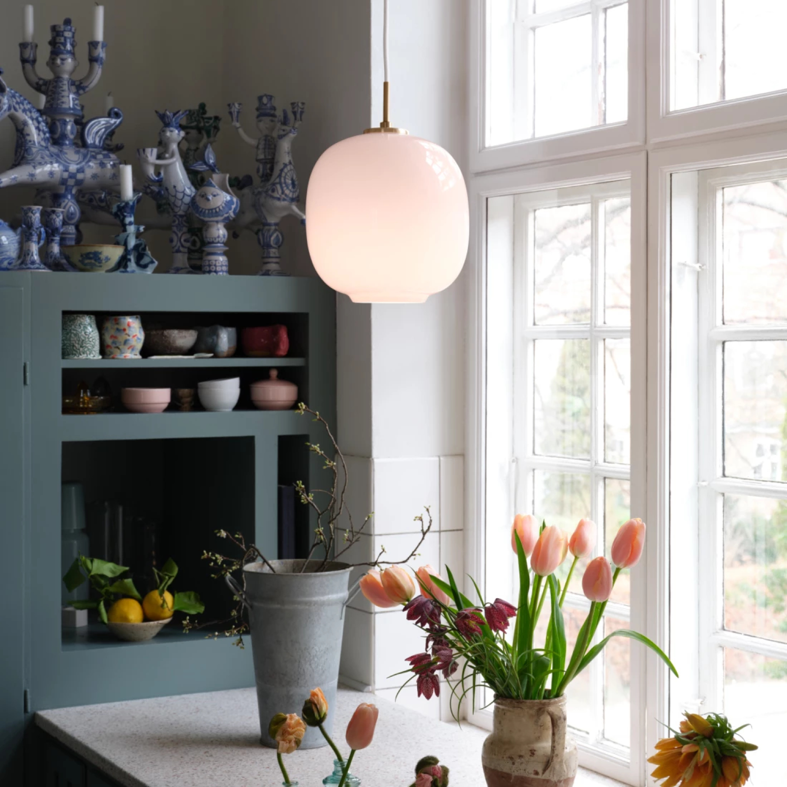 La lámpara de suspensión VL 45 Radiohus fue diseñada originalmente por el arquitecto danés Vilhelm Lauritzen para su gesamtkunstwerk en la Casa Danesa de Radiodifusión, también conocida como Radiohuset. El diseño original de la década de 1940 presenta una suspensión de latón y una pantalla de vidrio soplado a boca en tres capas de color blanco lechoso, una combinación clásica y elegante que fue reintroducida por Louis Poulsen en 2016. Un giro en el diseño icónico, la lámpara de suspensión VL 45 Pale Rose presenta un vidrio soplado a boca de cuatro capas de color rosa pálido combinado con la suspensión de latón cepillado, un sutil guiño a las tendencias contemporáneas de interior.