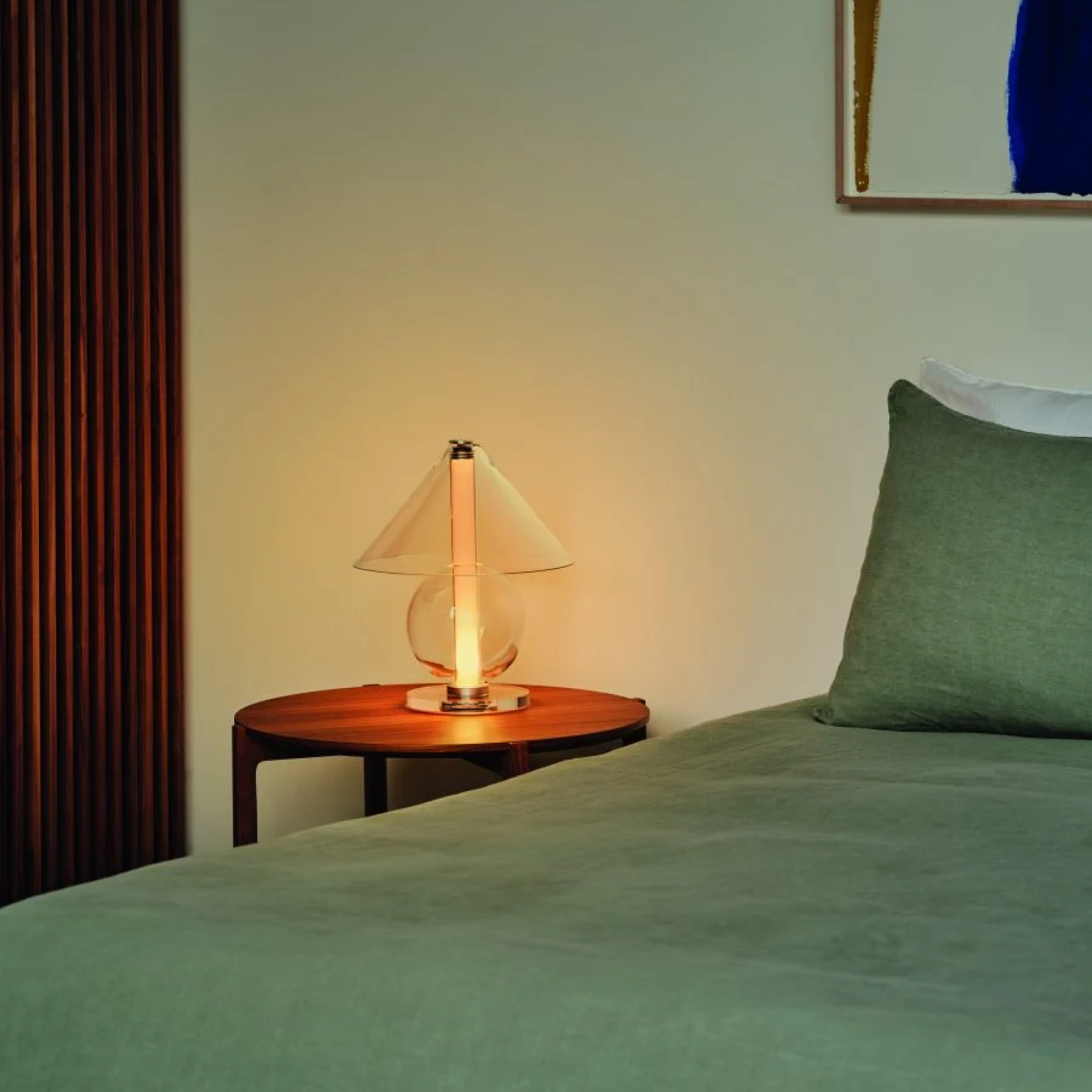 En su forma, encontramos reminiscencias del pasado; en el material, encontramos emoción. El vidrio no solo revela la fuente de luz, sino que también habla de pureza, ligereza y de cómo este diseño se integra con su entorno. Su estructura parece sostenerse sin esfuerzo, un logro muy serio en el que todo está a la vista. El cilindro matiza su luz cálida, difusa y gradual.