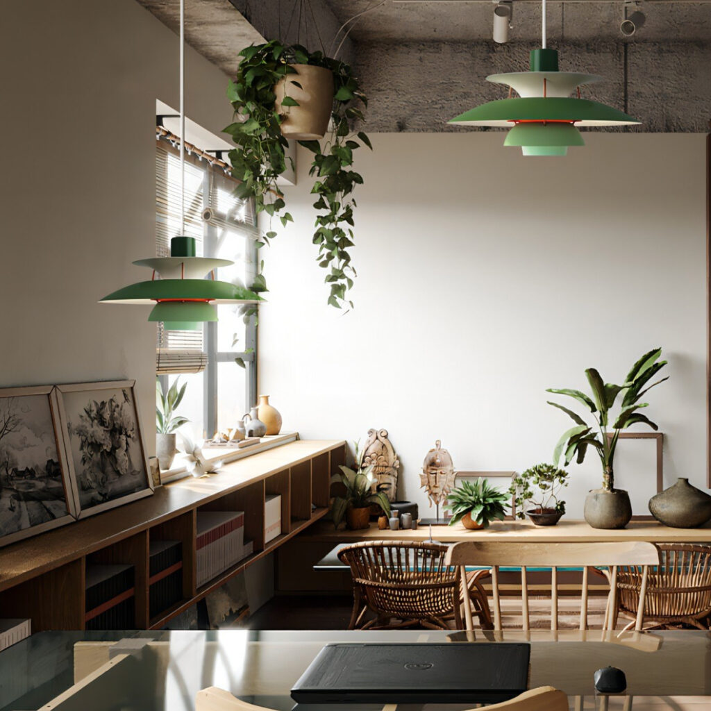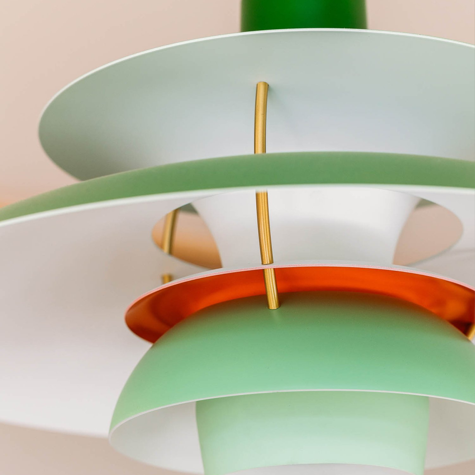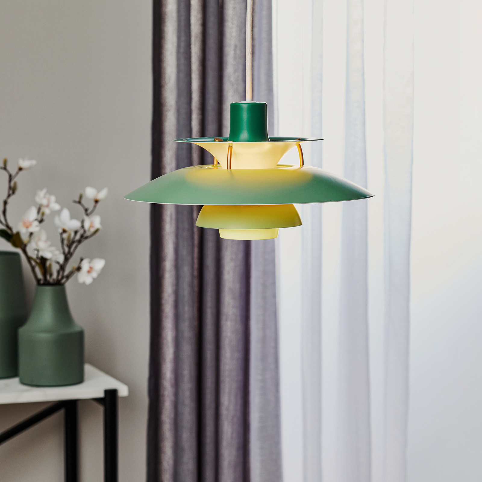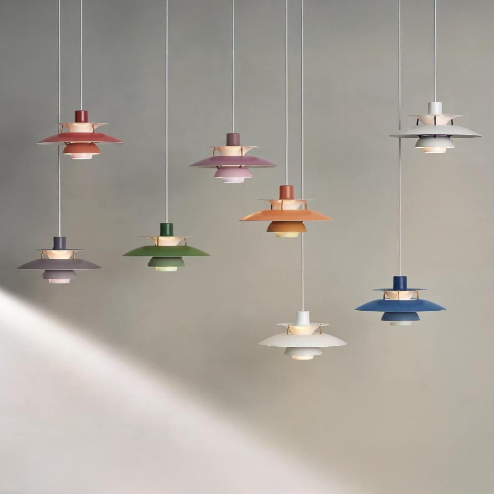 La versión más pequeña del PH 5 se introdujo en 2017 y se creó de acuerdo con el diseño original de Poul Henningsen, con una pantalla superior de aproximadamente 30 cm de diámetro. Henningsen tenía un enfoque científico distintivo hacia la luz y diseñó numerosas luminarias basadas en el sistema de tres pantallas que inventó en 1925 para lograr una excelente iluminación sin deslumbramiento. Utilizó la espiral logarítmica como base y logró una distribución uniforme de la luz con el sistema de múltiples pantallas, lo que permitió reducir el deslumbramiento y las sombras. En 2020, se introdujo la serie PH 5 Mini Monochrome para enfatizar este diseño impactante y ofrecer un aspecto más actual. Las pantallas de metal pintadas en mate están disponibles en negro, blanco y azul ultra para el decorador más audaz.