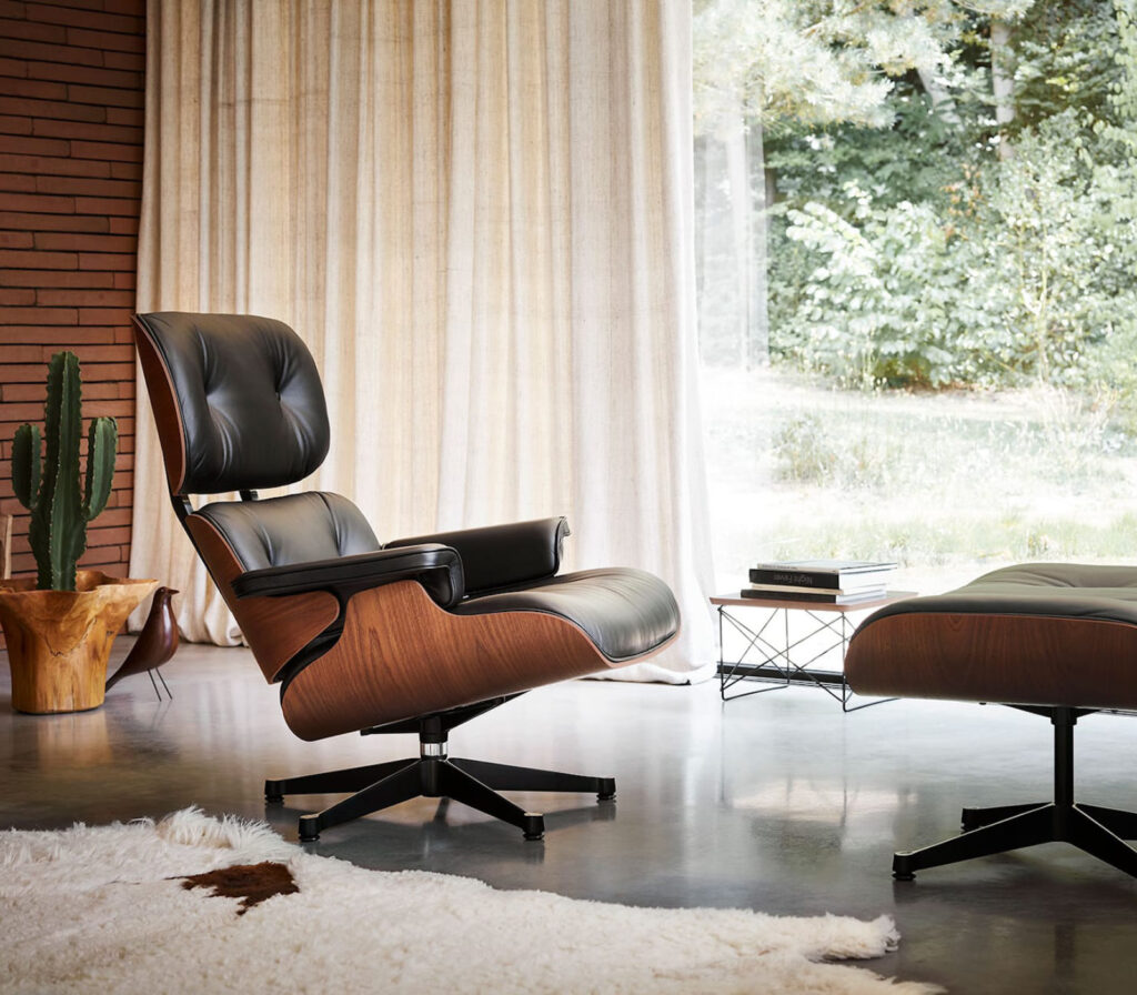 La butaca Lounge chair fue diseñada para combinar elegancia y confort. Desde el inicio de su fabricación en 1950, hasta ahora se sigue fabricando prácticamente con los mismos métodos. Edición especial invierno 2023 en tela Phlox color verde oscuro.