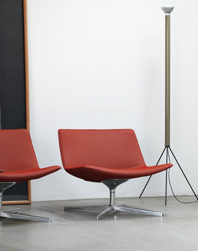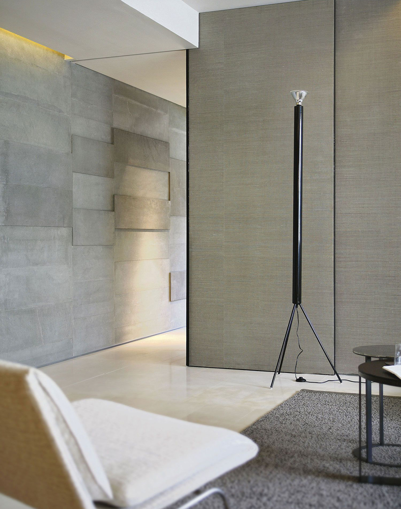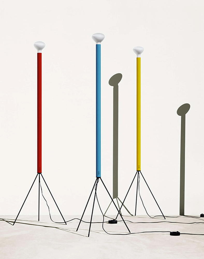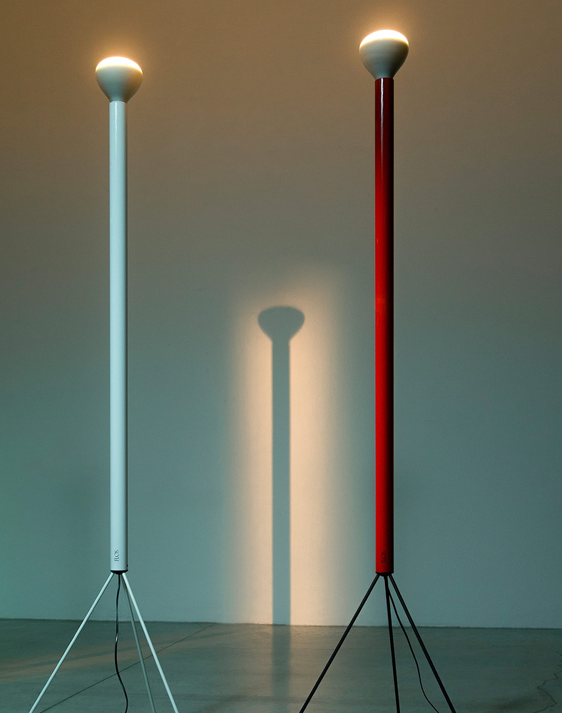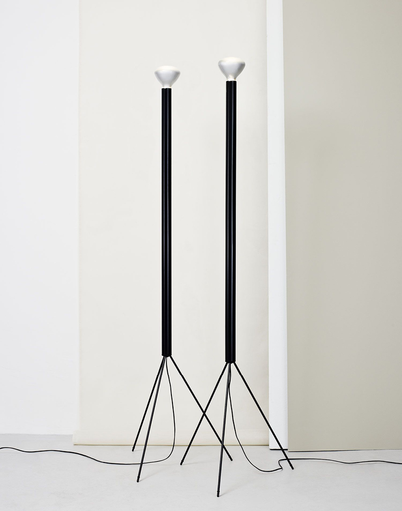 Lámpara de pie. De luz indirecta. Cuerpo de hierro esmaltado en negro y patas en metal pintado en el mismo acabado. Bombilla reflectora.