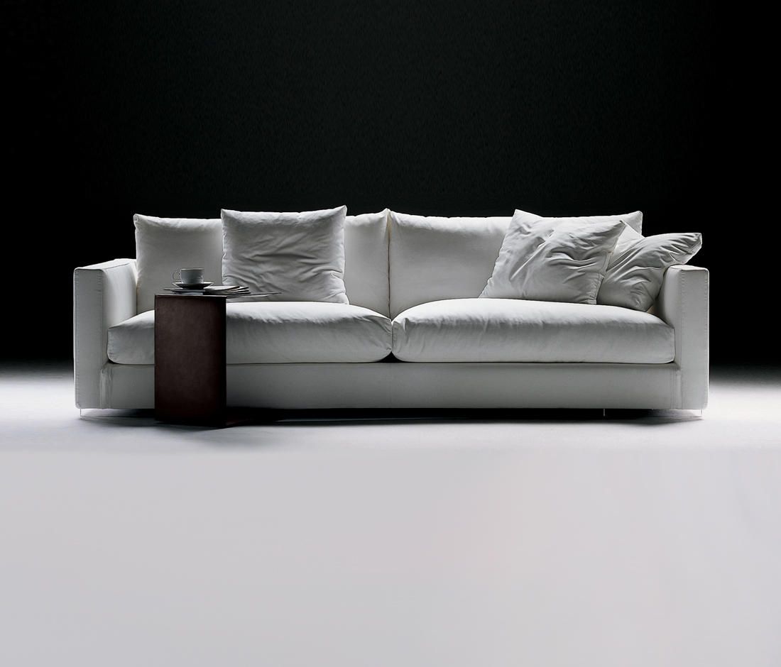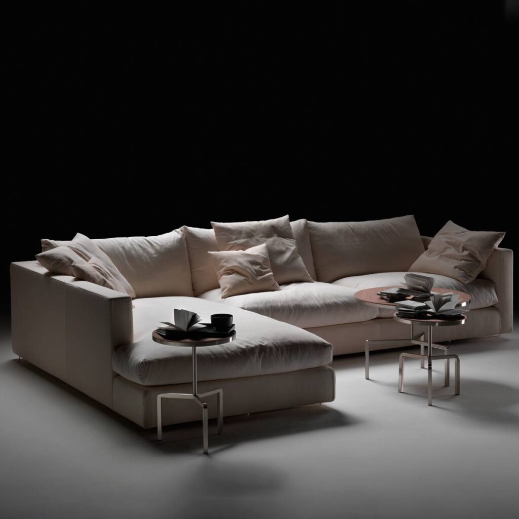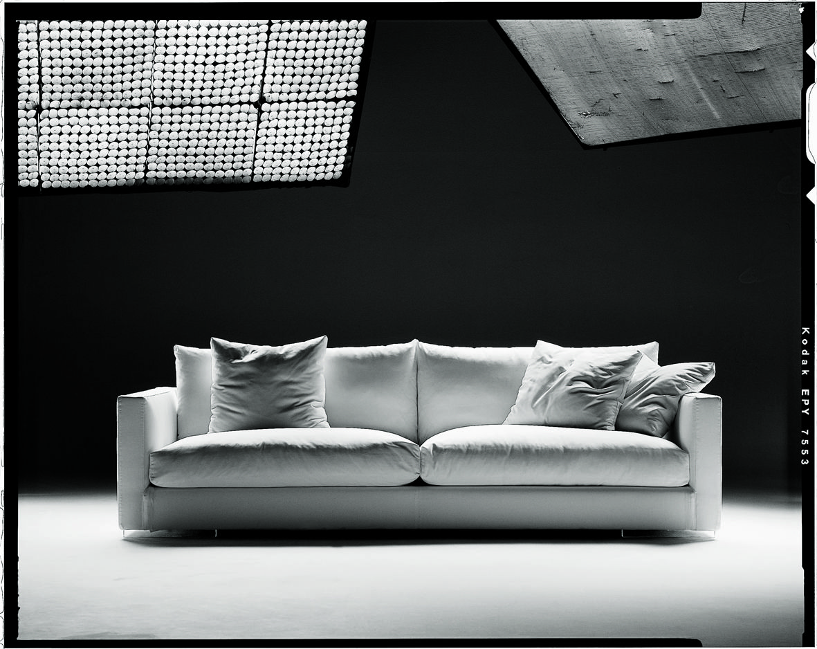 Sofá con pies de metacrilato que ofrece un aspecto ligero. Diseñado para ofrecer una gran comodidad gracias al relleno de sus cojines en pluma de ganso con inserto de material indeformable.