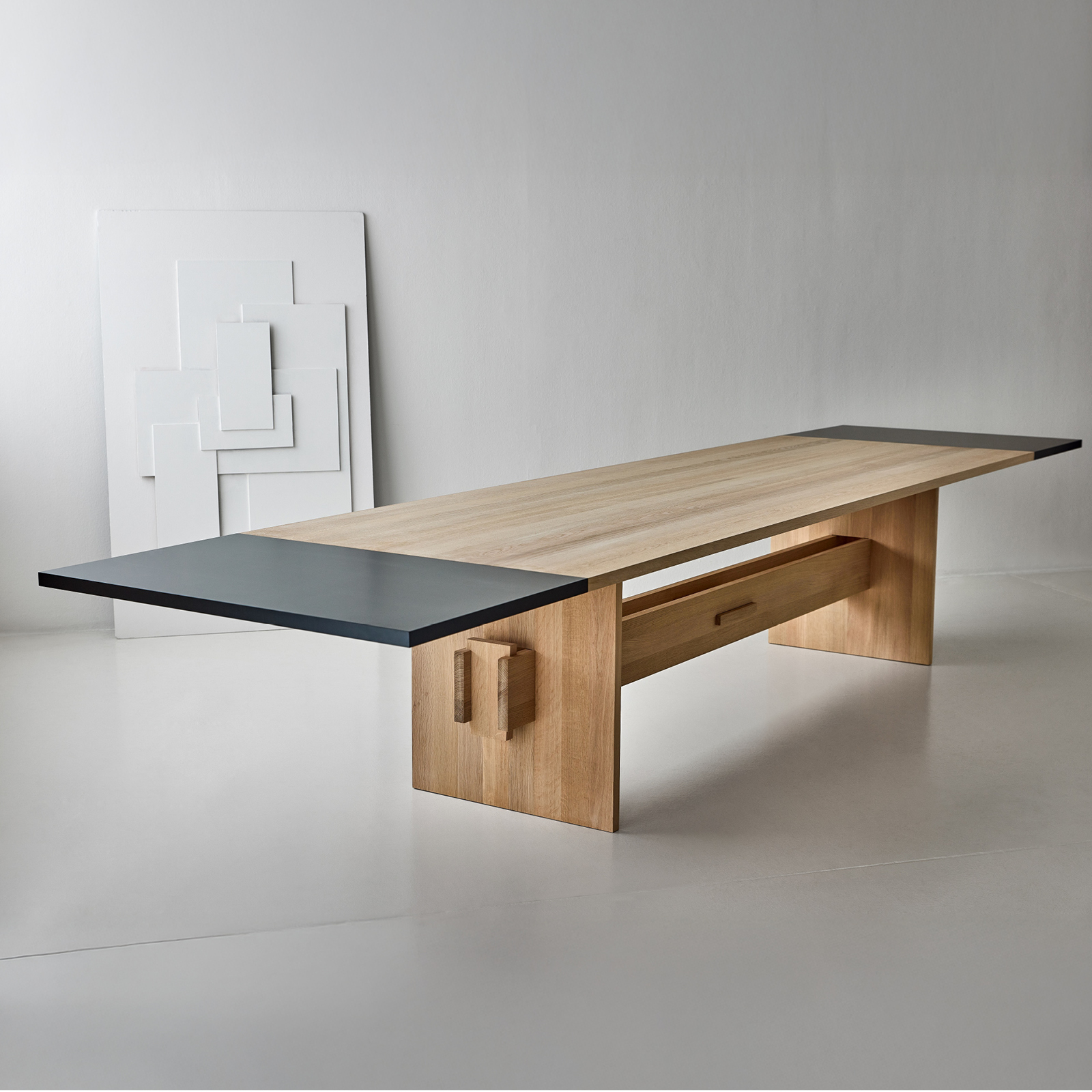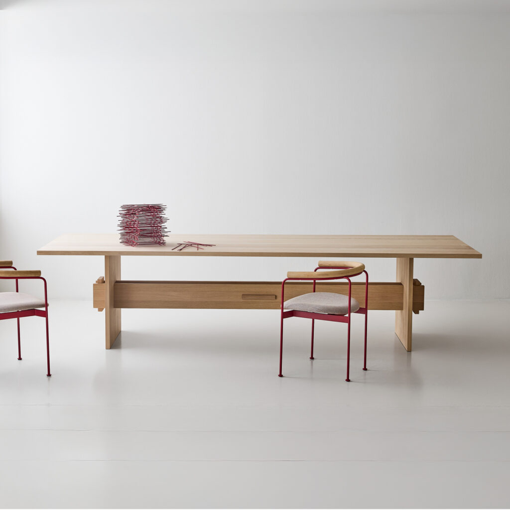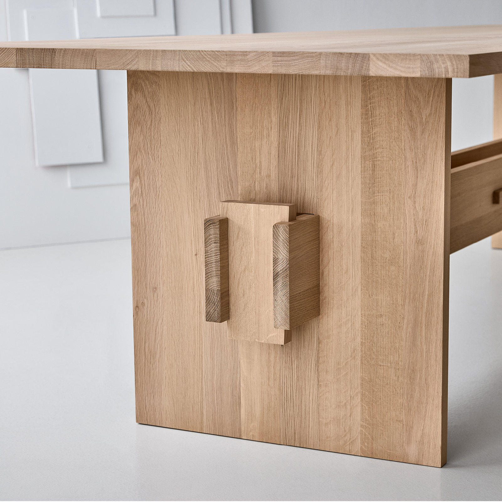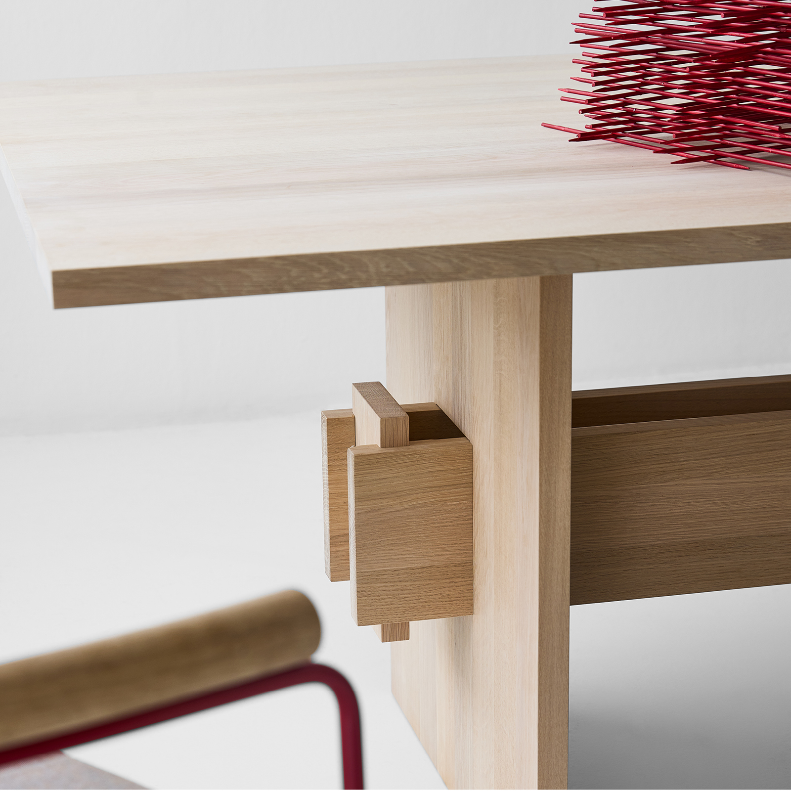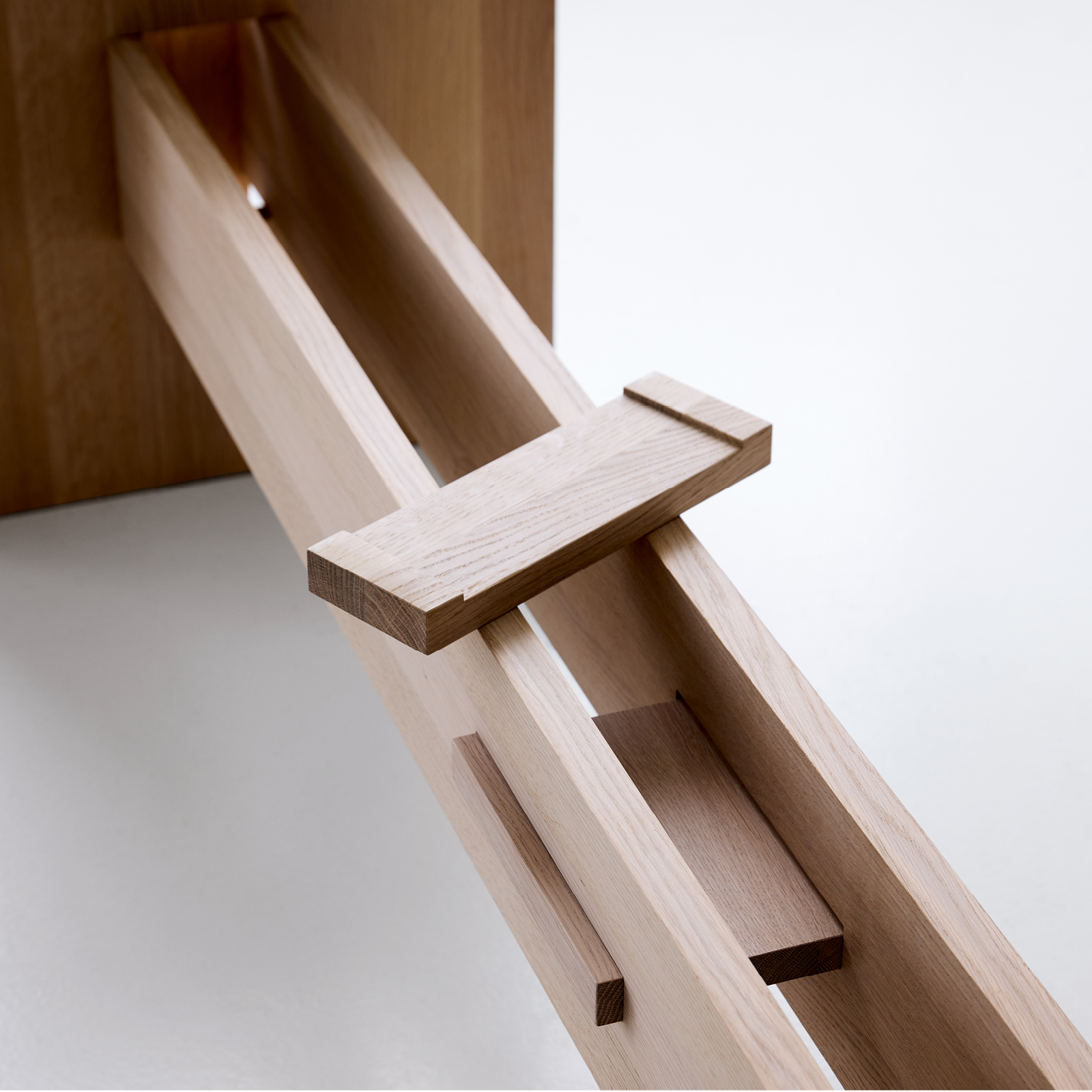 La estructura natural de la madera se une maravillosamente con las singulares uniones de carpintería. Un ejemplo es el uso de cuñas de madera en la construcción de las patas. Además de garantizar la estabilidad de la construcción, las cuñas ocupan un lugar central en el diseño visual de la mesa, en lugar de quedar ocultas.
