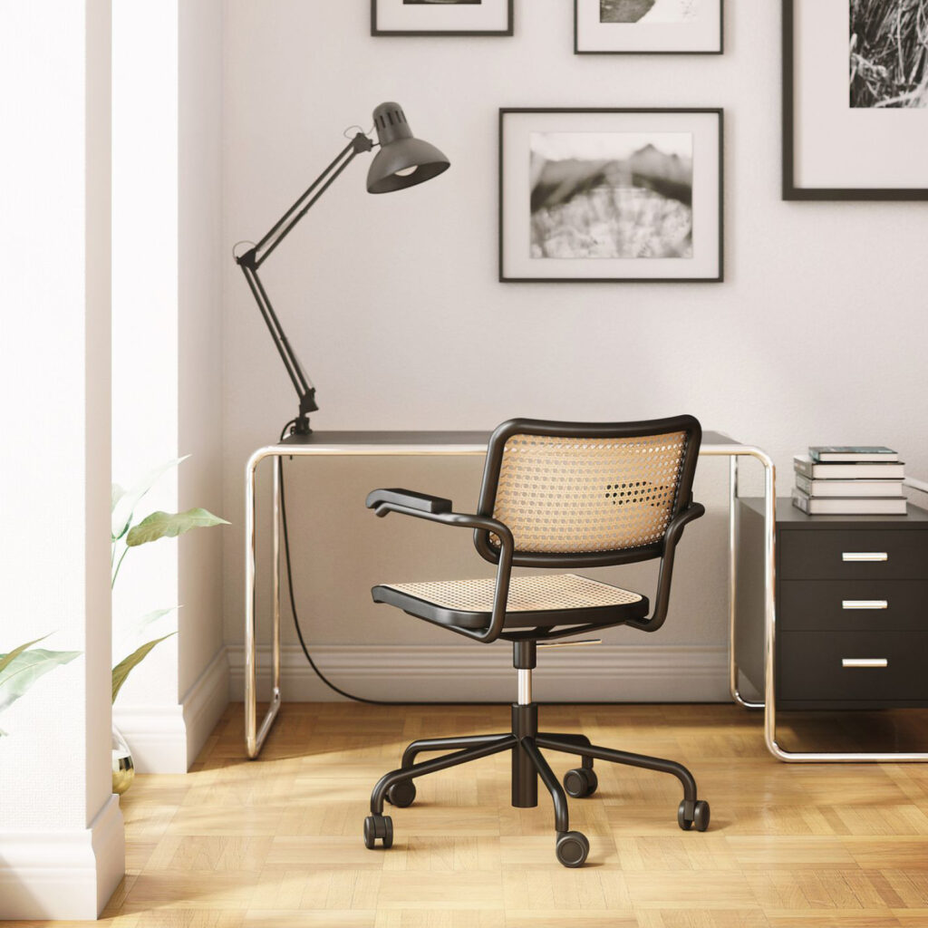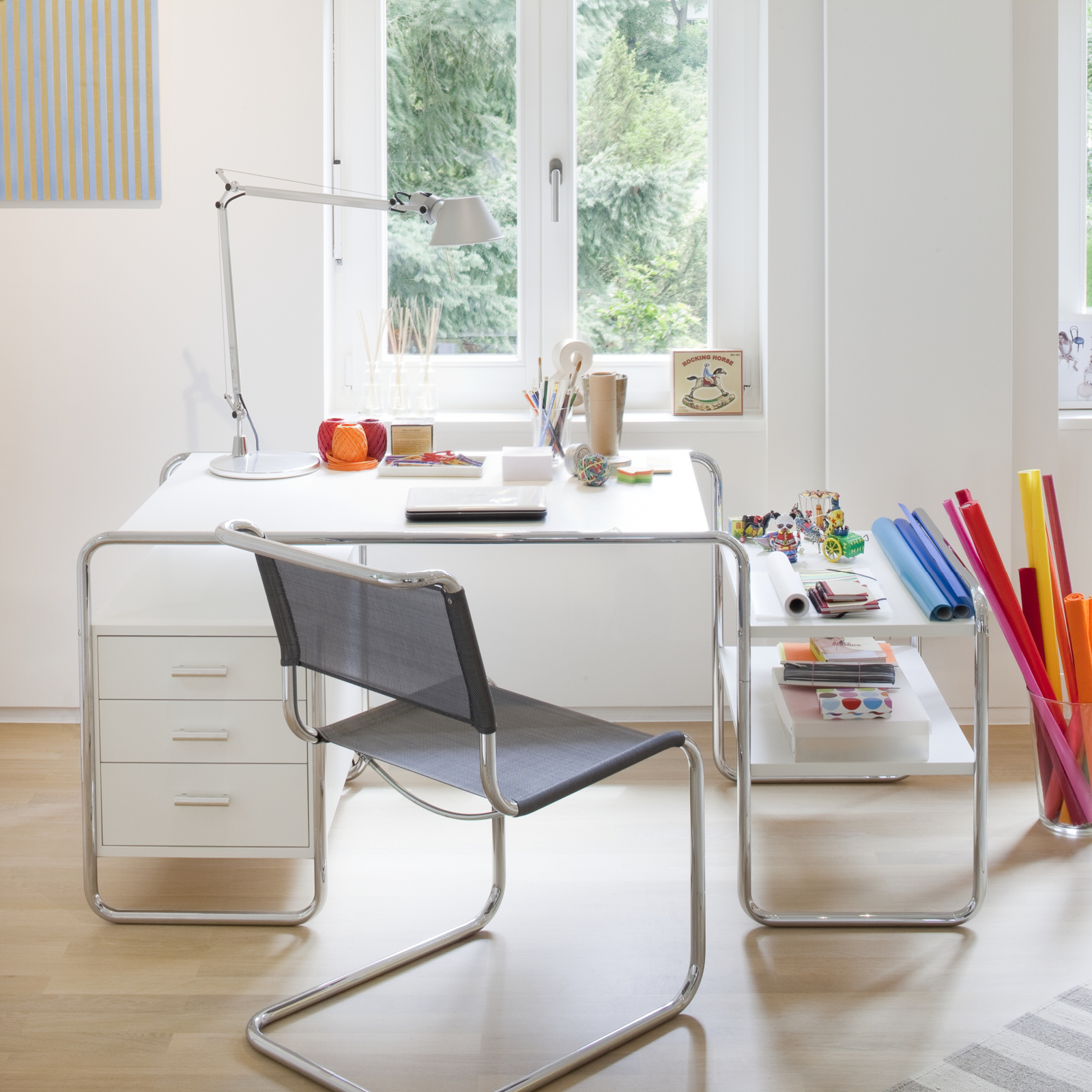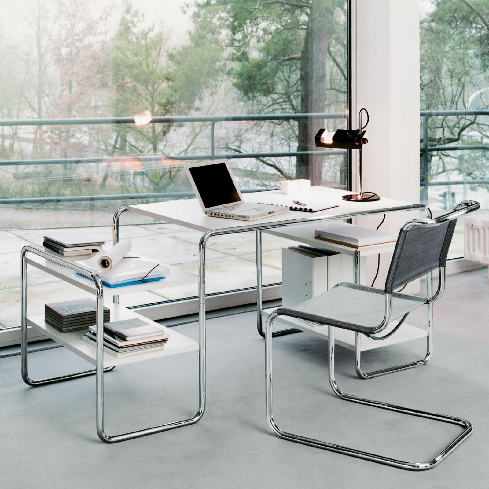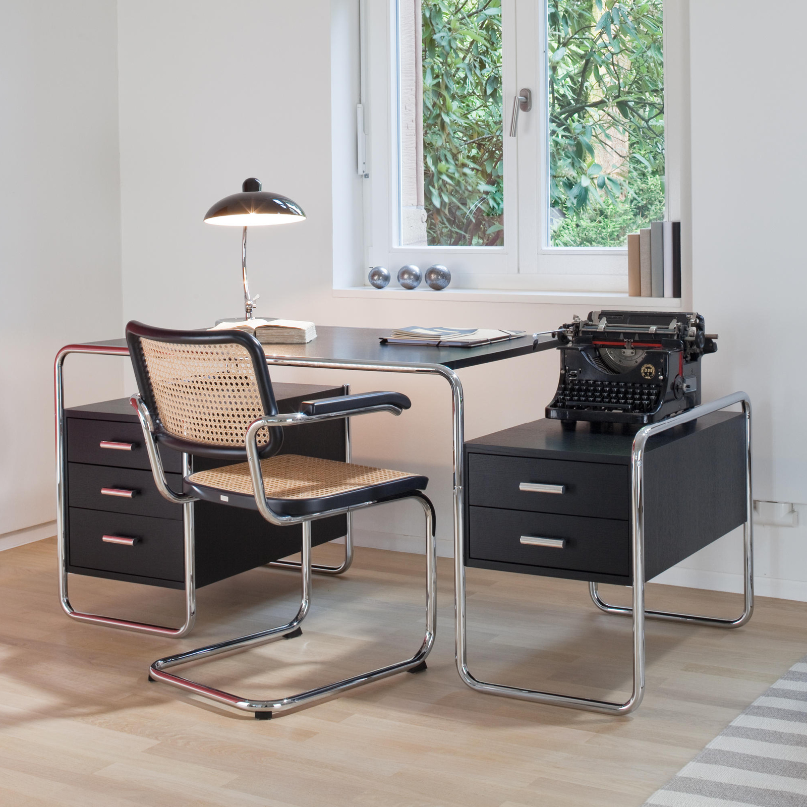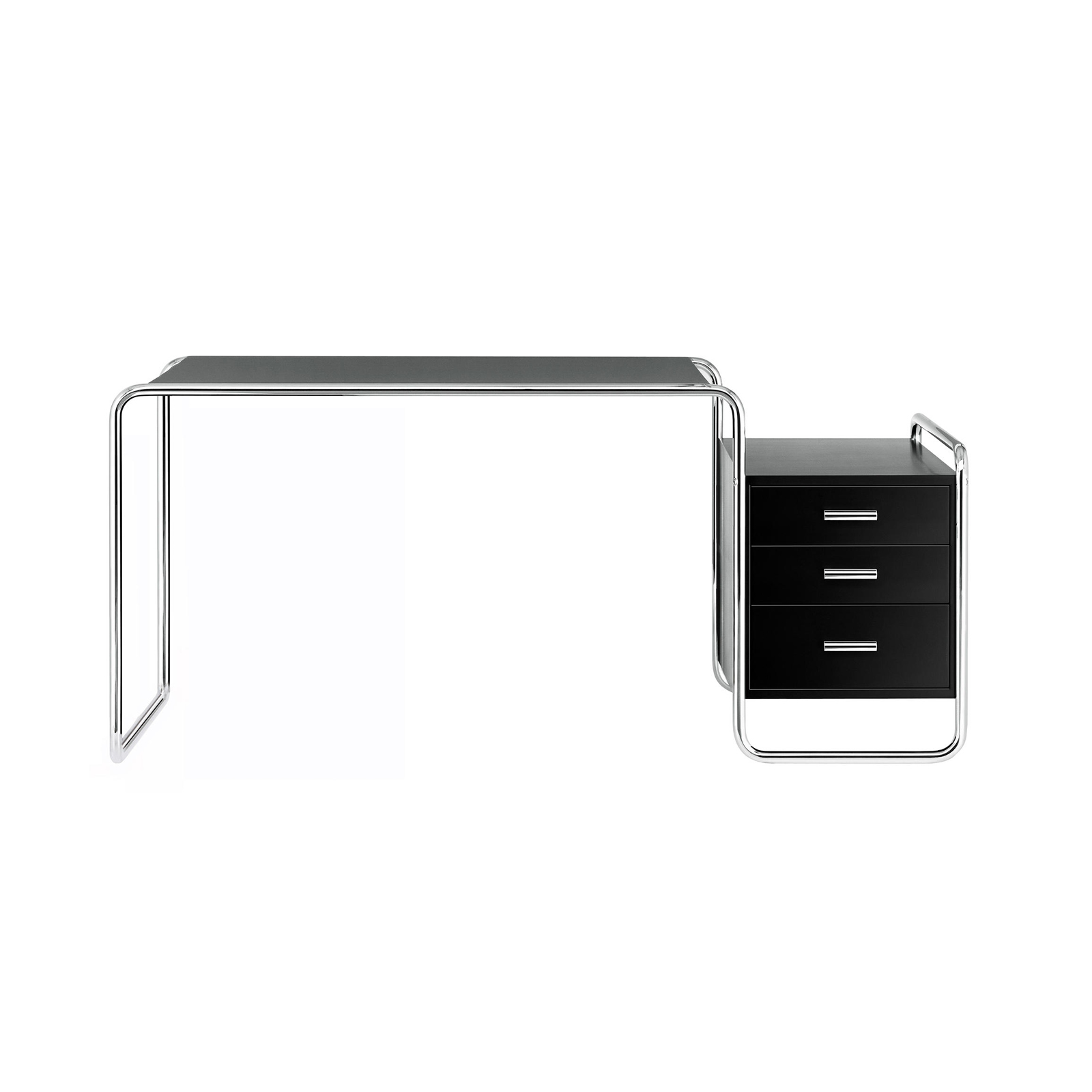 Es como si Marcel Breuer se hubiera anticipado a las oficinas domésticas y los ordenadores portátiles de hoy en día: El compacto escritorio de tubo de acero S 285 que diseñó es un elegante compañero para el trabajo y el estilo de vida modernos. El escritorio de tubo de acero S 285 de Marcel Breuer para Thonet es un exitoso ejemplo de la pretensión programática de la Bauhaus de combinar arte y tecnología en una nueva entidad. Breuer era carpintero de formación y combinó su conocimiento del acero tubular como material con su experiencia en diseño de interiores. El tablero y los elementos de almacenamiento de madera barnizada o teñida encajan armoniosamente en el armazón de tubo de acero. La estructura portante está formada por una línea curva, y los elementos de madera caracterizados por formas claras parecen flotar en ella. Este mueble de proporciones formalmente equilibradas representa una pieza importante de la historia contemporánea, conocida como «La nueva objetividad». Thonet produce varias versiones de este llamativo modelo.