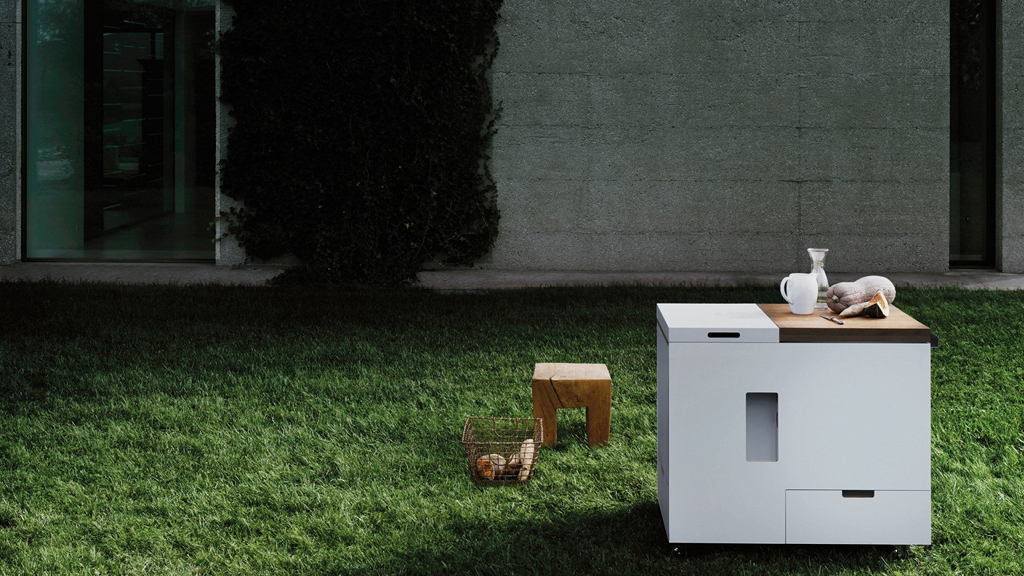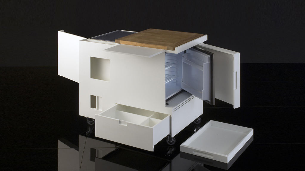 Cubo de cocina móvil sobre ruedas. Colombo en 1966 dijo: » las cosas tienen que ser flexibles», «mi cocina se puede mover facilmente cuando no se usa y se cierra creando un volumen compacto como una caja». Minikitchen es un mueble completo sobre ruedas, con accionamiento eléctrico y que comprende todo lo necesario de una cocina, aunque sea en miniatura: frigorífico, vitrocerámica, cajones para ollas y platos para 6 personas, bandeja extraible, tomas para pequeños electrodomésticos, tablas de cortar. Ganó la medalla de plata en la XIII Trienale di Milano en 1964, y se exibió en el MoMA, en la legendaria exposición de 1972 «Italia: El nuevo paisaje doméstico», donde forma parte de la colección permanente.