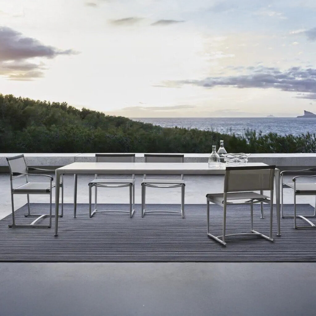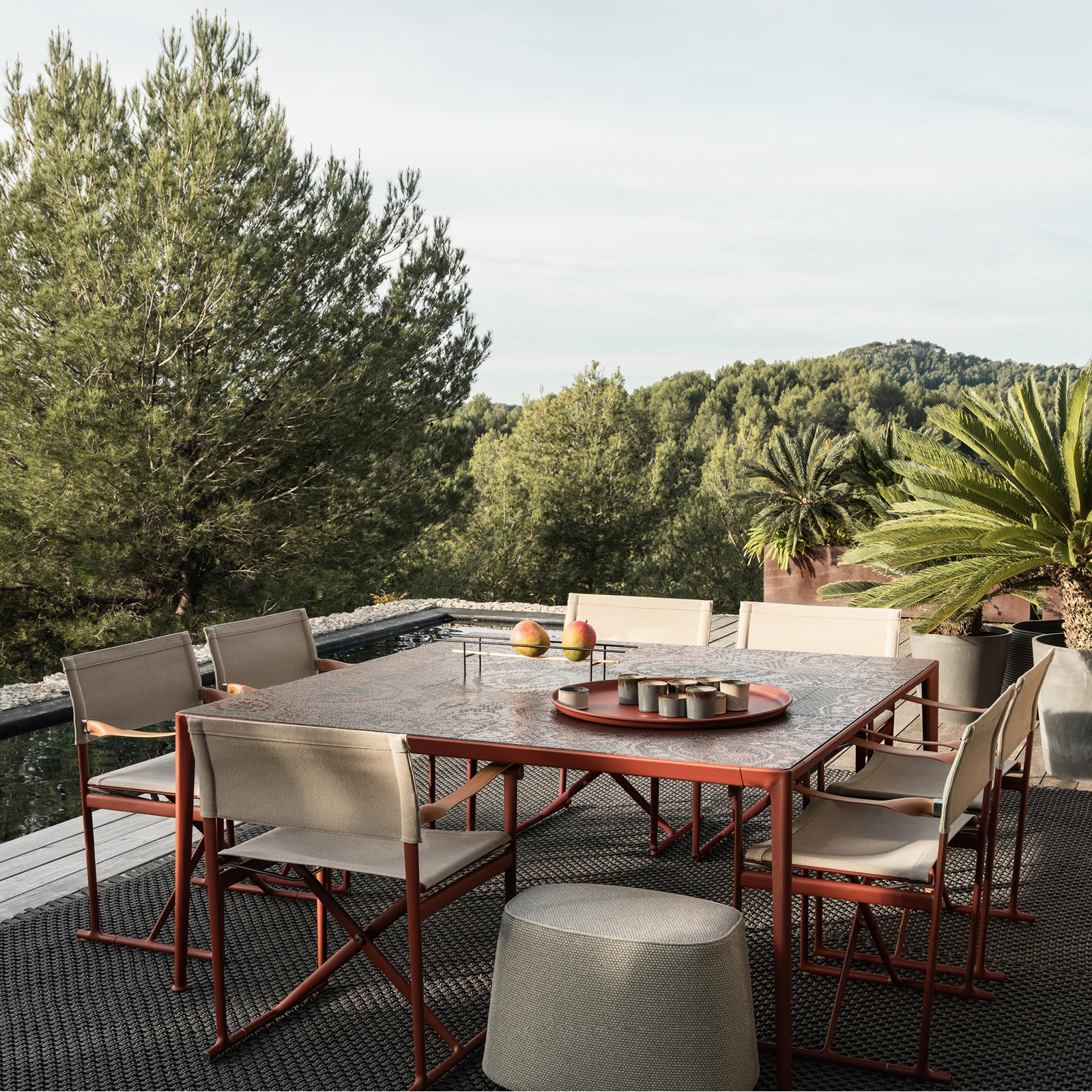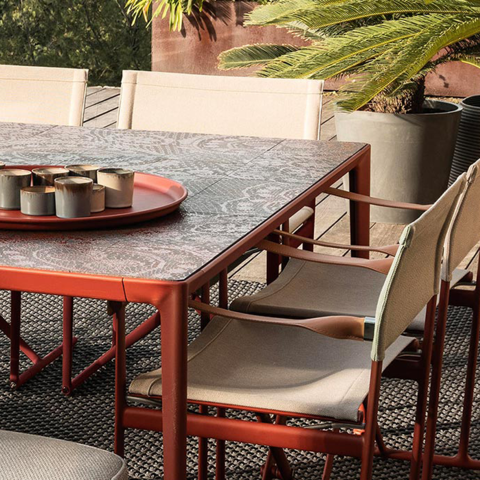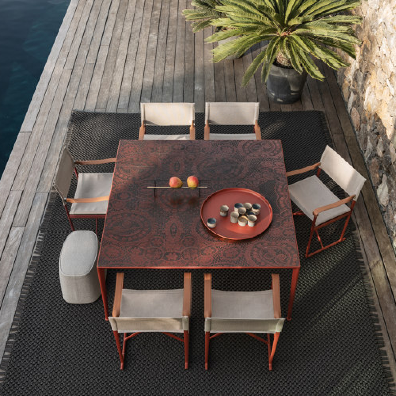 Las mesas Mirto Outdoor se caracterizan por su pureza de formas, elegancia atemporal y detalles de calidad. Disponibles en numerosos tamaños, se presentan con ligeras estructuras de aluminio inyectado y una variedad de tableros: de aluminio pintado, lamas de iroko, gres porcelánico y baldosas de piedra de lava esmaltada decoradas con reproducciones de encajes tradicionales sicilianos. Esta última versión utiliza un material especial para la decoración, obtenido rompiendo el cristal de monitores e instrumentos electrónicos desechados, y aplicándolo a la superficie de las baldosas mediante un exclusivo proceso de fabricación.
