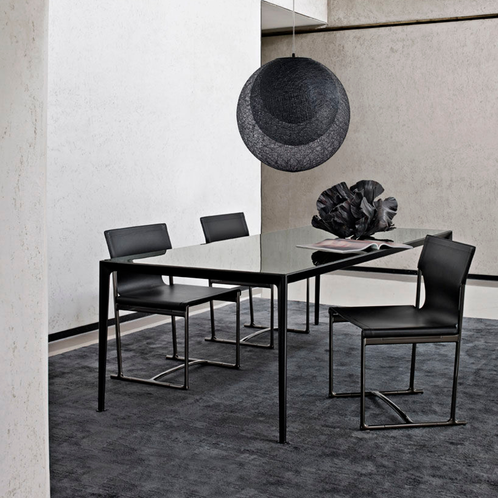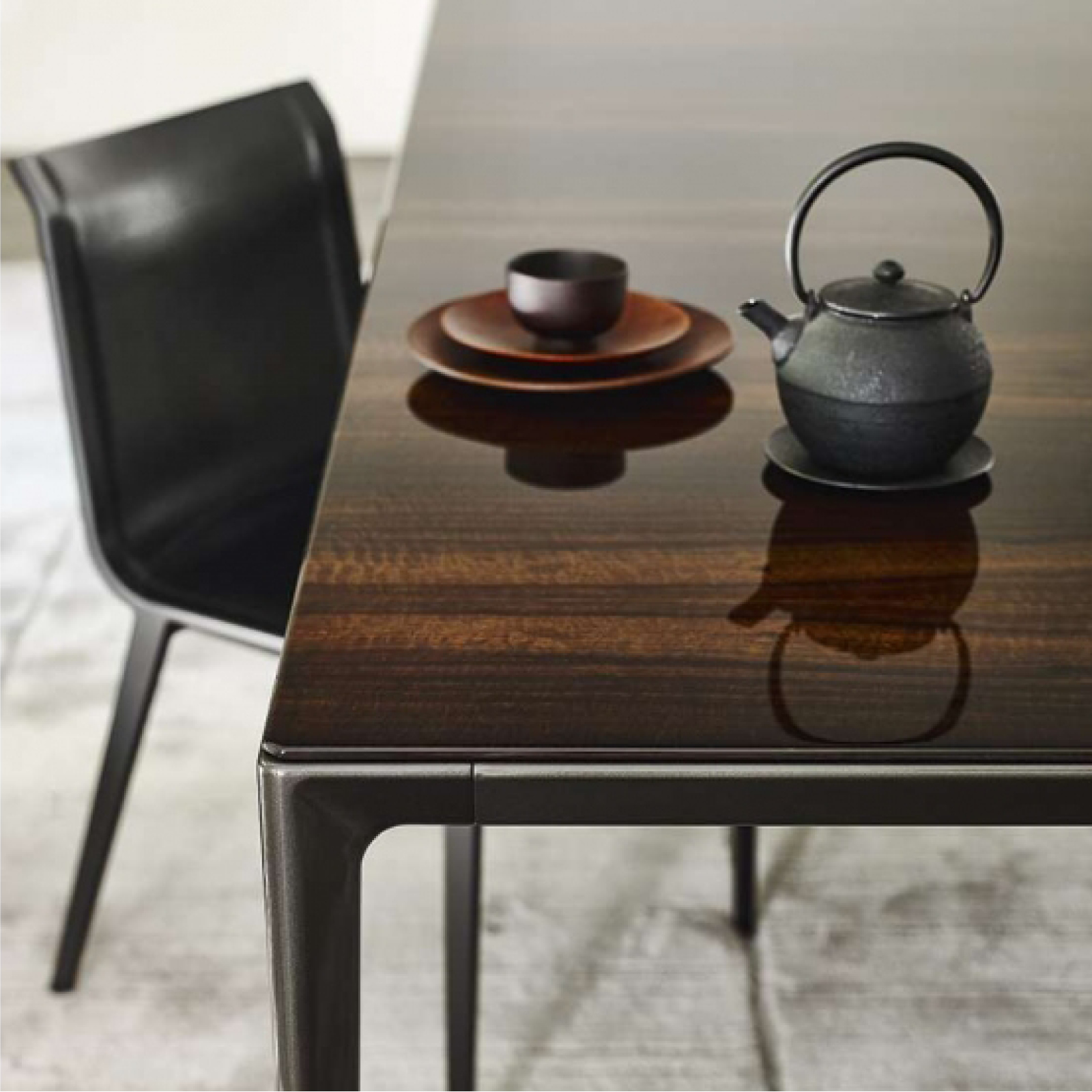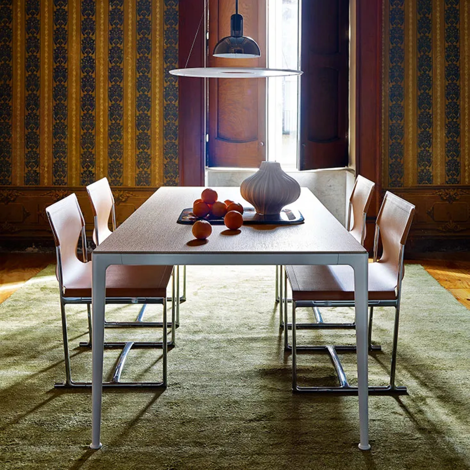 Mesa de lineas finas, rectas, con base de cuatro patas posicionadas en los extremos que facilita el posicionamiento del máximo de personas en la mesa. Base en aluminio acabado a elegir y sobre en diferentes acabados de B&B Italia. Disponible en varias medidas.