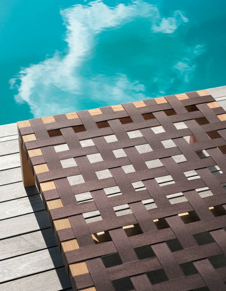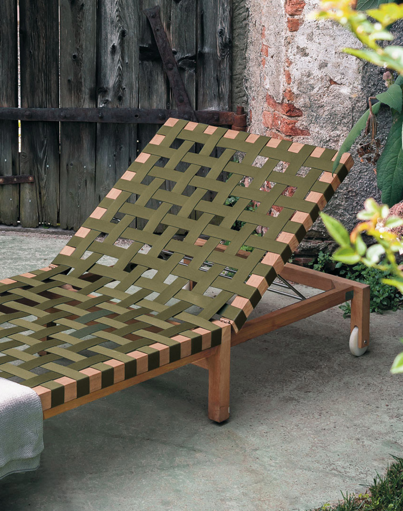 La tumbona Mistral diseñada por Rodolfo Dordoni para Roda con armazón en teak y sostén en correas de poliéster. Con ruedas en la parte delantera y el respald regulable en 7 posiciones.