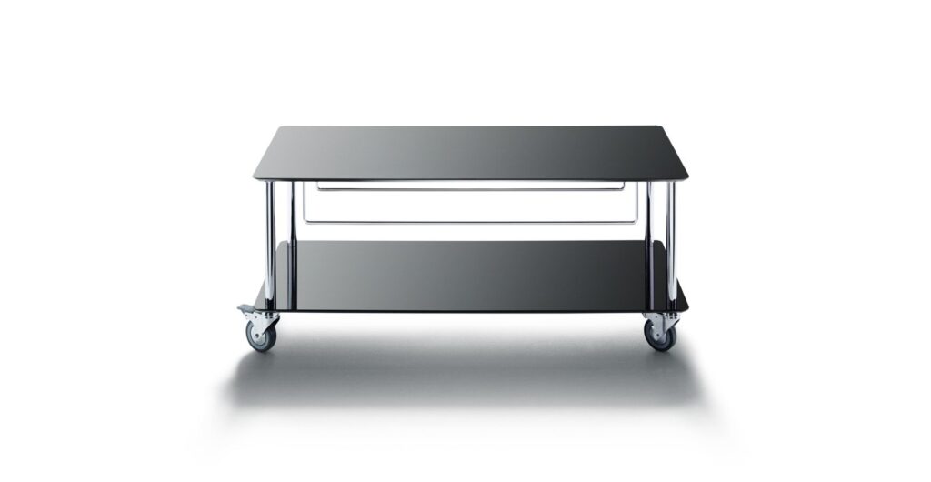 Carrito para la televisión, se coloca fácilmente en cualquier lugar de la sala gracias a sus ruedas. De diseño contemporáneo, estructura en acero cromado y estantes en laminados.
