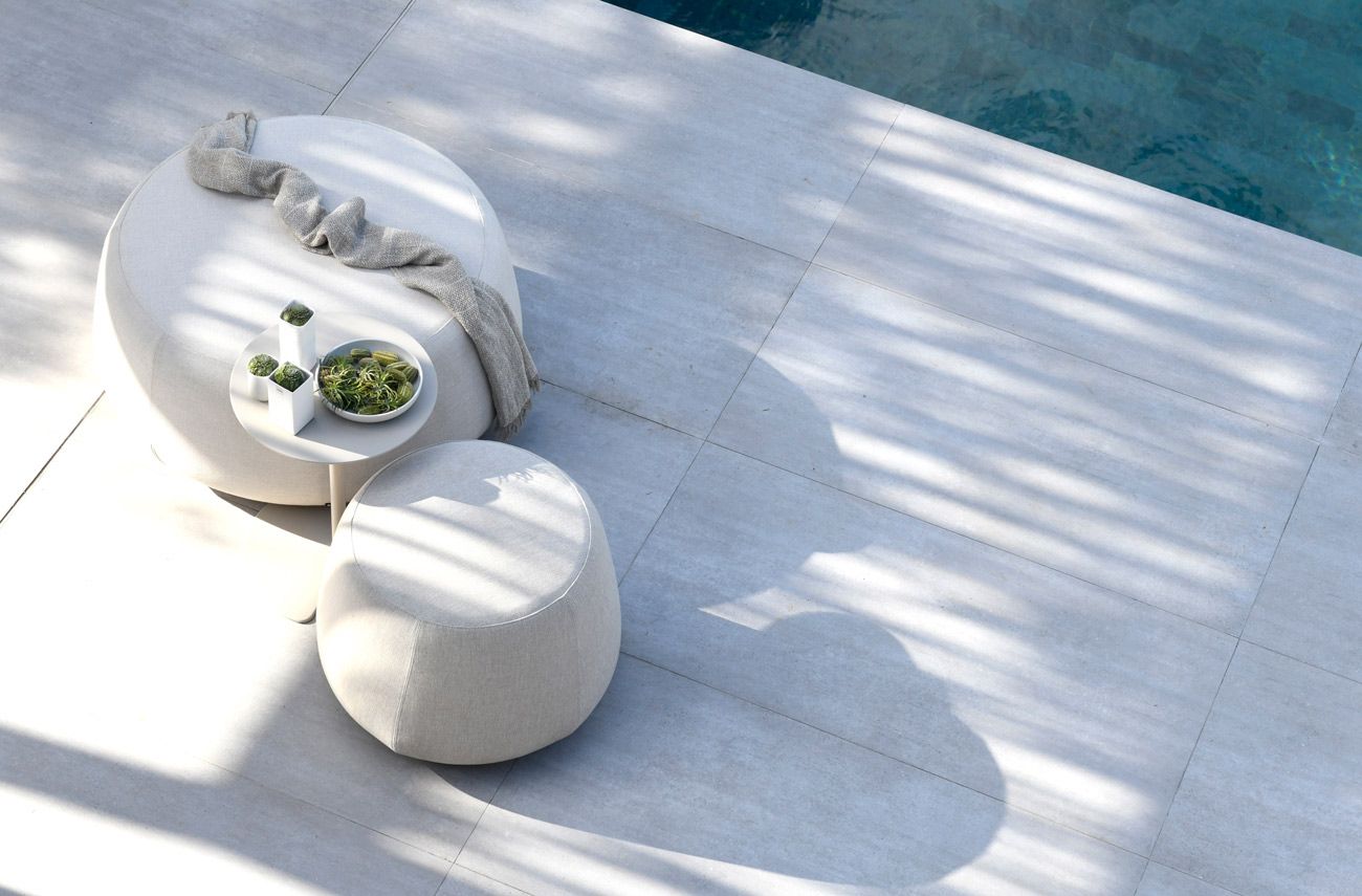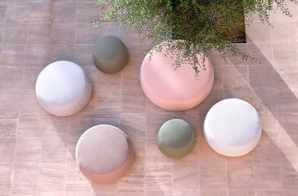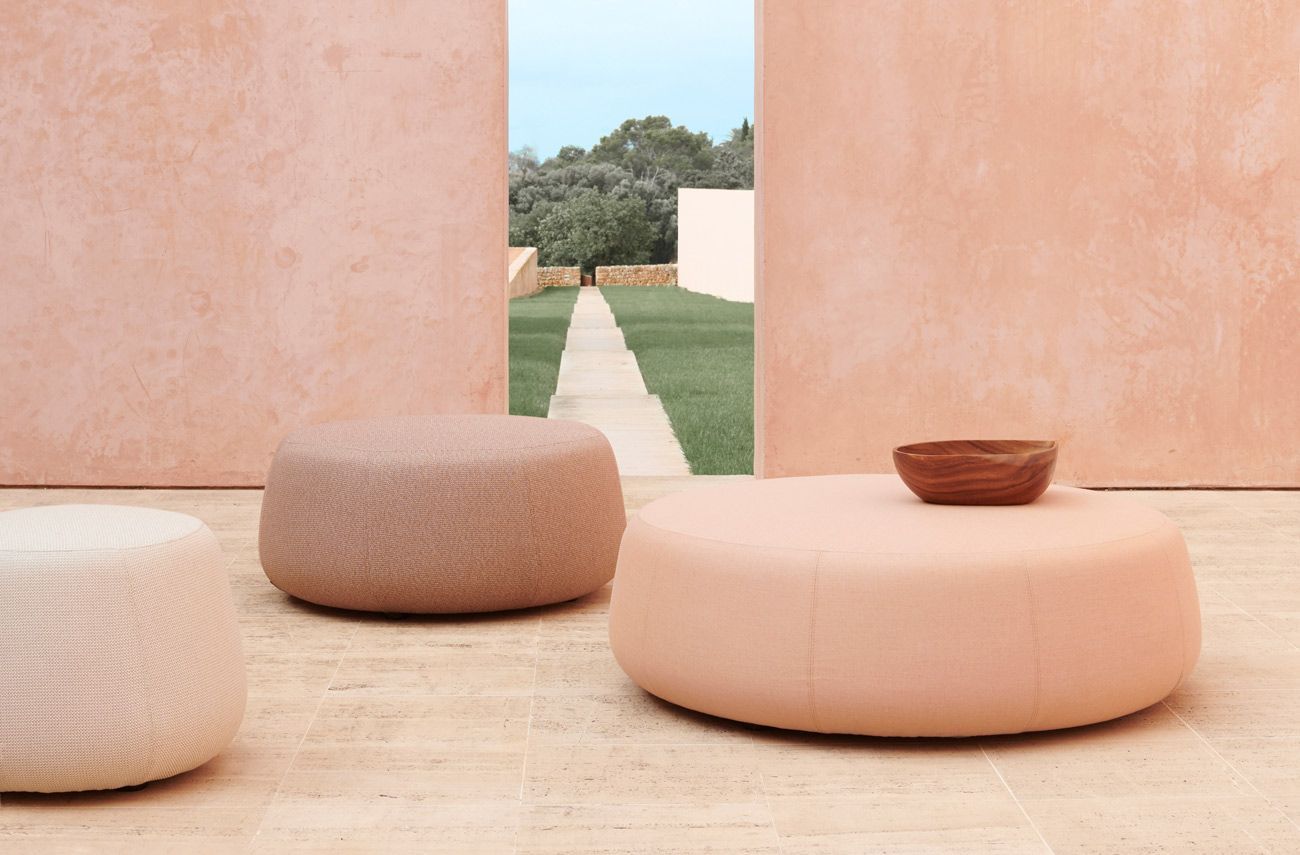 Pouf diseñado por Monica Armani, con una foram harmoniosa, están especialmente diseñados para su uso al aire libre, con una estructura drenante en EPS, y tapizados con espuma reticulada y un tejido para exteriores. La estructura está fabricada en multiplex resistente al agua, con lo que se obtiene una base sólida, y, gracias a sus tres patas invisibles, estos pufs parecen flotar en el aire. Disponibles en tres tamaños.