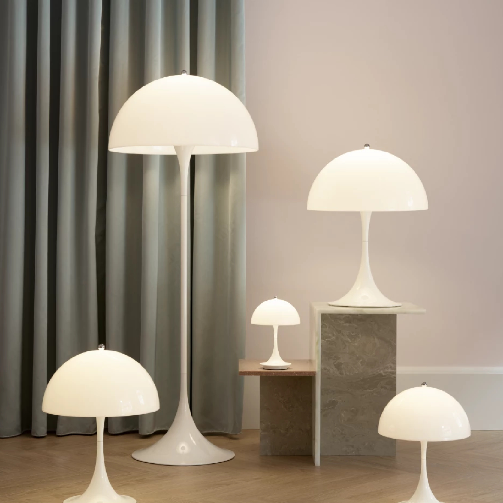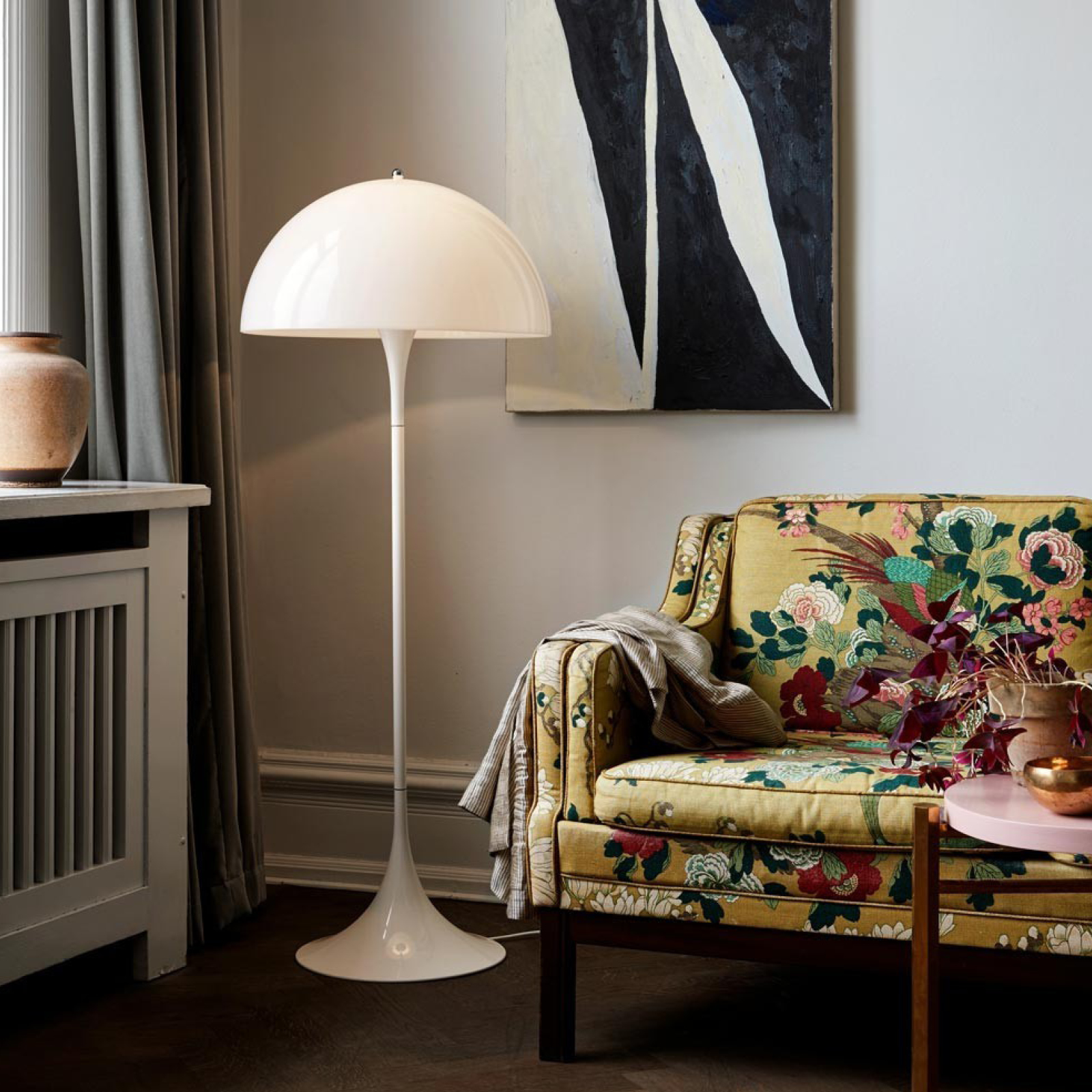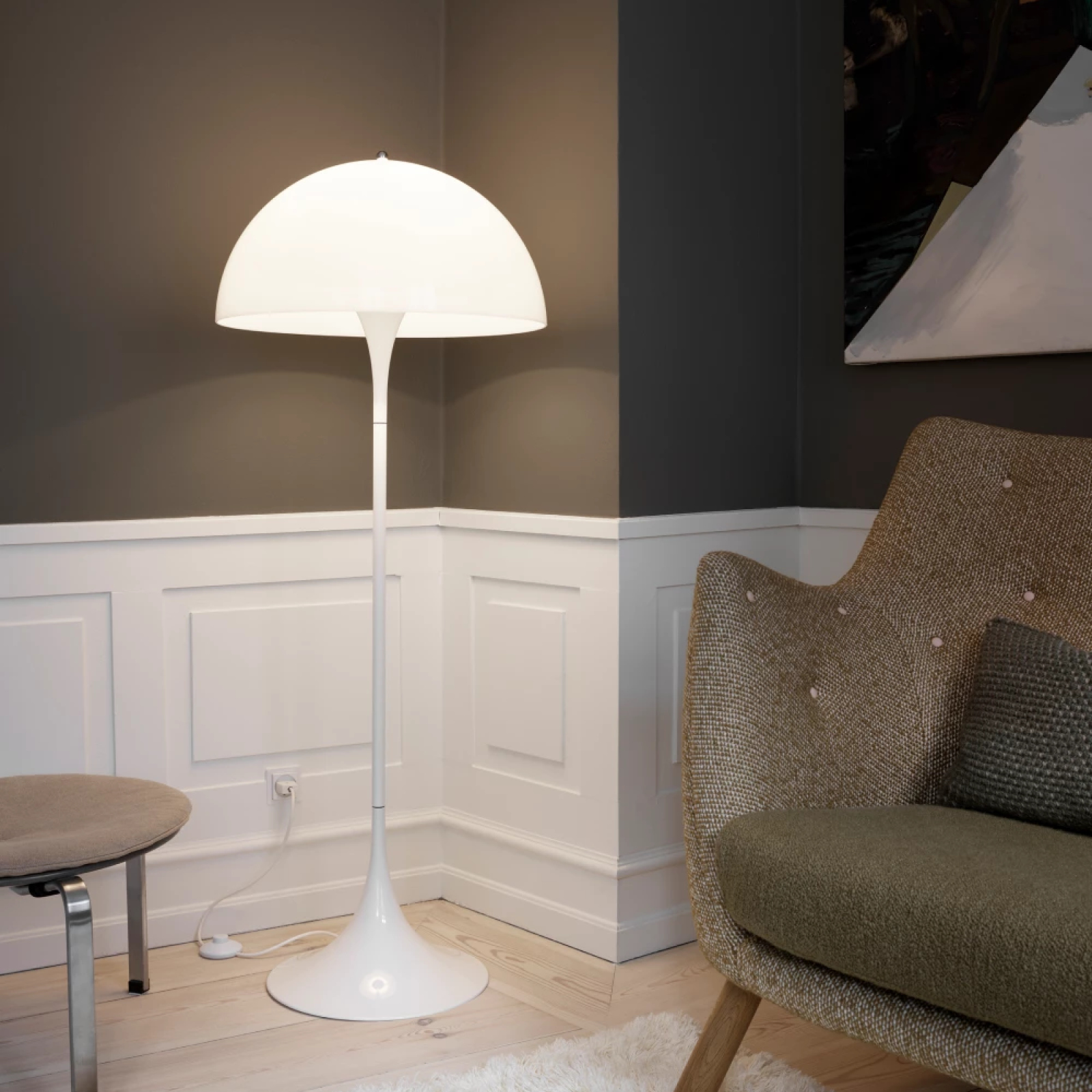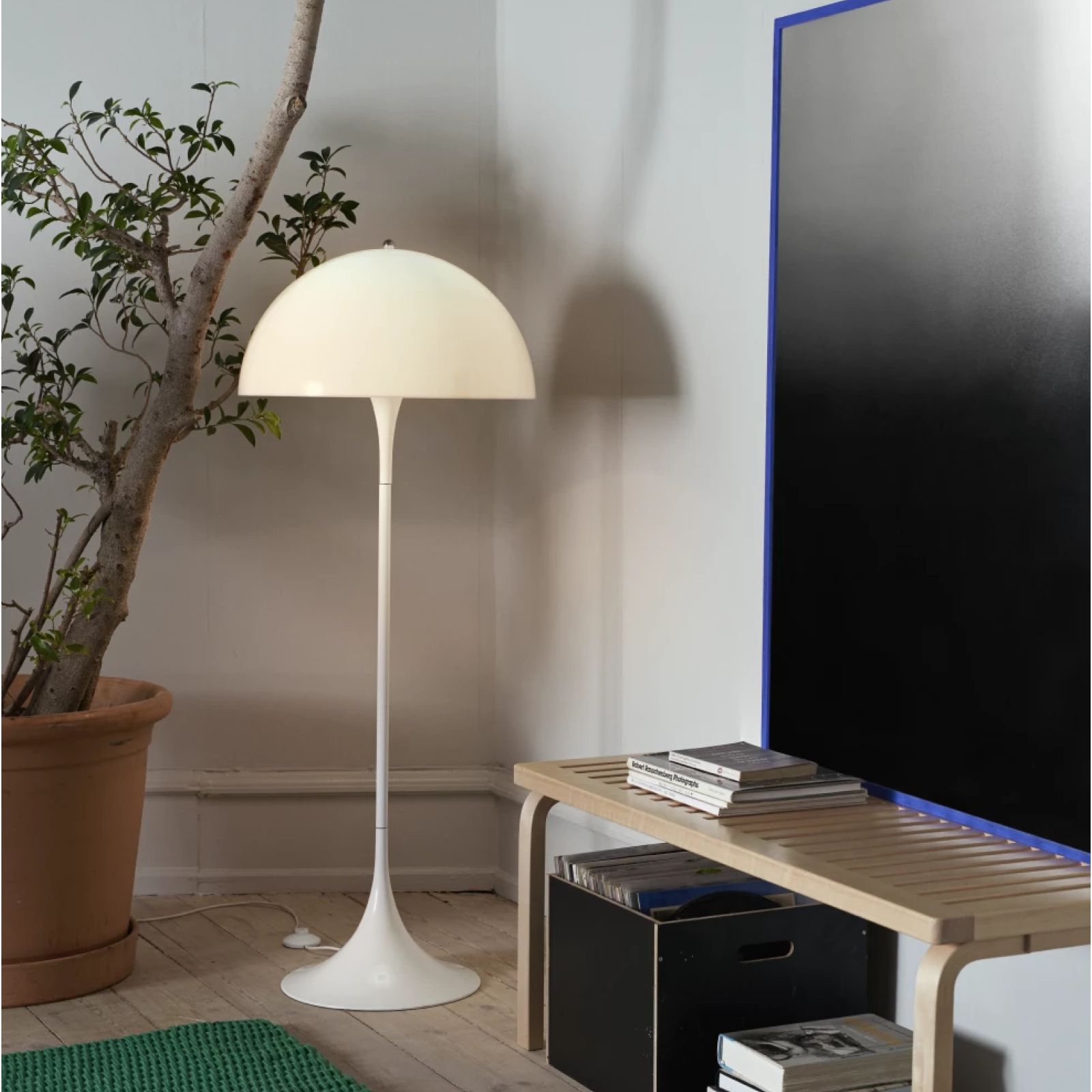 Lámpara de Pie. Es uno de los diseños más emblemáticos de su diseñador, Verner Panton. Su diseño quería que la luz fuera reflajada tanto por la pantalla como por el pie. Creando así una luz ambiental muy suave y difusa.