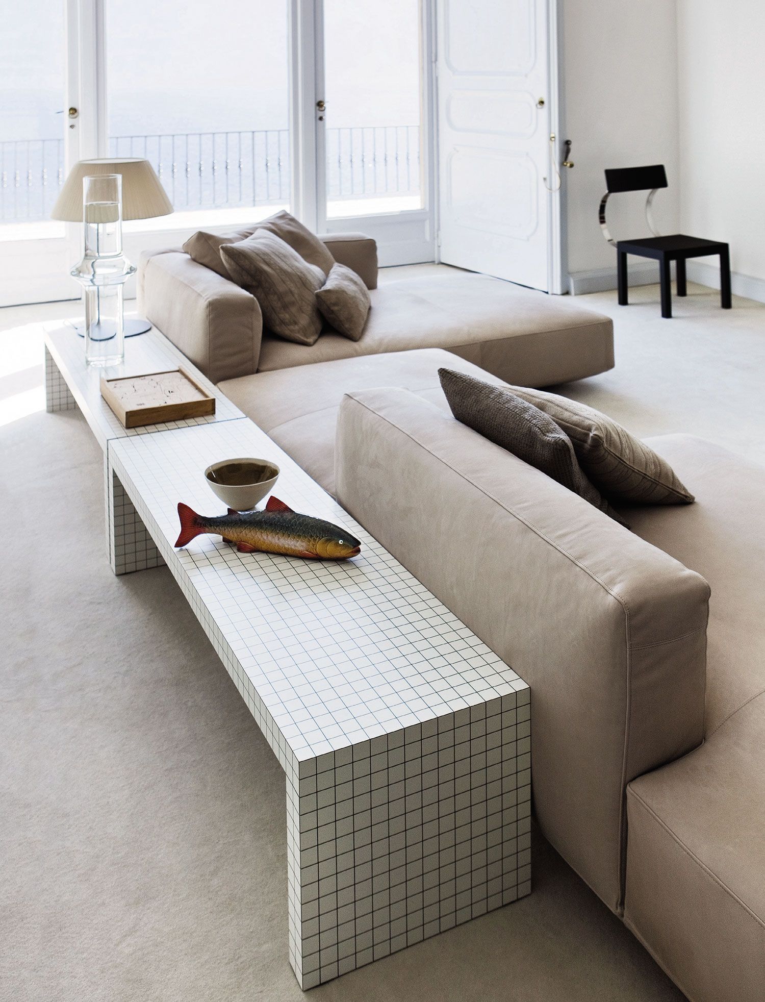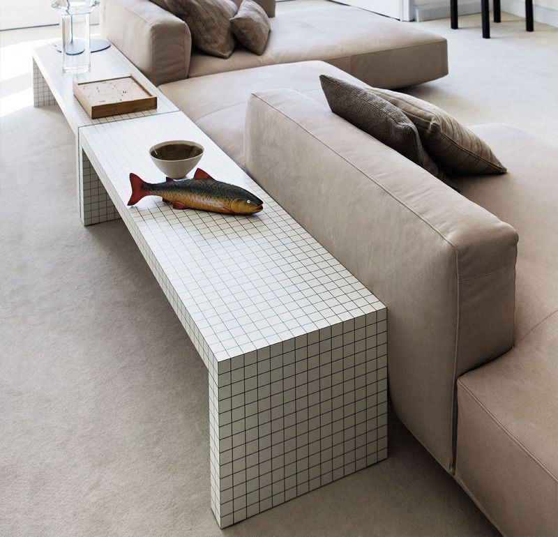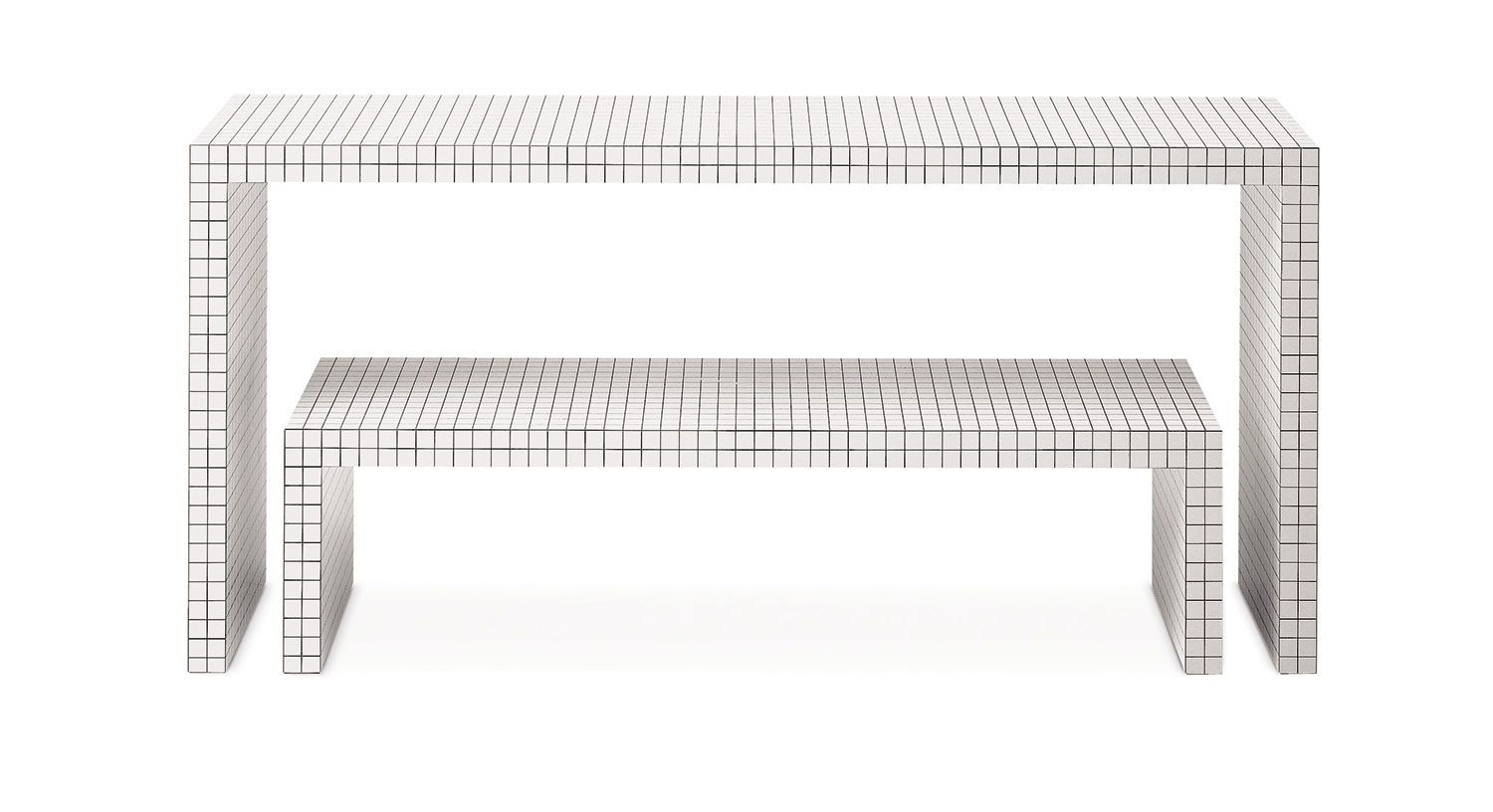 Banco diseñado por Superstudio, muy versátil, útil como banco, mesa de apoyo en dormitorios y estudios. Estructura de nido de abeja recubierto con laminado plástico blanco, impreso digitalmente con cuadrados negros a 3 cm de distancia.