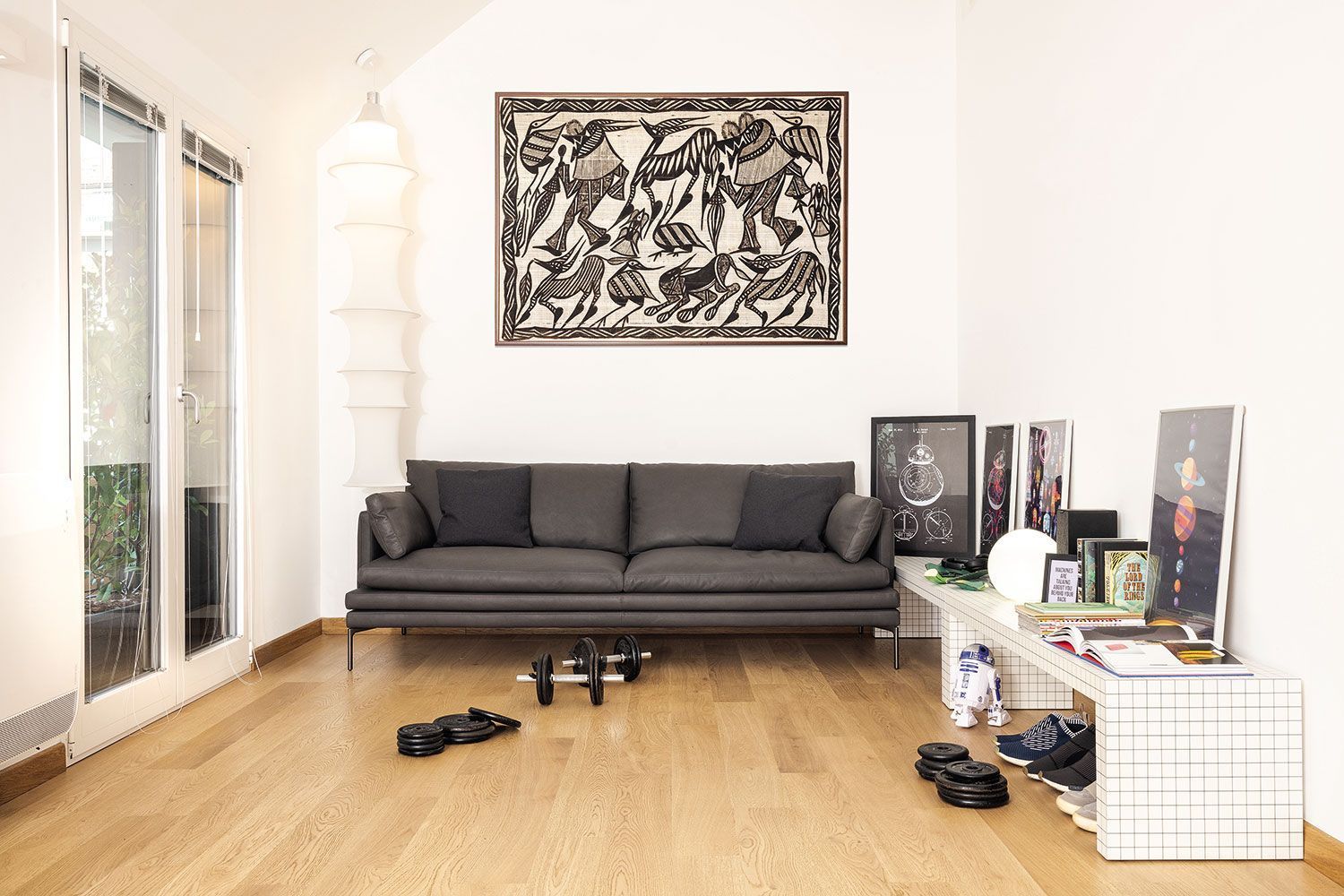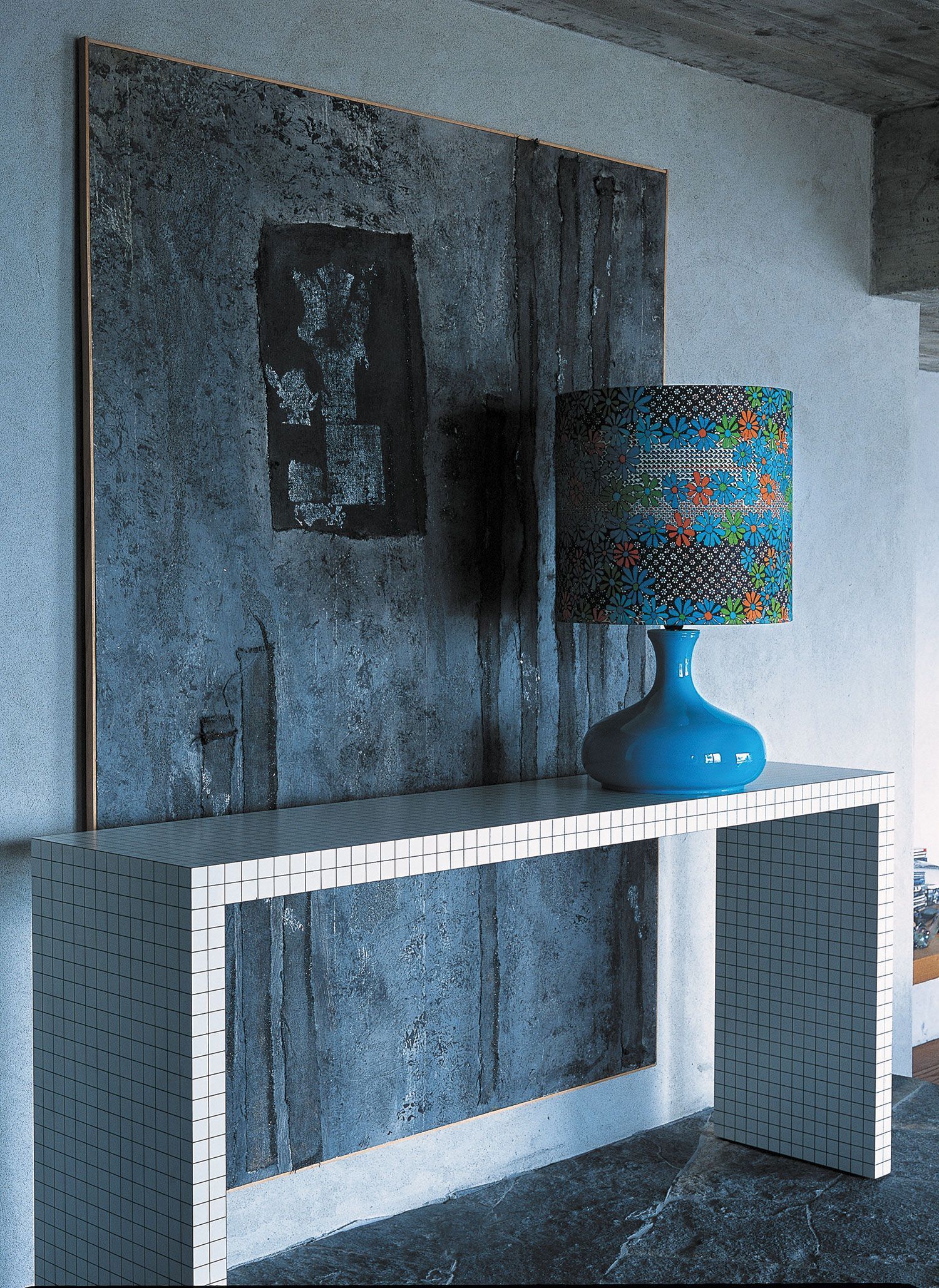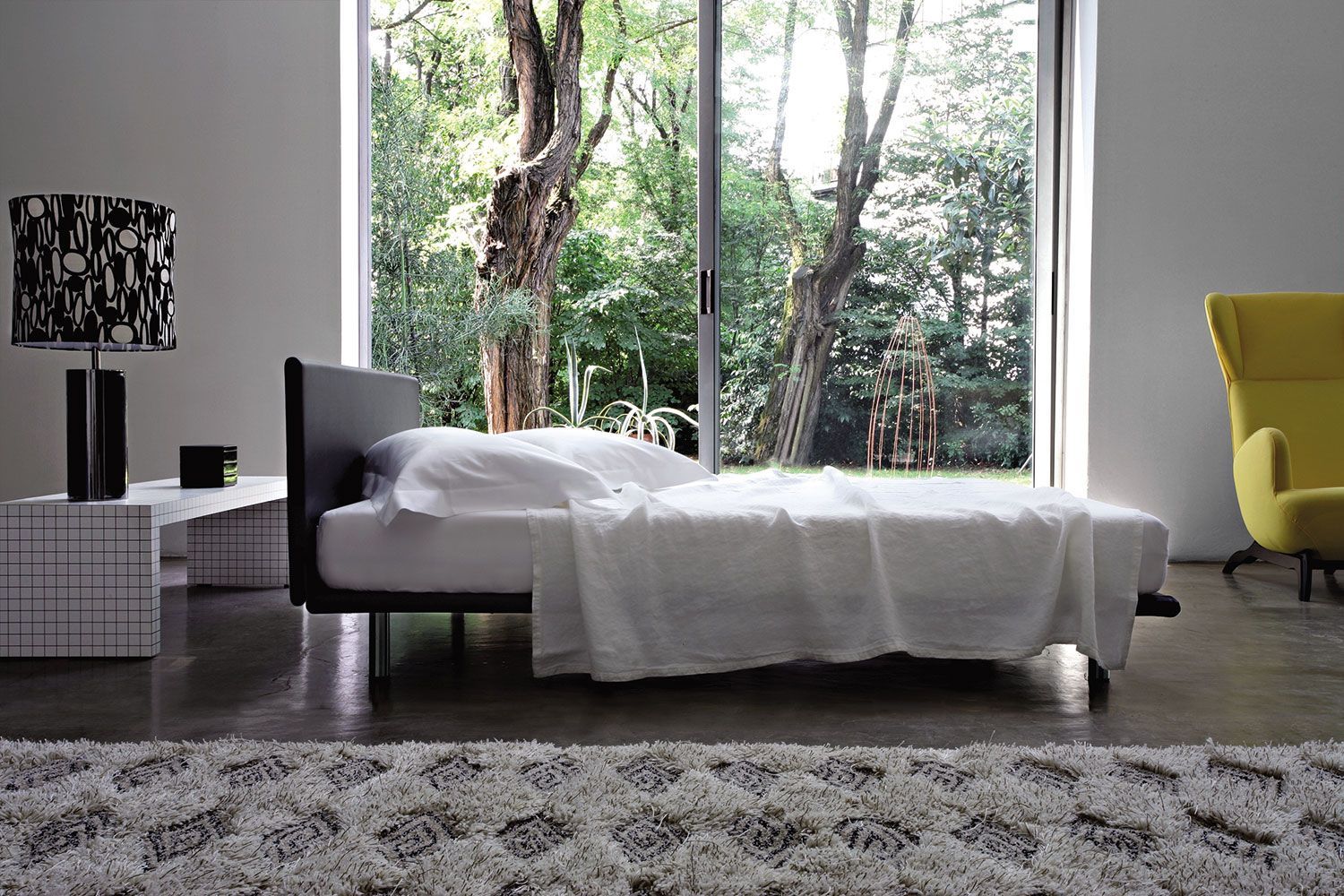 Banco diseñado por Superstudio, muy versátil, útil como banco, mesa de apoyo en dormitorios y estudios. Estructura de nido de abeja recubierto con laminado plástico blanco, impreso digitalmente con cuadrados negros a 3 cm de distancia.