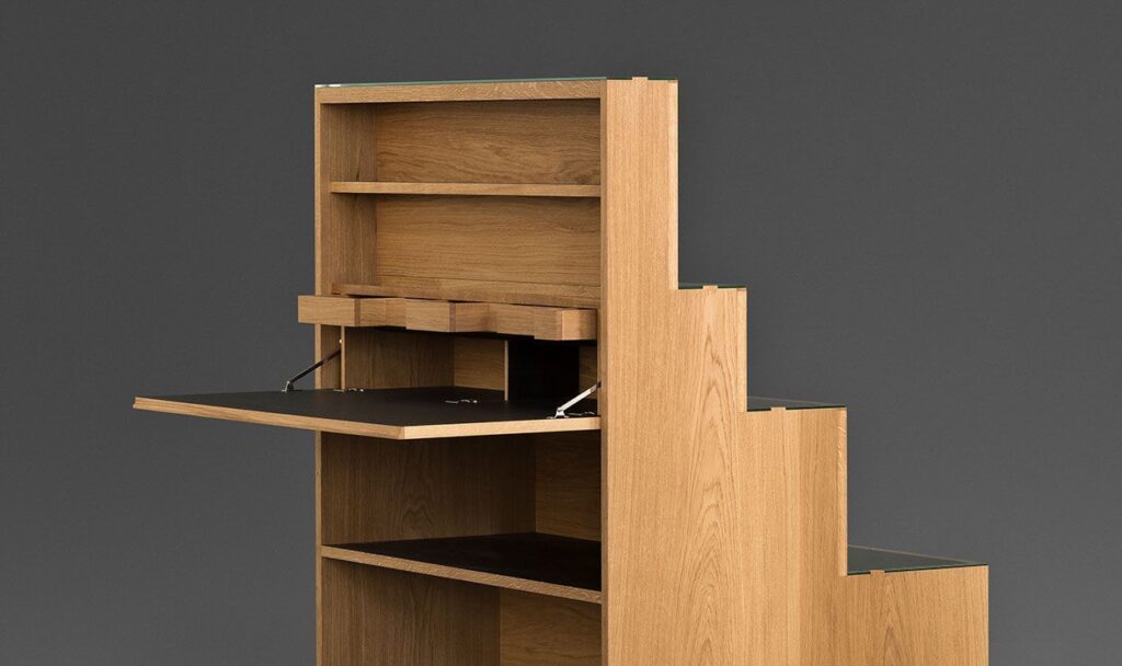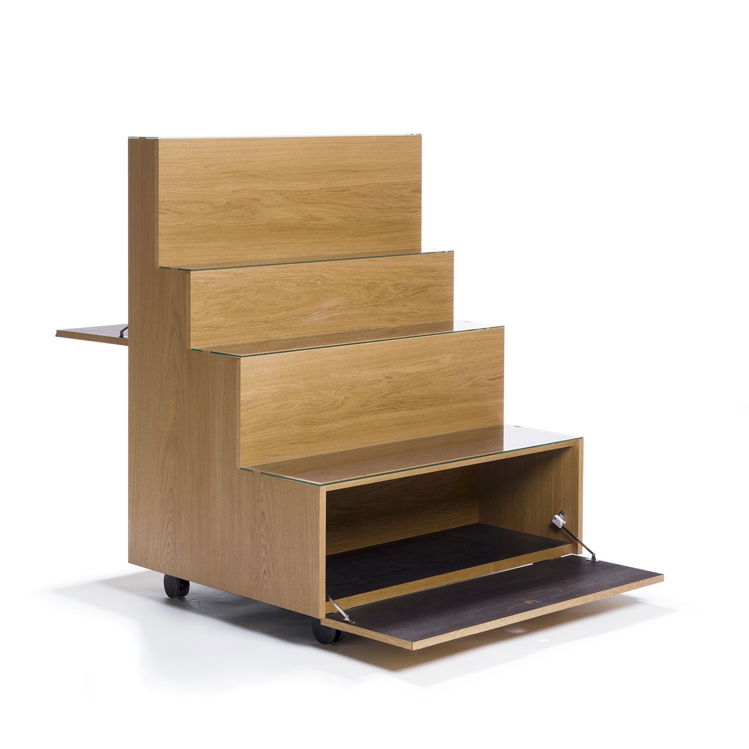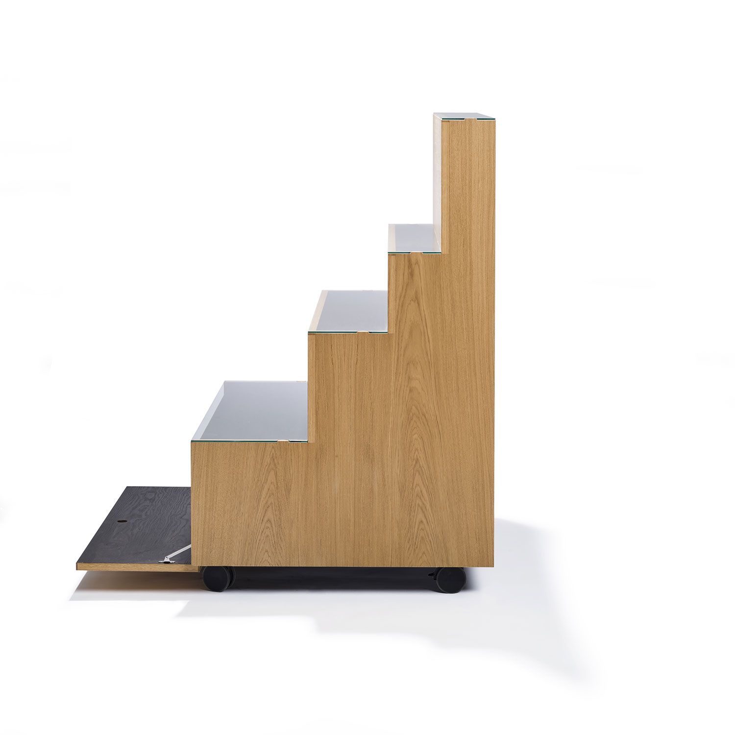 Mueble multifuncional, formado por 4 peldaños, los cuales sirven de estantería. En el peldaño inferior encontramos un compartimento con puerta abatible. En el lado opuesto encontramos estantes, un sobre abatible que hace de escritorio y unos pequeños cajones para complementar el escritorio. Dispone de mobilidad gracias a sus 4 ruedas.