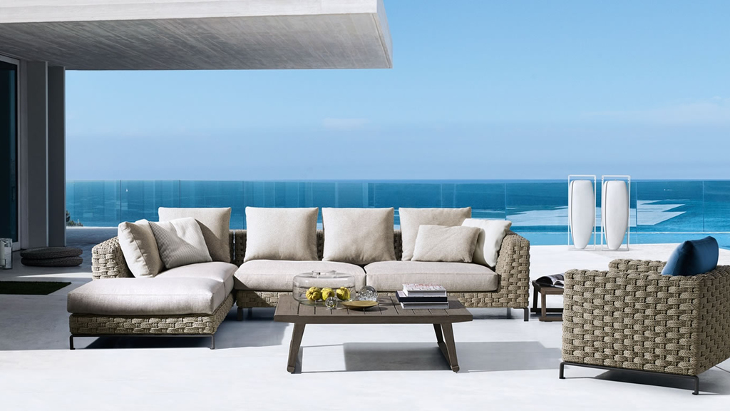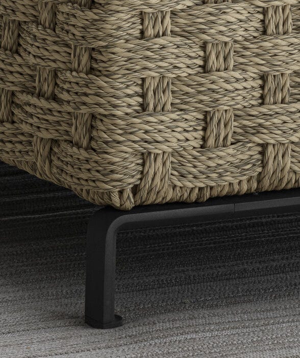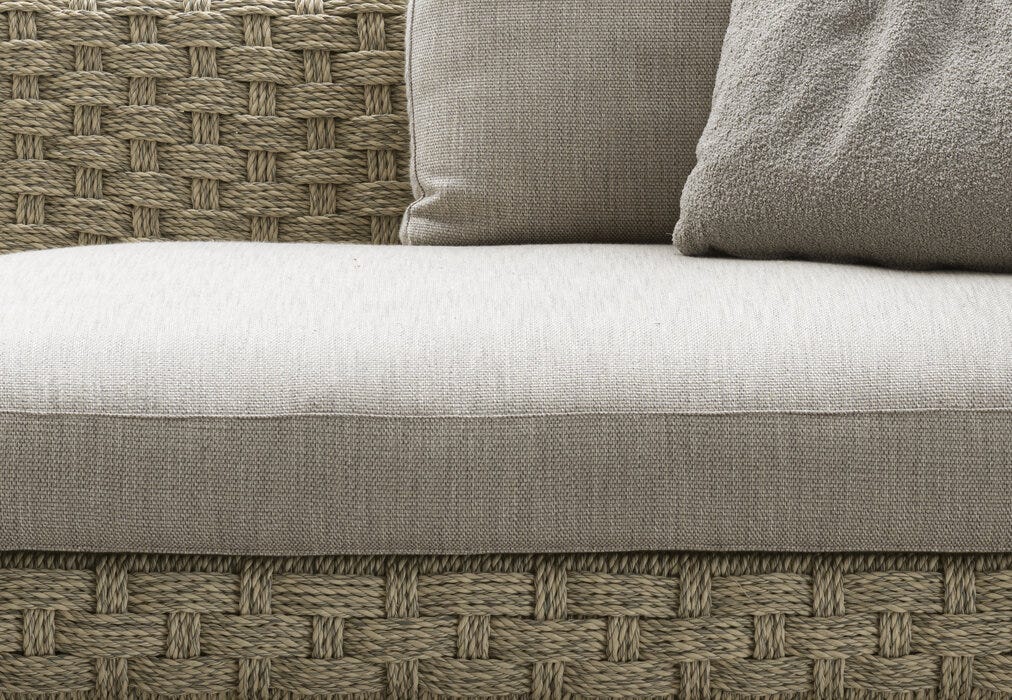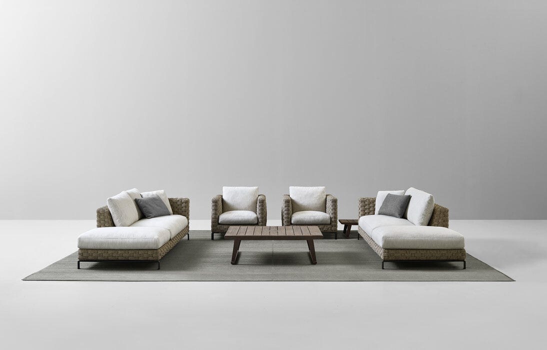 Ray Outdoor Natural es una familia de sofás y sillas de exterior inspirada en la colección de interior Ray y que presenta un patrón de cuerdas entrelazadas que recuerda al cáñamo de Manila. Una solución en perfecta armonía con la naturaleza, creada con textilene para que sea perfecta para uso en exteriores, está disponible tanto con pies en extrusión de aluminio como en una versión con estructura base de madera de teca. La colección incluye sofás en dos profundidades, elementos modulares y un sillón.