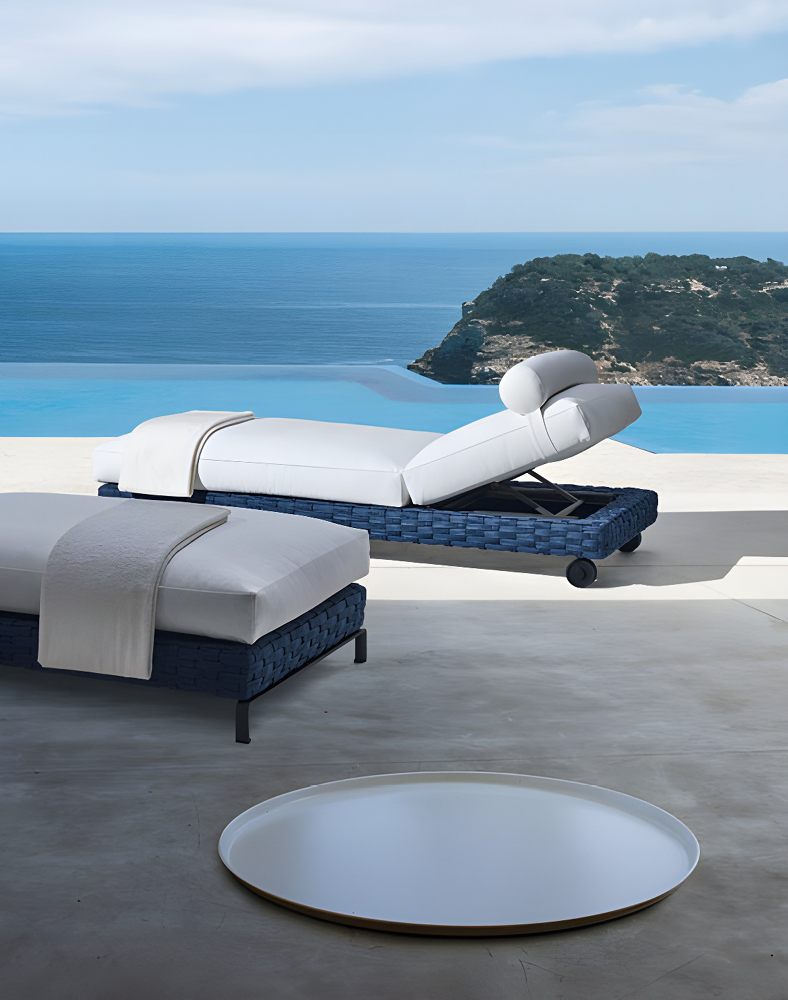 La tumbona Ray Outdoor Fabric complementa la colección de sillas de exterior del mismo nombre, caracterizadas por un patrón de cintas entrelazadas, creadas con fibra de polipropileno. La variada gama de colores es especialmente adecuada para ambientes exteriores. La tumbona viene con pies en extrusión de aluminio y con ruedas que facilitan su movimiento. El respaldo se puede ajustar en diferentes posiciones para mayor comodidad.