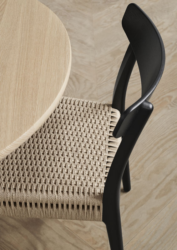 Silla con estructura de madera y asiento en doble tejido de papercord. Puede parecer sencilla a primera vista, incorpora muchos detalles finos y sofisticados, con todos los componentes estéticos y estructurales intactos.