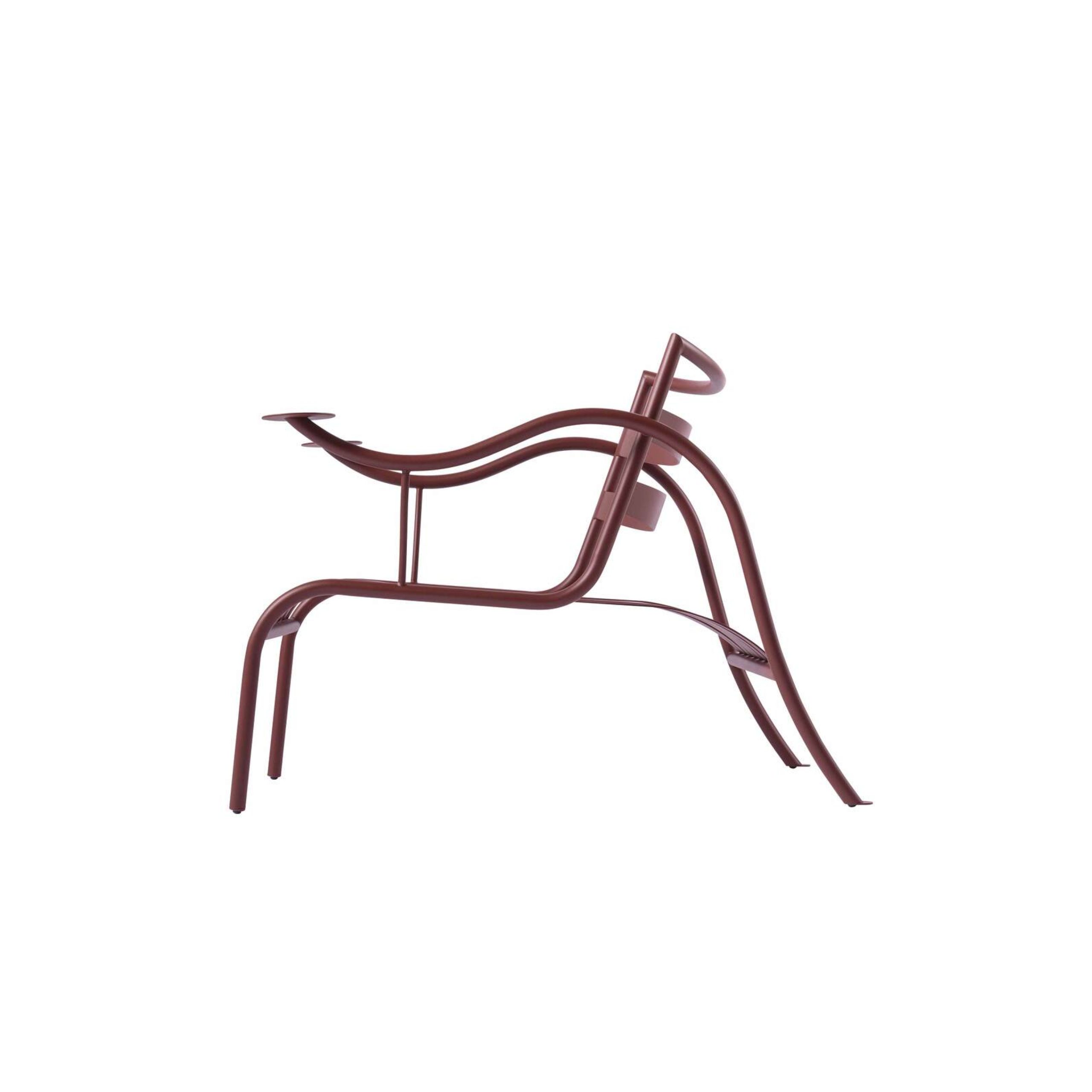 La silla del Thinking Man’s es de metal barnizado y está disponible en blanco puro, azul violeta y rojo óxido. La versión en rojo óxido también se presenta en una edición especial adornada con una inscripción que resalta el radio de curvatura de la estructura metálica.