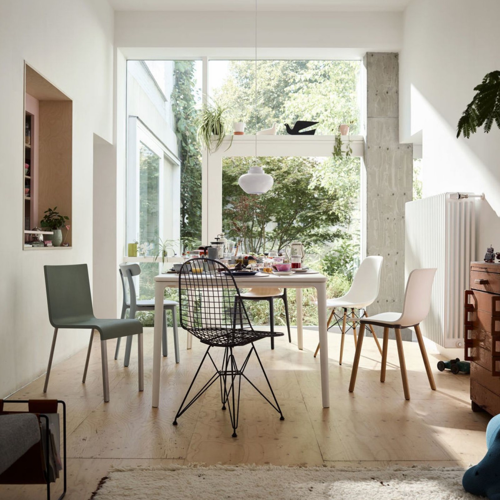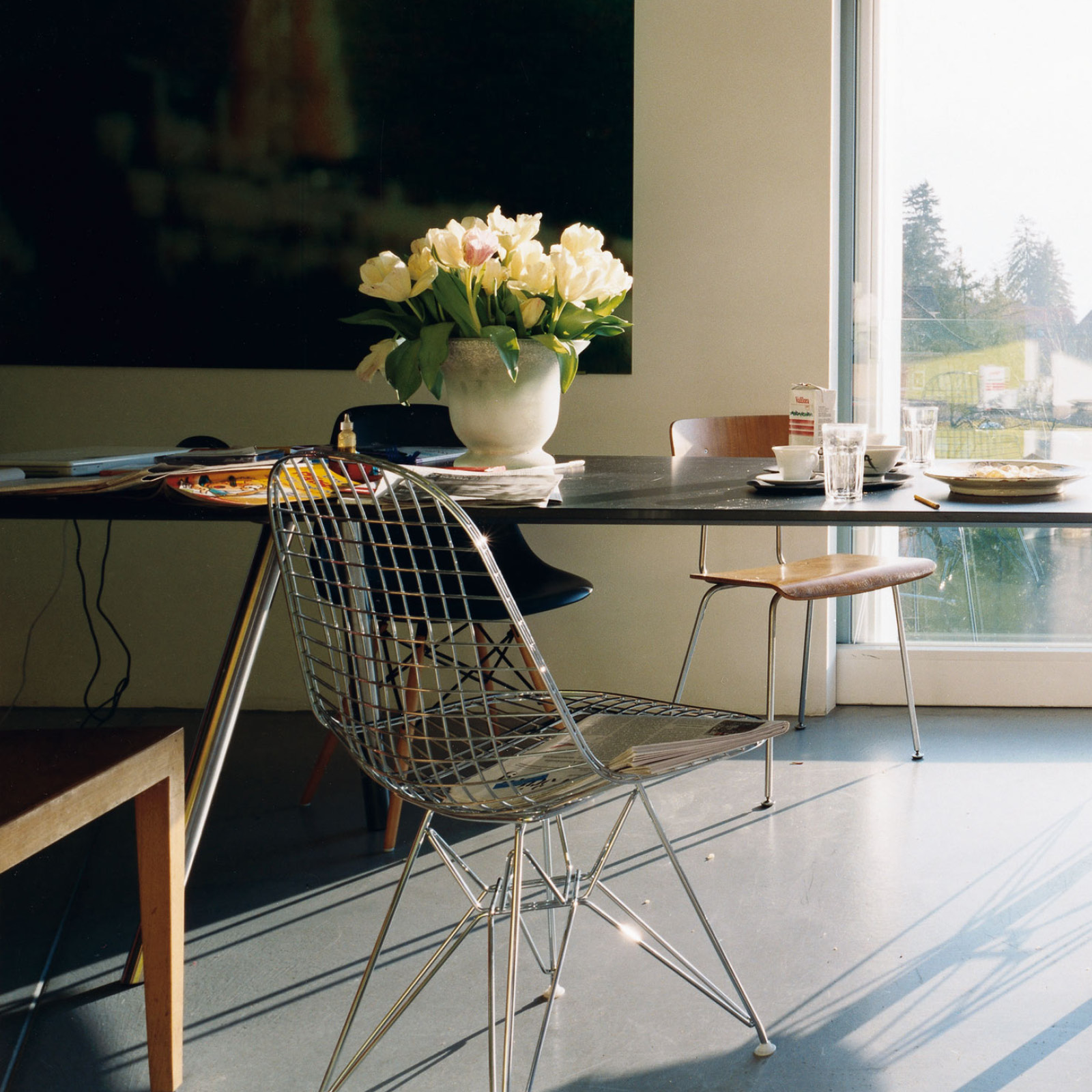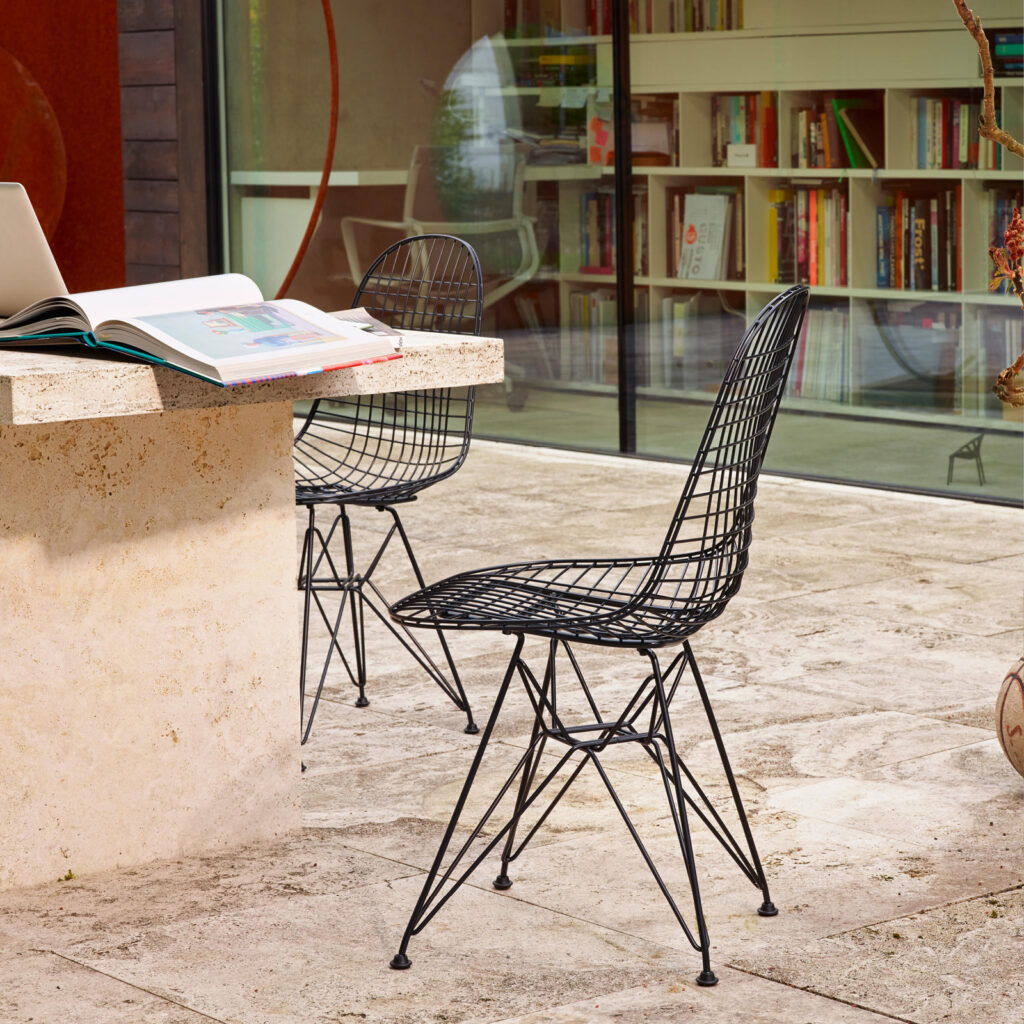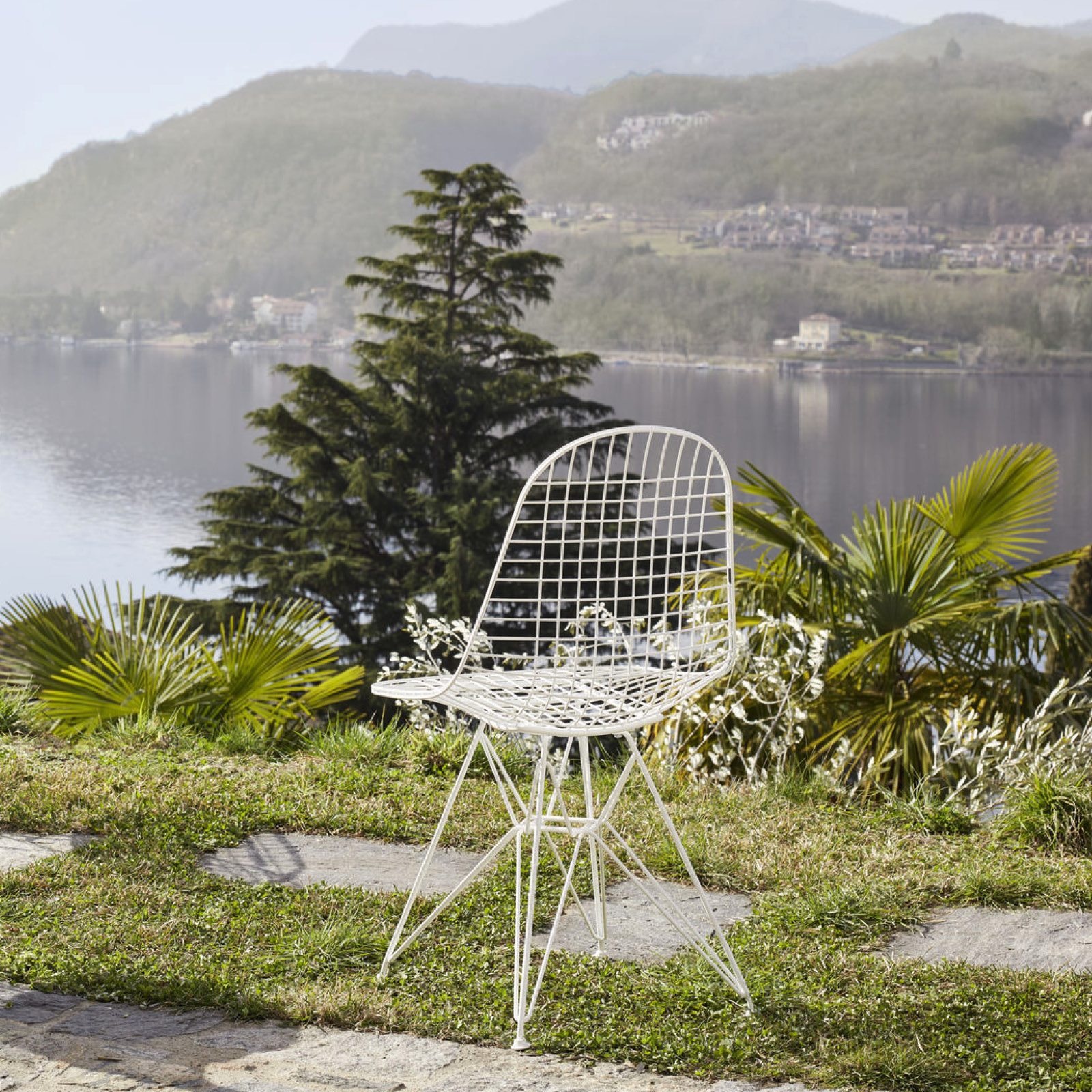 Diseñada por Charles y Ray Eames, la carcasa de asiento de la Wire Chair imita la forma de la Eames Plastic Side Chair. Montada sobre la legendaria base de «torre Eiffel», la DKR combina transparencia y funcionalidad. La versión con acabado con revestimiento en polvo también es adecuada para su uso en jardines y terrazas. La silla DKR está disponible opcionalmente con un cojín de asiento o con un dos piezas de asiento y respaldo tapizados en tela o cuero.