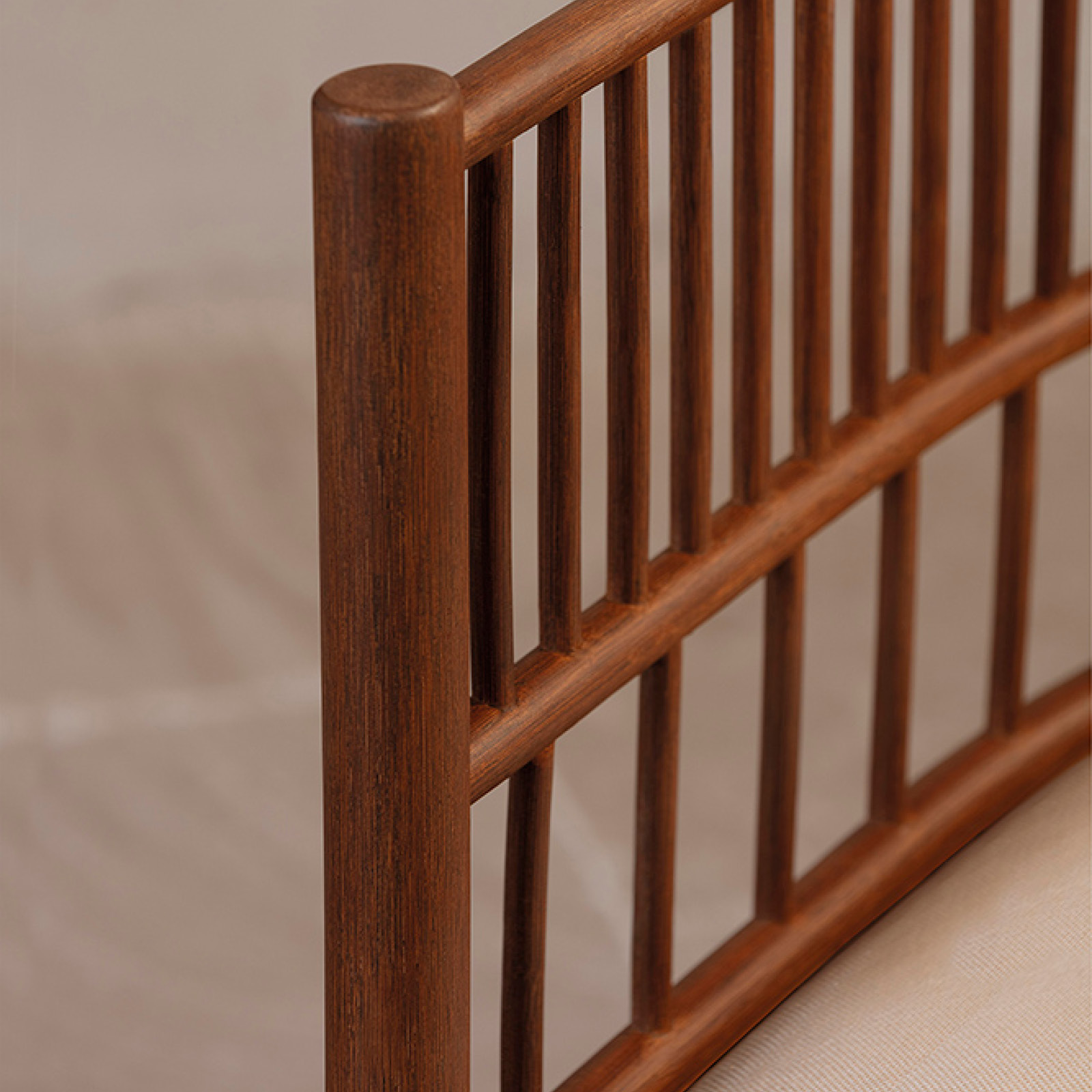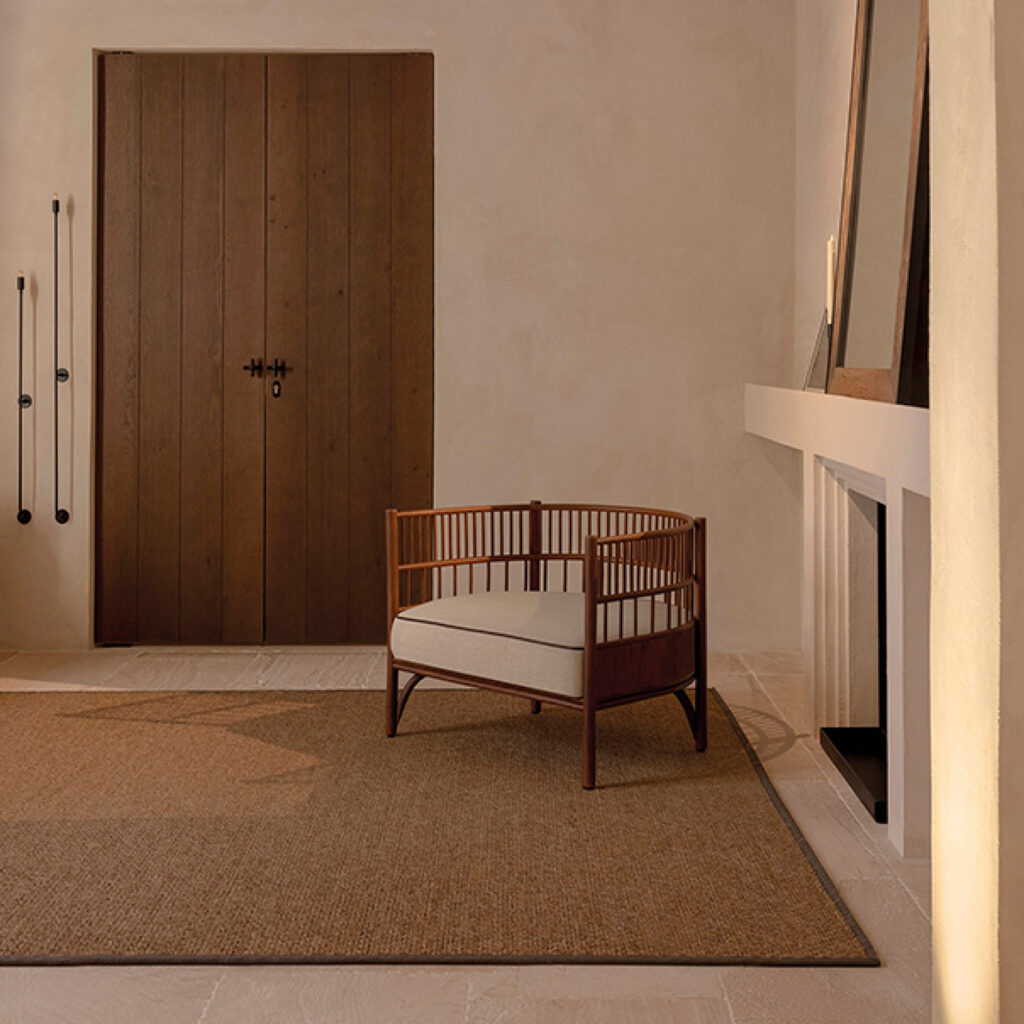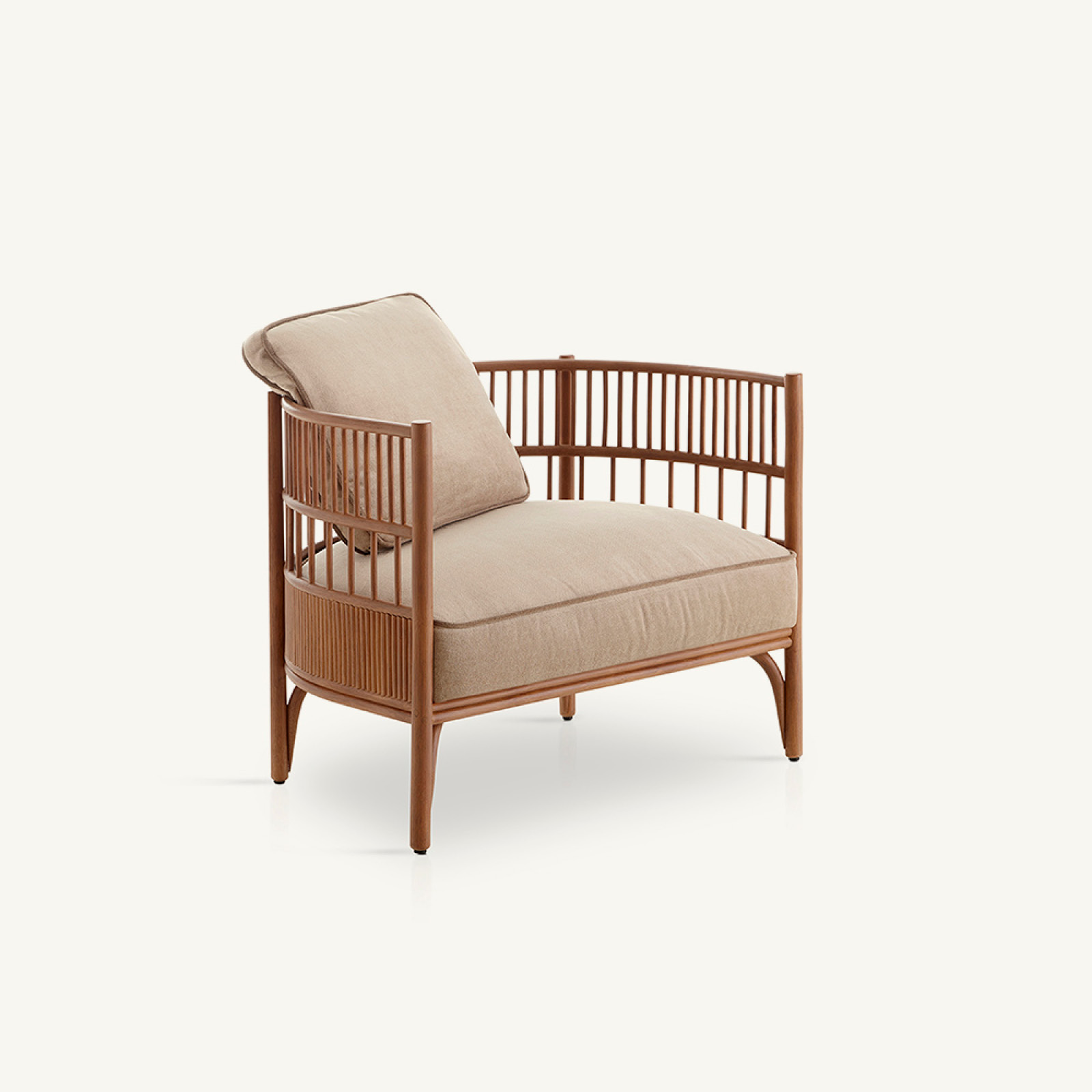 Sillón con estructura en rattan natural pelado y tintado de 32 mm de calibre. Respaldo y laterales fabricados en rattan natural pelado y tintado de 10 mm de calibre. Acabado con recubrimiento en tres fases (tinte, fondo y acabado) con filtros UV que lo hacen altamente resistente a la radiación solar. Los acabados utilizados son en base al agua. Posibilidad de personalización mediante una amplia variedad de tejidos. Tacos protectores.