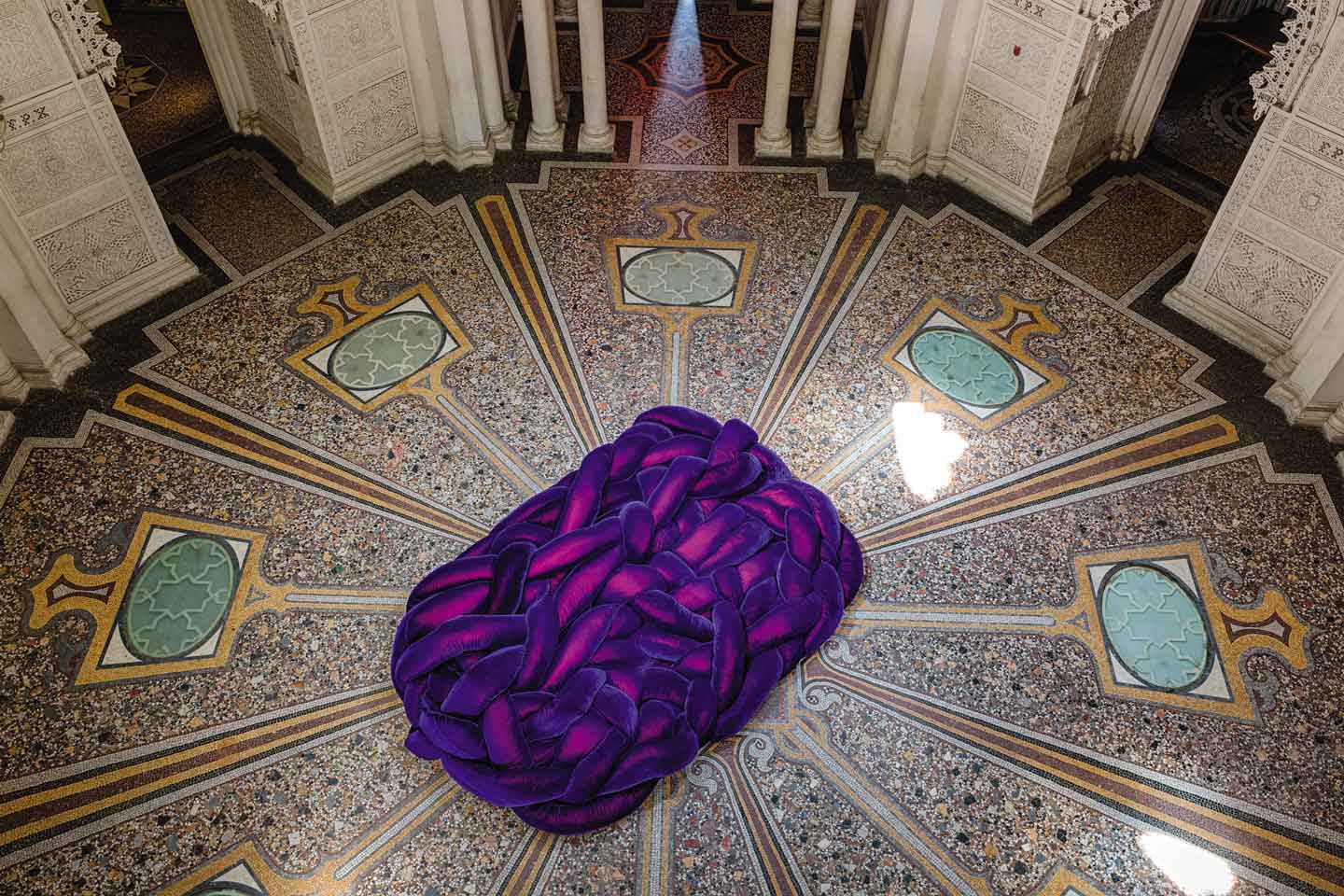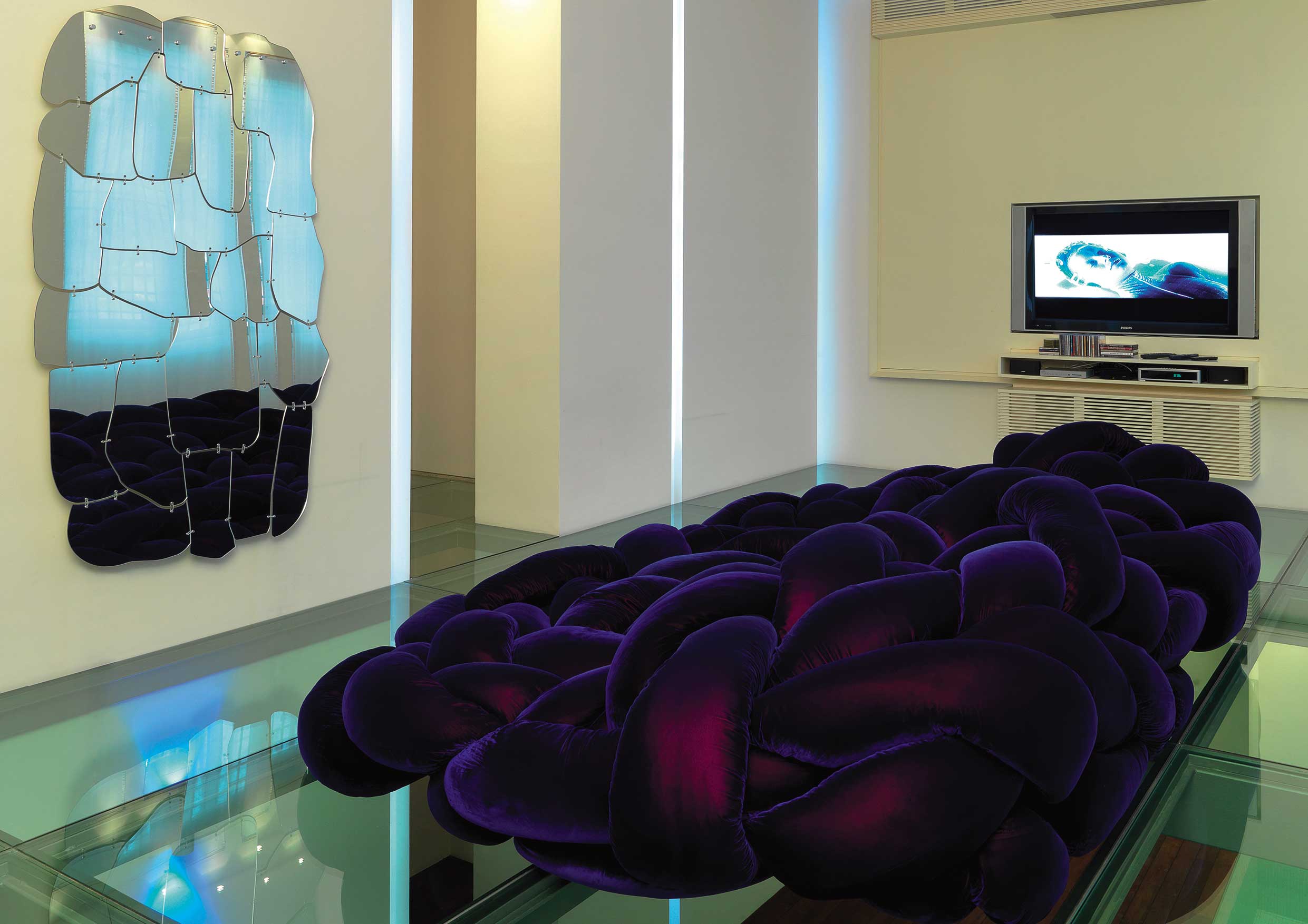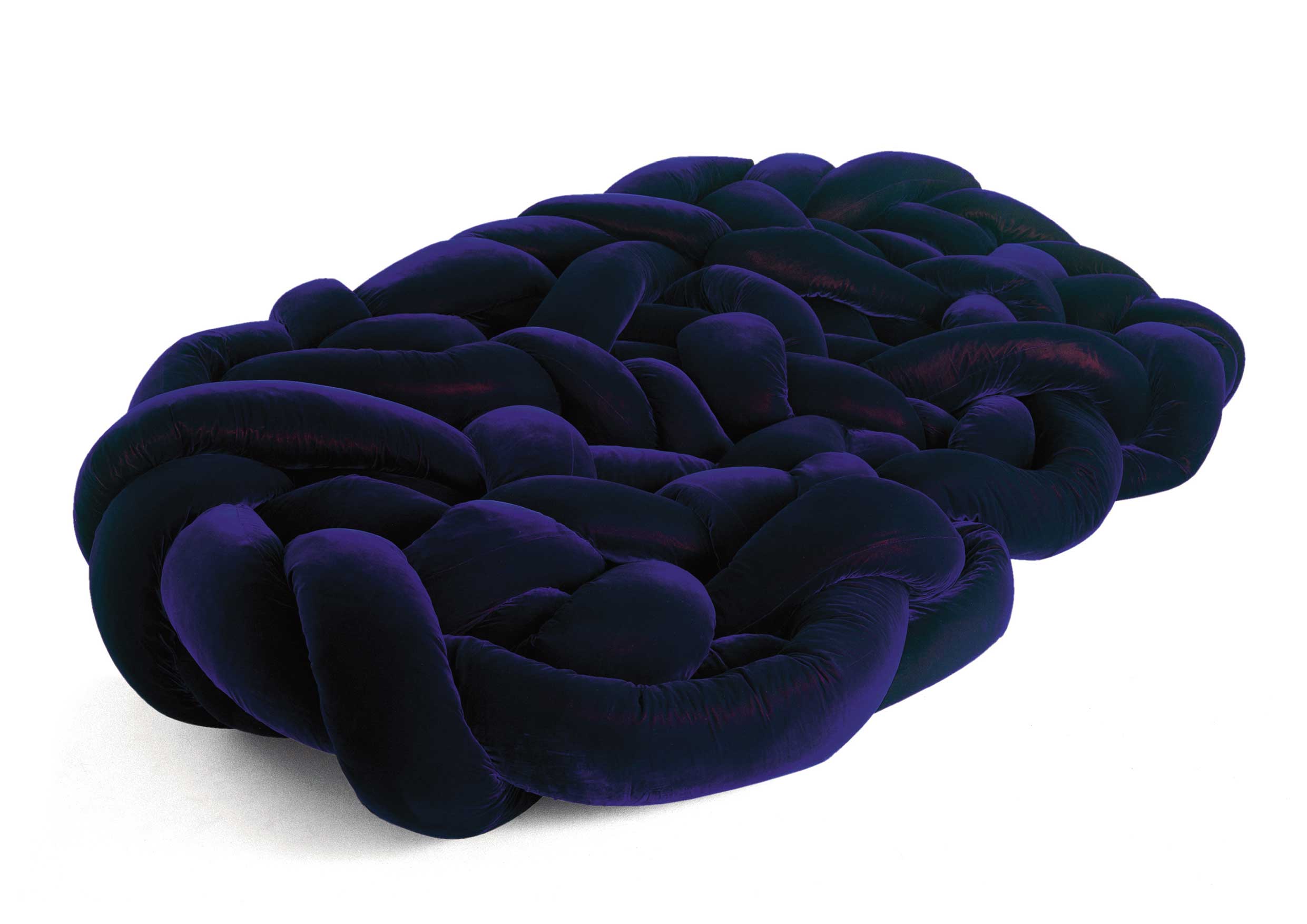 Sofá escultura. Nido de tejido hecho a mano, 120 m de tejido tubular relleno de poliuretano elástico y transpirable con un toque de plumón, revestido en tercipelo que aporta una suavidad y una luminosidad peculiar.