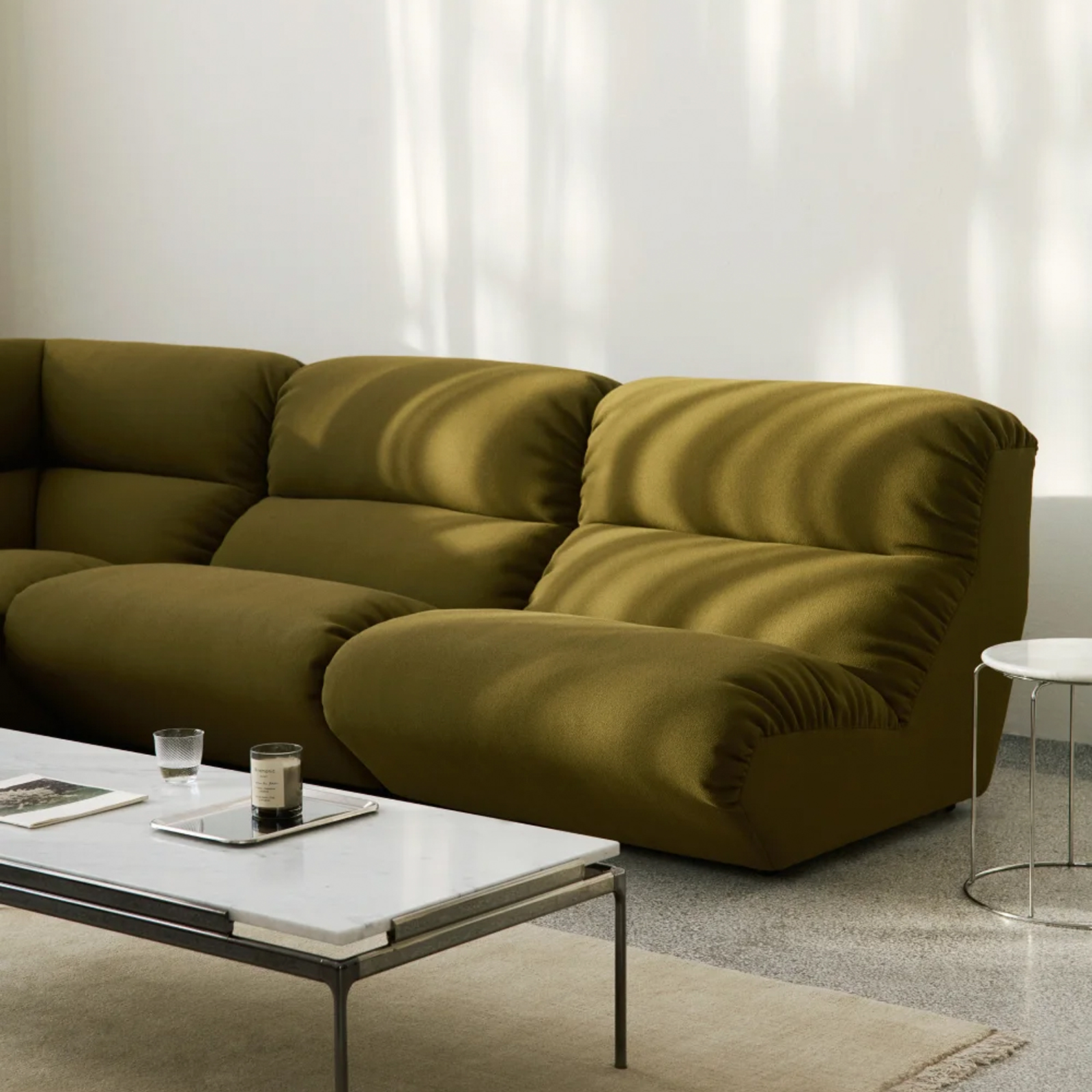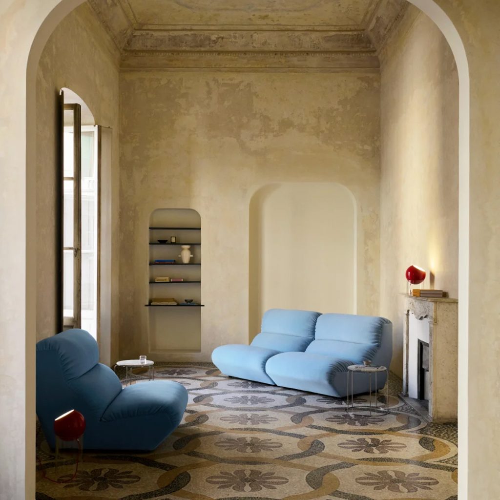 Reflejando una dualidad entre alto confort y una forma contenida, las proporciones generosas y la priorización del acolchado y de una tapicería envolvente en los módulos Hi Lo dan lugar a un sofá modular que envuelve al usuario.