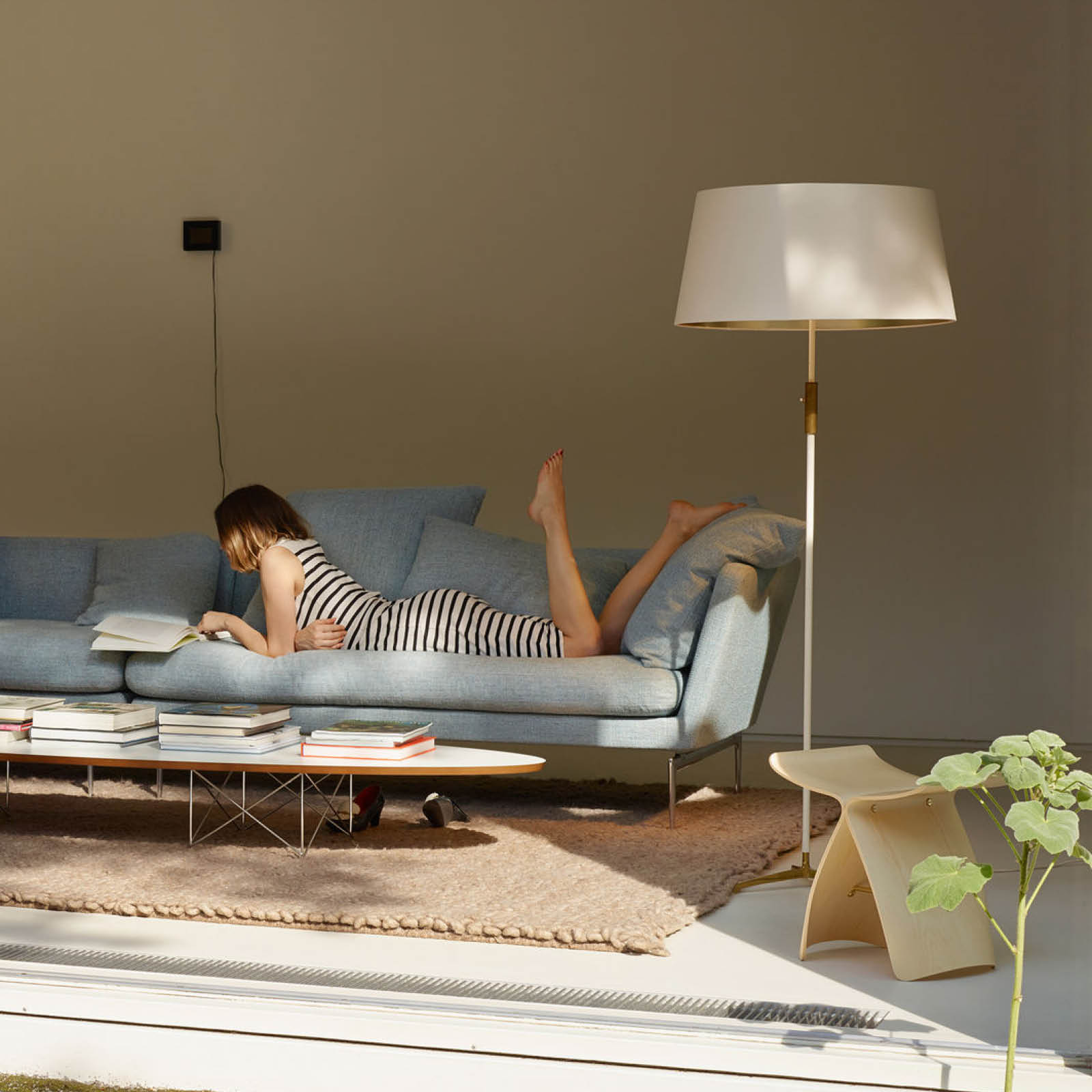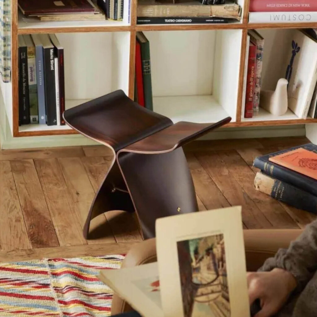 El icónico Butterfly Stool del diseñador japonés Sori Yanagi es una pieza clásica que combina de forma magistral las formas orientales con la técnica del conformado de madera contrachapada, desarrollada por Charles y Ray Eames. La silueta suavemente arqueada de las dos piezas del asiento recuerda las alas de una mariposa en el momento –perpetuo– de empezar a volar. El taburete es de madera de arce o palisandro.