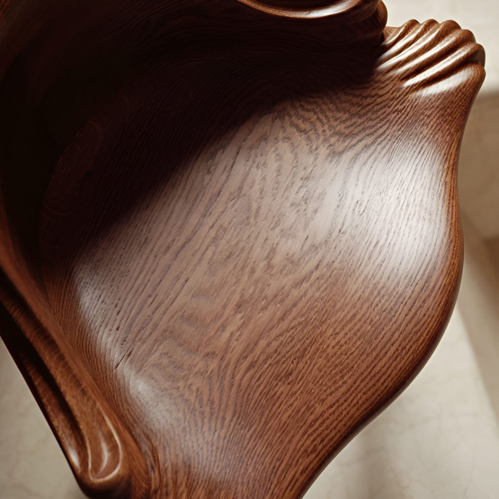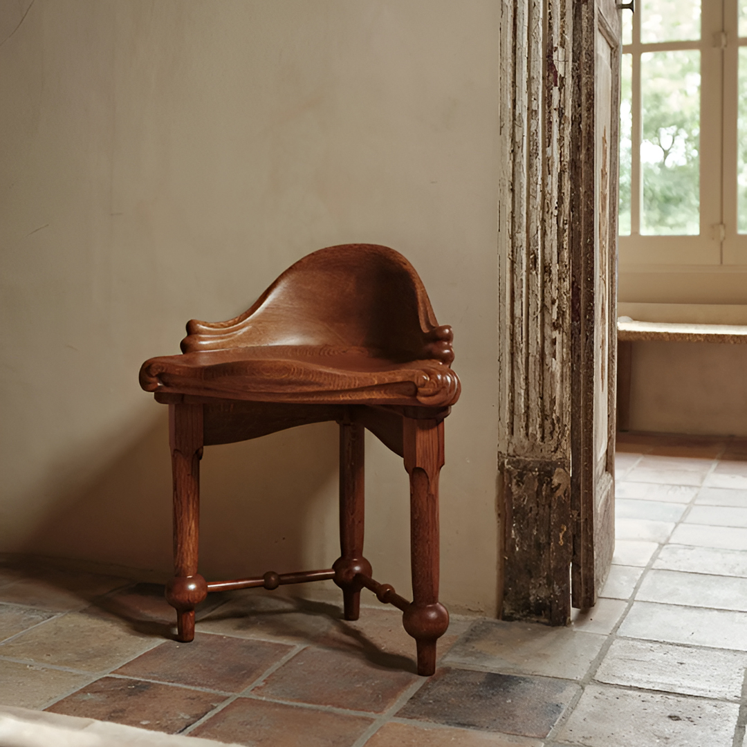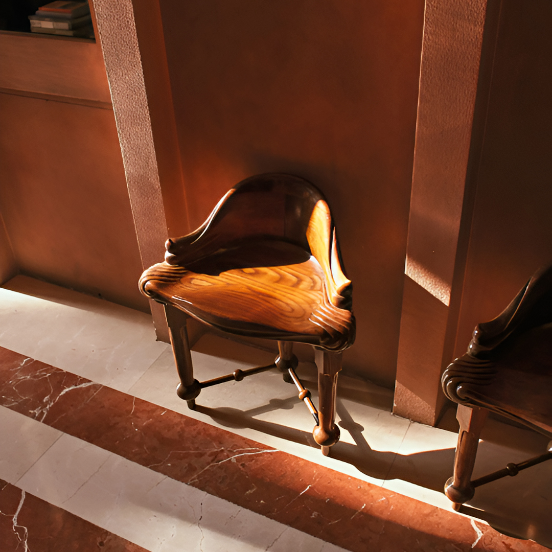 La estructura simétrica se apoya sobre tres patas y encaja fácilmente en una esquina, mientras que la masa oscura de la madera aporta una ligereza natural que refleja el estilo audaz, orgánico y excéntrico de Gaudí.