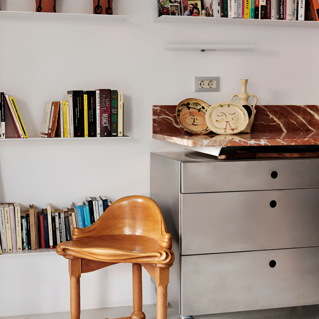 El taburete Calvet de Gaudí está bellamente diseñado, con una forma y una presencia únicas. Fue concebido junto con una colección de mobiliario para la Casa Calvet. Sus ricos contornos y la veta barnizada se curvan hasta un respaldo angulado, con elementos decorativos mínimos que permiten que la calidad de los materiales se exprese plenamente.
