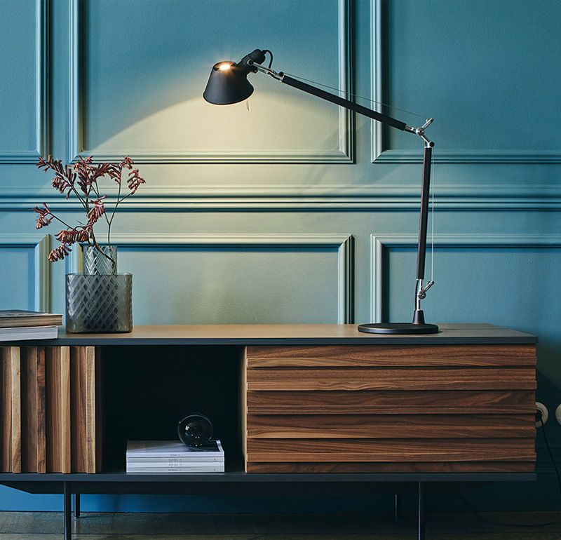 Lámpara de sobremesa. De luz directa. Combina una forma doméstica con tecnologías y materiales innovadores. Hoy en día es un símbolo del objeto moderno, muy utilizado por arquitectos, escritories, fue un éxito de ventas y lo sigue siendo en la actualidad.
