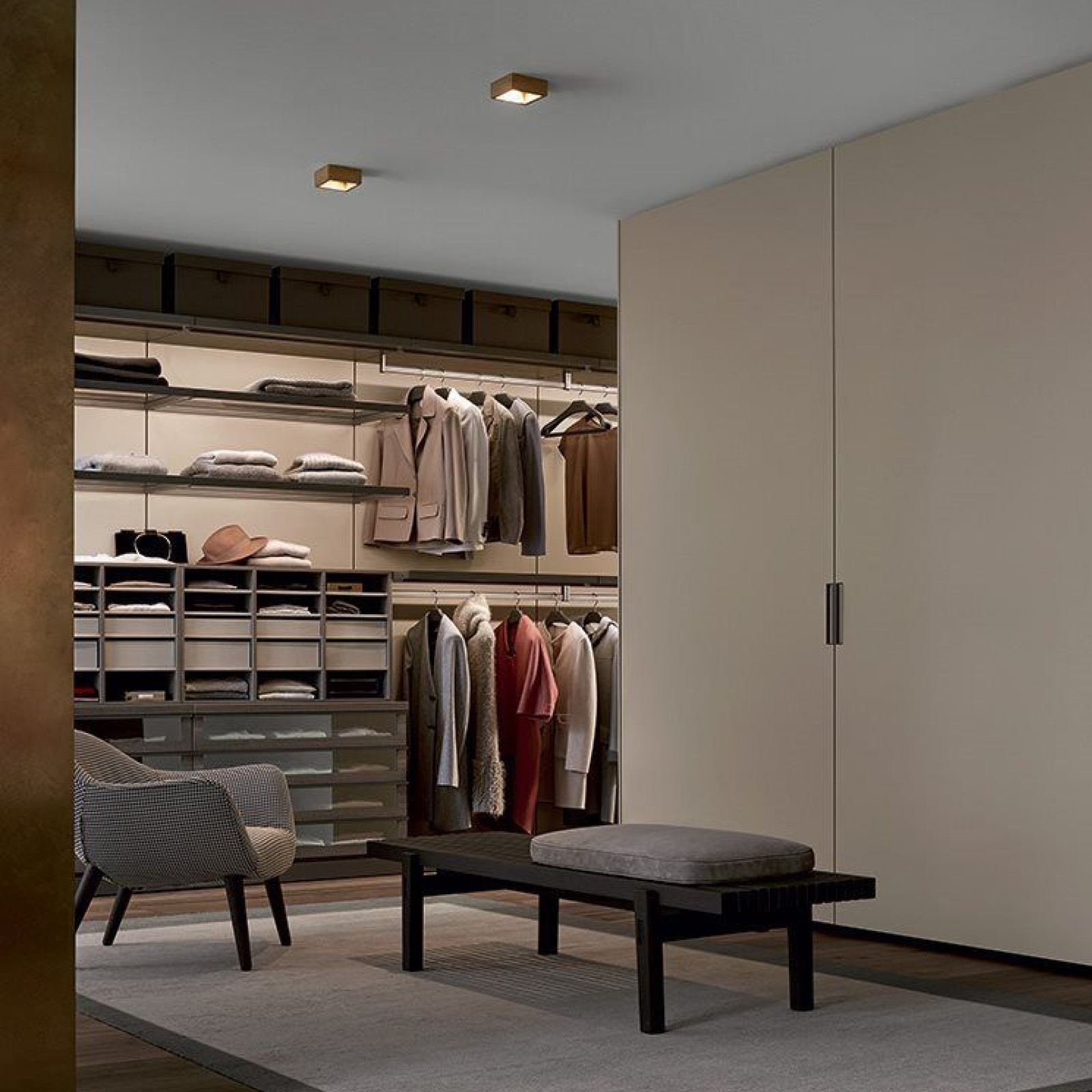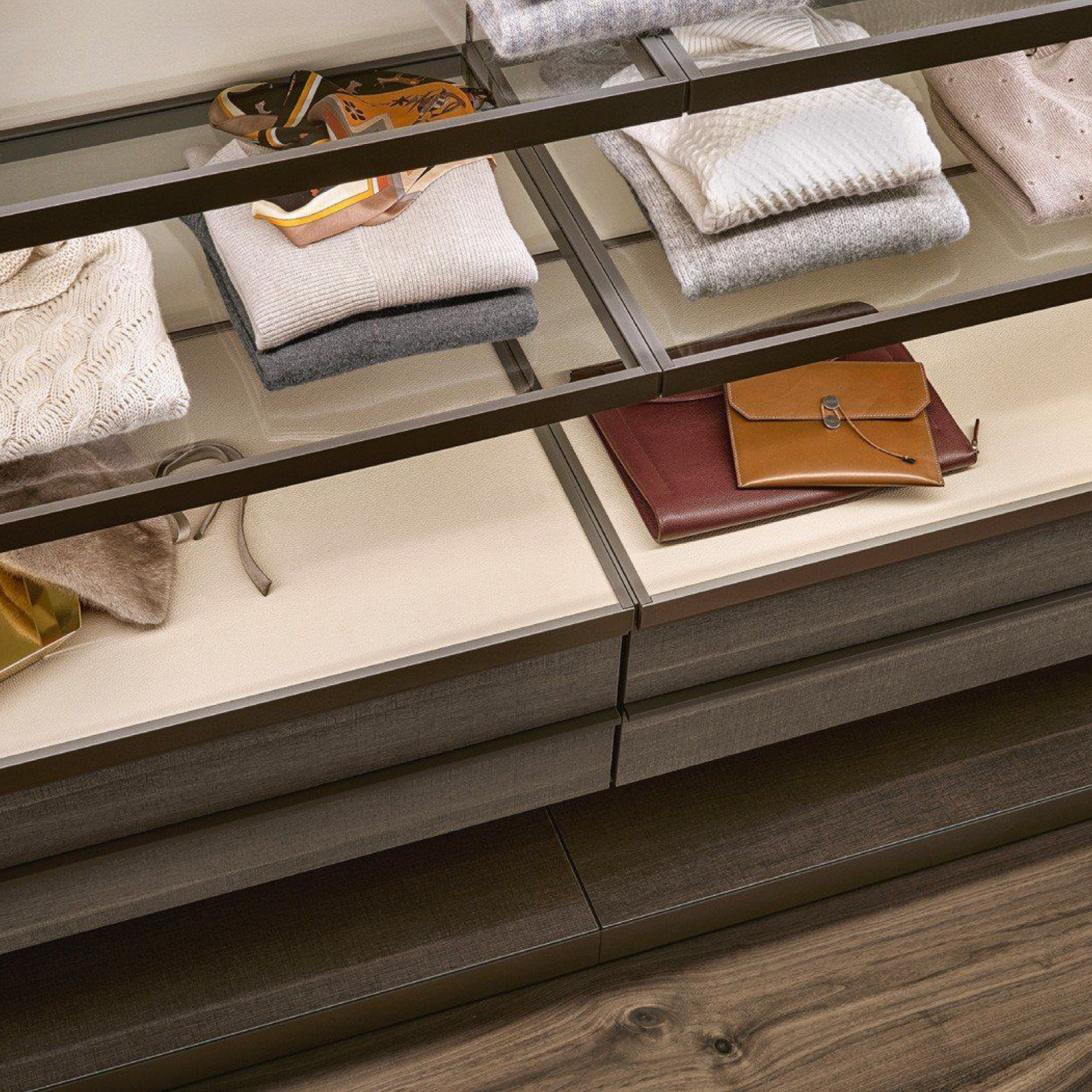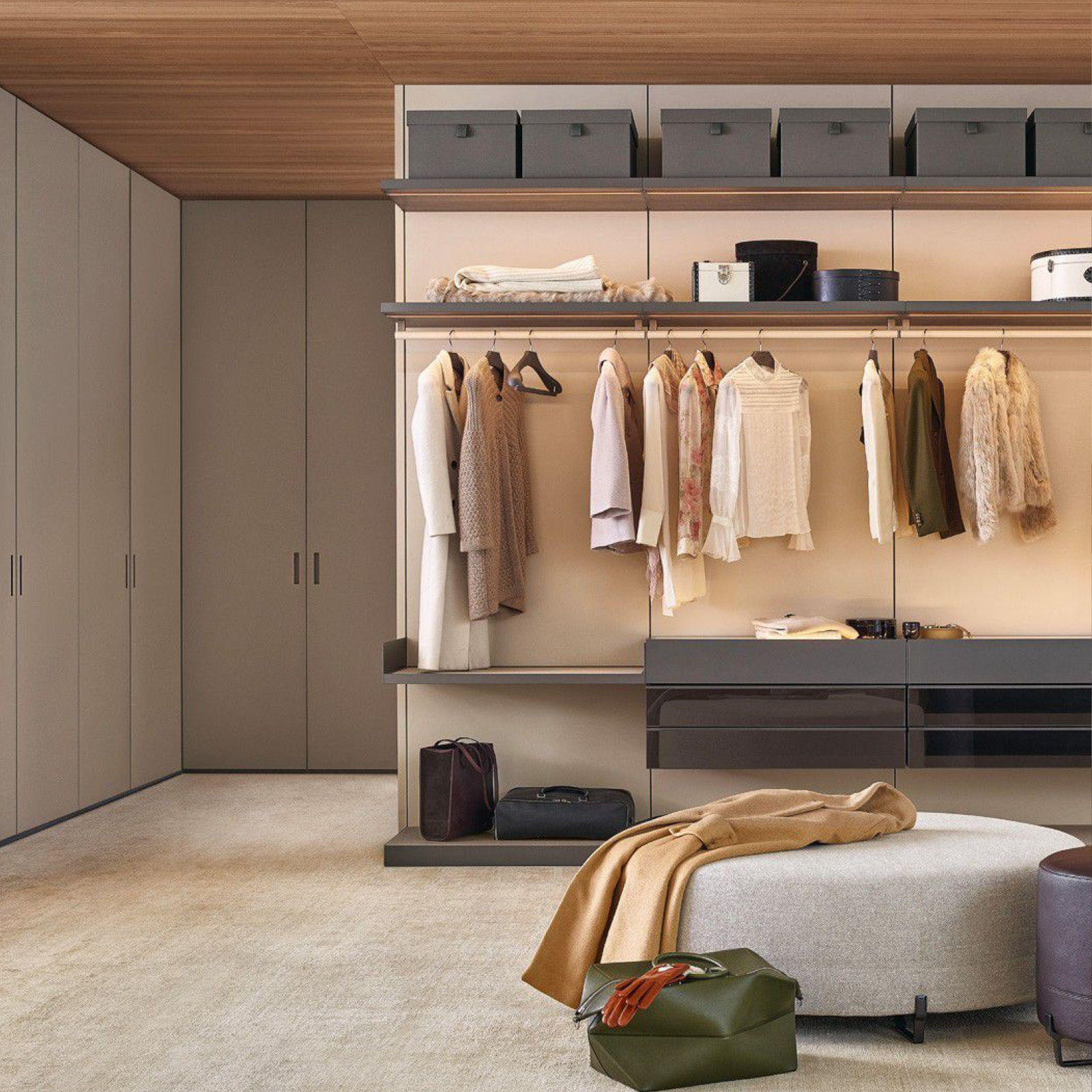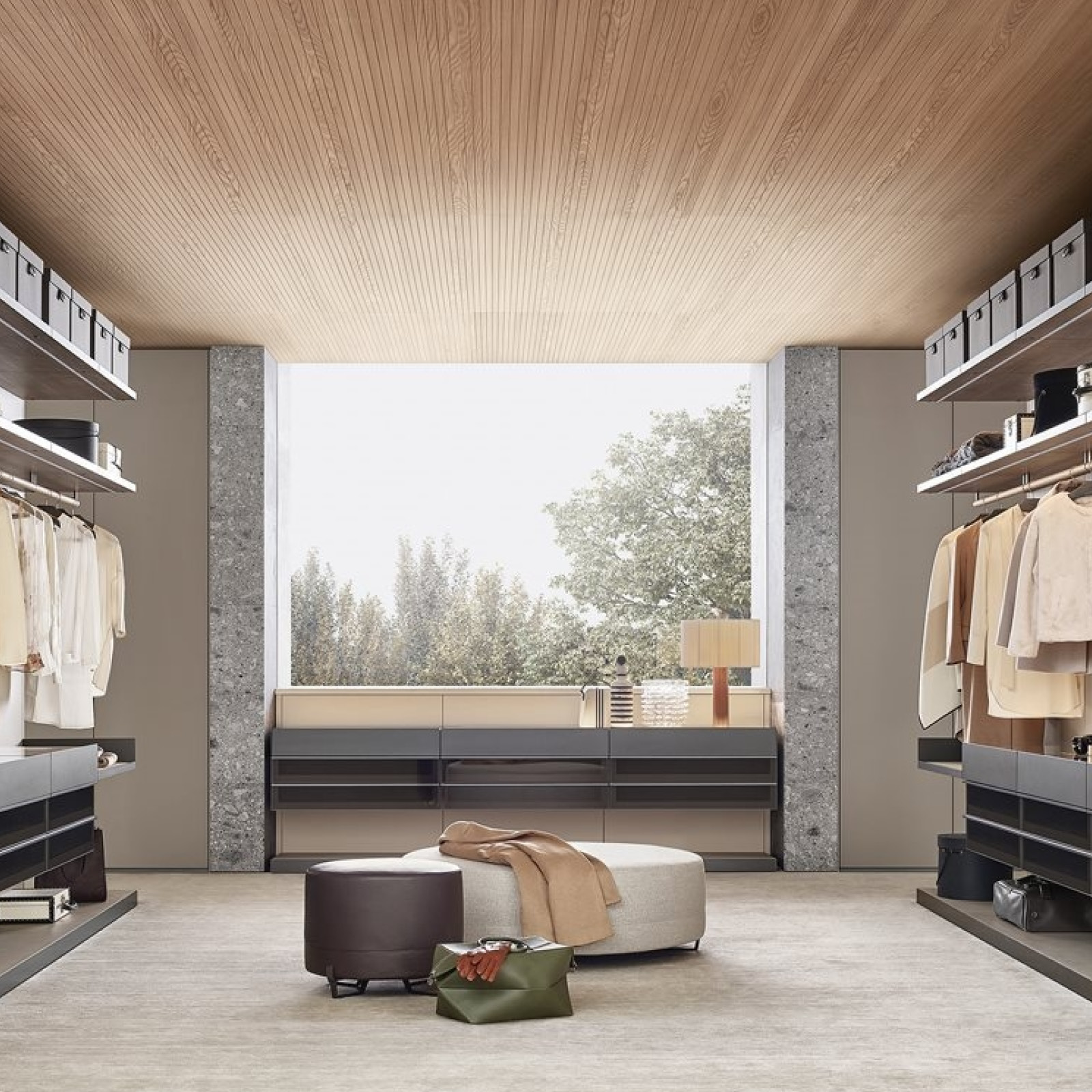 Ubik es un elegante vestidor basado en la combinación de paneles y un sistema de estanterías. Innovador y ligero, ofrece tanto flexibilidad como funcionalidad, gracias a unidades de almacenamiento y accesorios como bandejas, cajones con frentes de madera o cristal, zapateros extraíbles, pantaloneros y camiseros que pueden colocarse a la altura y en el orden deseados. La estructura del vestidor Ubik se compone de un sistema de paneles de pared disponibles en diversos acabados, que pueden combinarse o sustituirse por perfiles con estantes, completados a su vez por baldas y accesorios. Los acabados de los paneles definen el estilo estético del vestidor, como la versión clásica con paneles de laminado de madera, una versión sofisticada en cristal y variantes exclusivas de efecto textil y technocover. El sistema de estanterías se presenta en dos acabados metálicos opcionales, elegante pizarra y brillante champán.