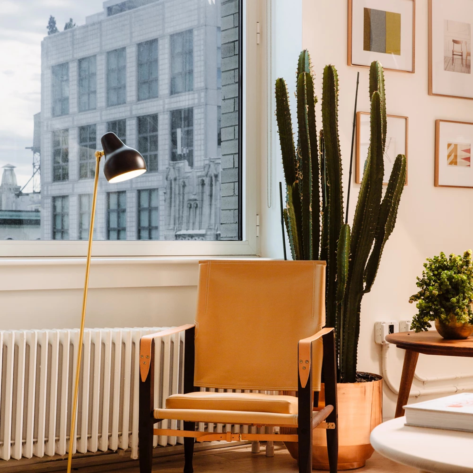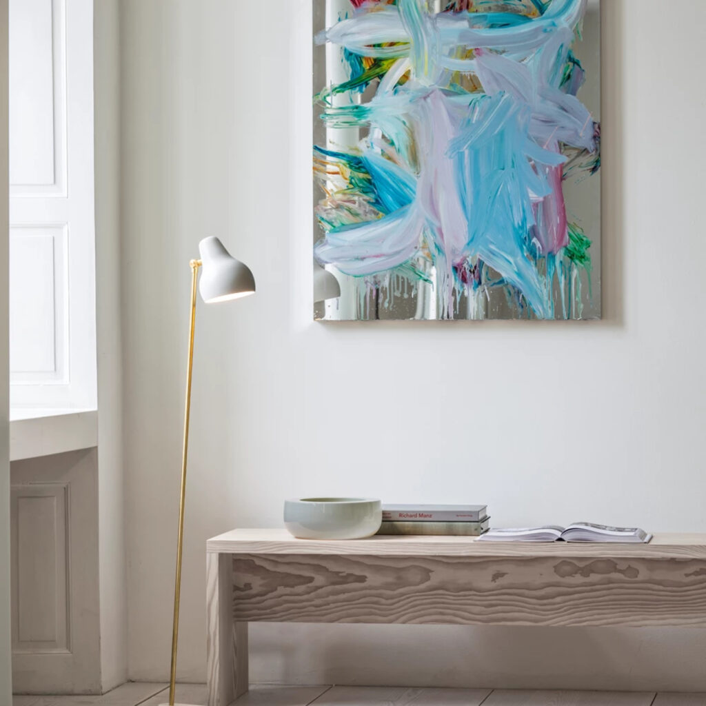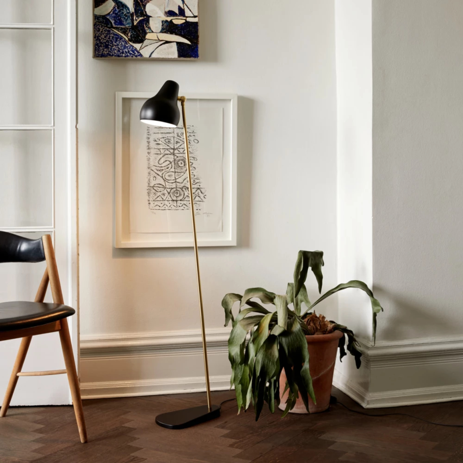 La lámpara de pie VL38 está basada en el diseño original de la lámpara de mesa VL38. La lámpara de mesa VL38 fue diseñada originalmente a finales de la década de 1930 por Vilhelm Lauritzen en colaboración con Louis Poulsen para la construcción del edificio Radiohuset (la casa de radiodifusión danesa) en Copenhague (actualmente la Real Academia Danesa de Música). El diseño de la lámpara de Vilhelm Lauritzen, la VL38 y la lámpara colgante VL45, ambas creadas para Radiohuset, comenzaron a aparecer en los catálogos de Louis Poulsen después de la Segunda Guerra Mundial, a mediados de los años 40. La versión en blanco/latón de la VL38 se relanzó en otoño de 2016. Para adaptarse a los avances contemporáneos en tecnología de iluminación y eficiencia energética, las luminarias han sido equipadas con LED. La edición negra de la VL38, presentada en otoño de 2017, tiene un contorno más definido que la versión original en blanco, aunque mantiene el amado aspecto retro y la suave y curvada expresión del diseño original.