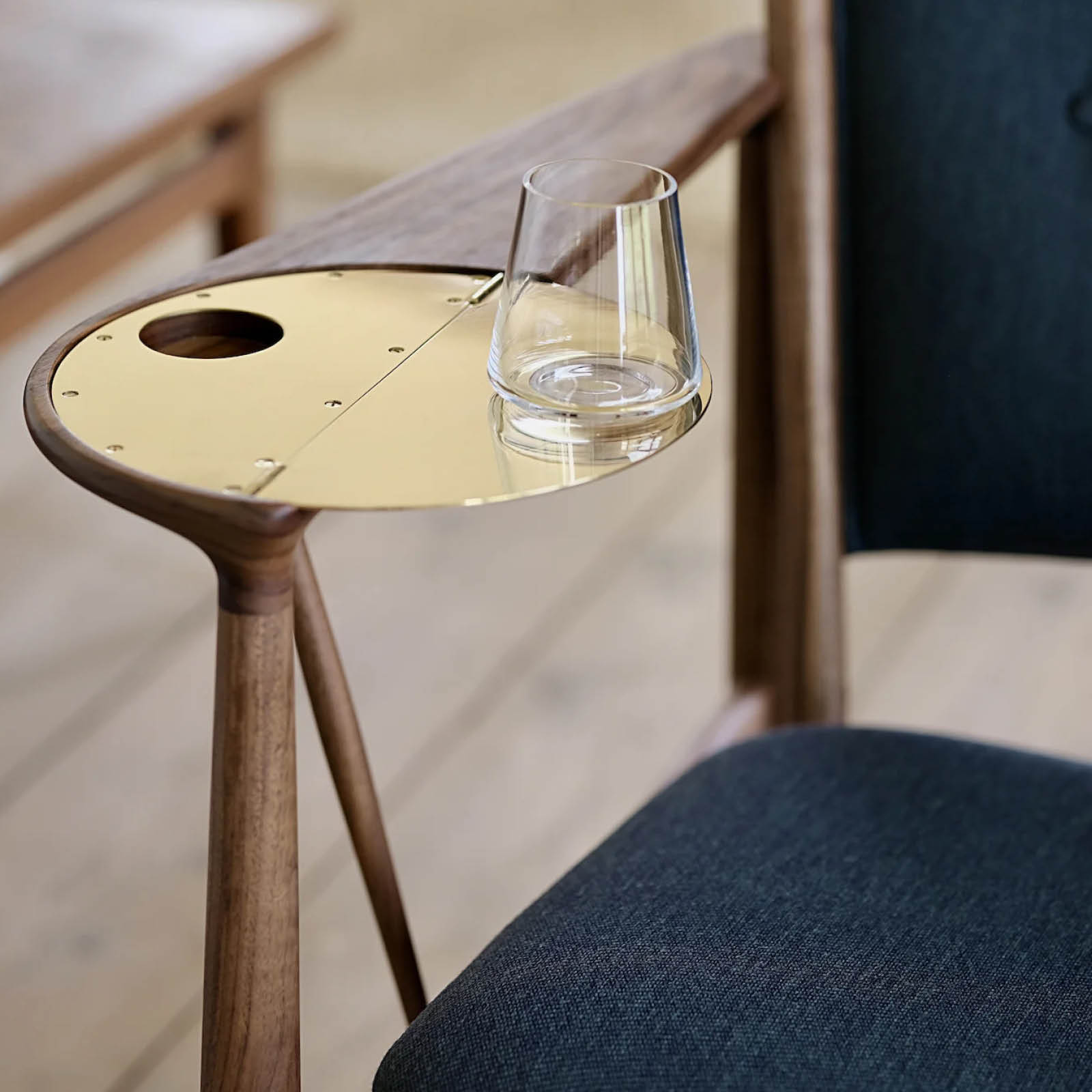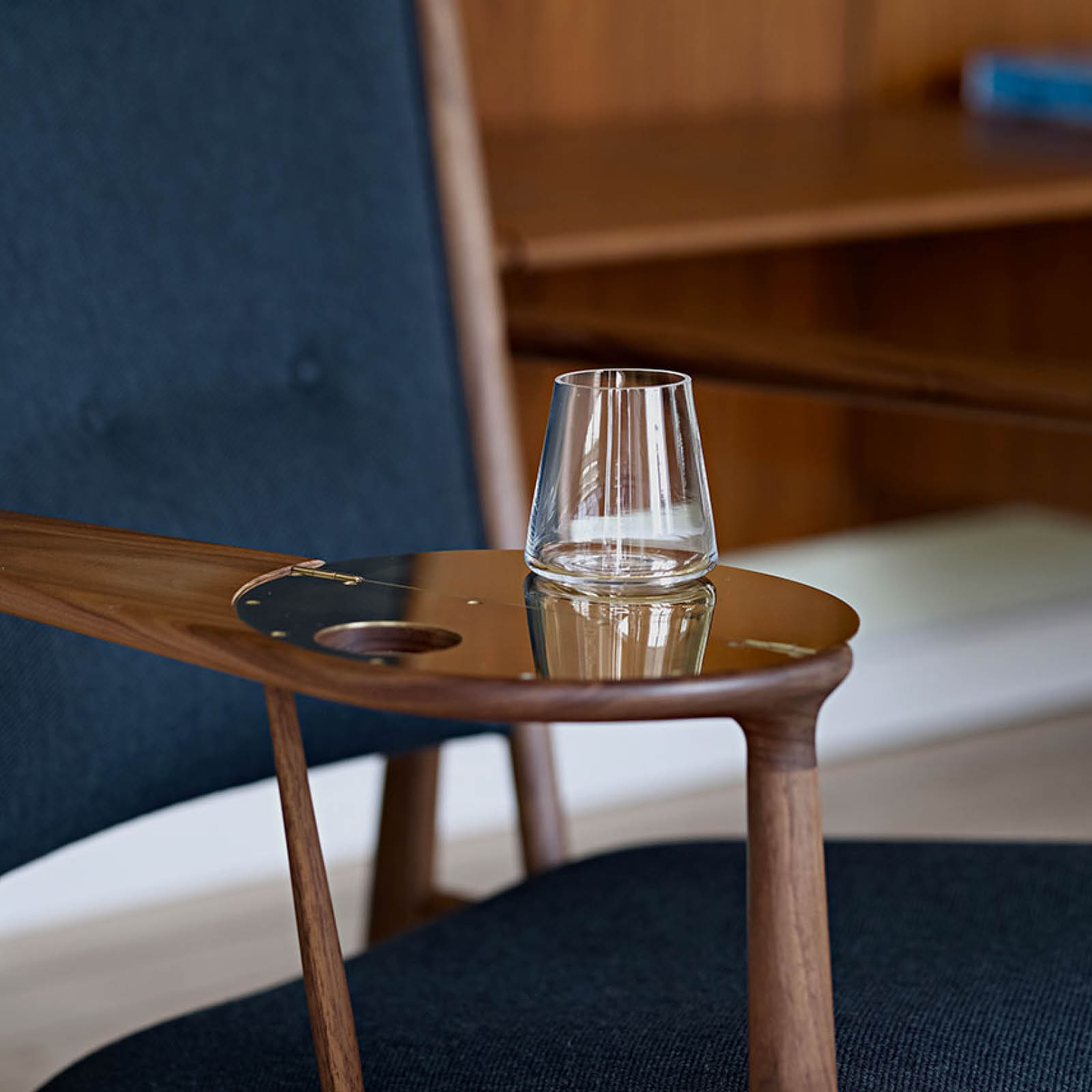 Al realizar la compra, los clientes recibirán un vaso único de vidrio soplado artesanalmente por el vidriero Mikkel Yerst. El dibujo original de Finn Juhl no muestra el vaso, lo que significa que la silla misma ha servido de inspiración para la poderosa forma del vaso especialmente diseñado.