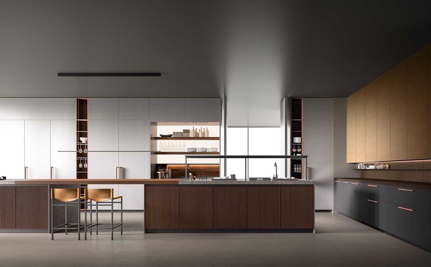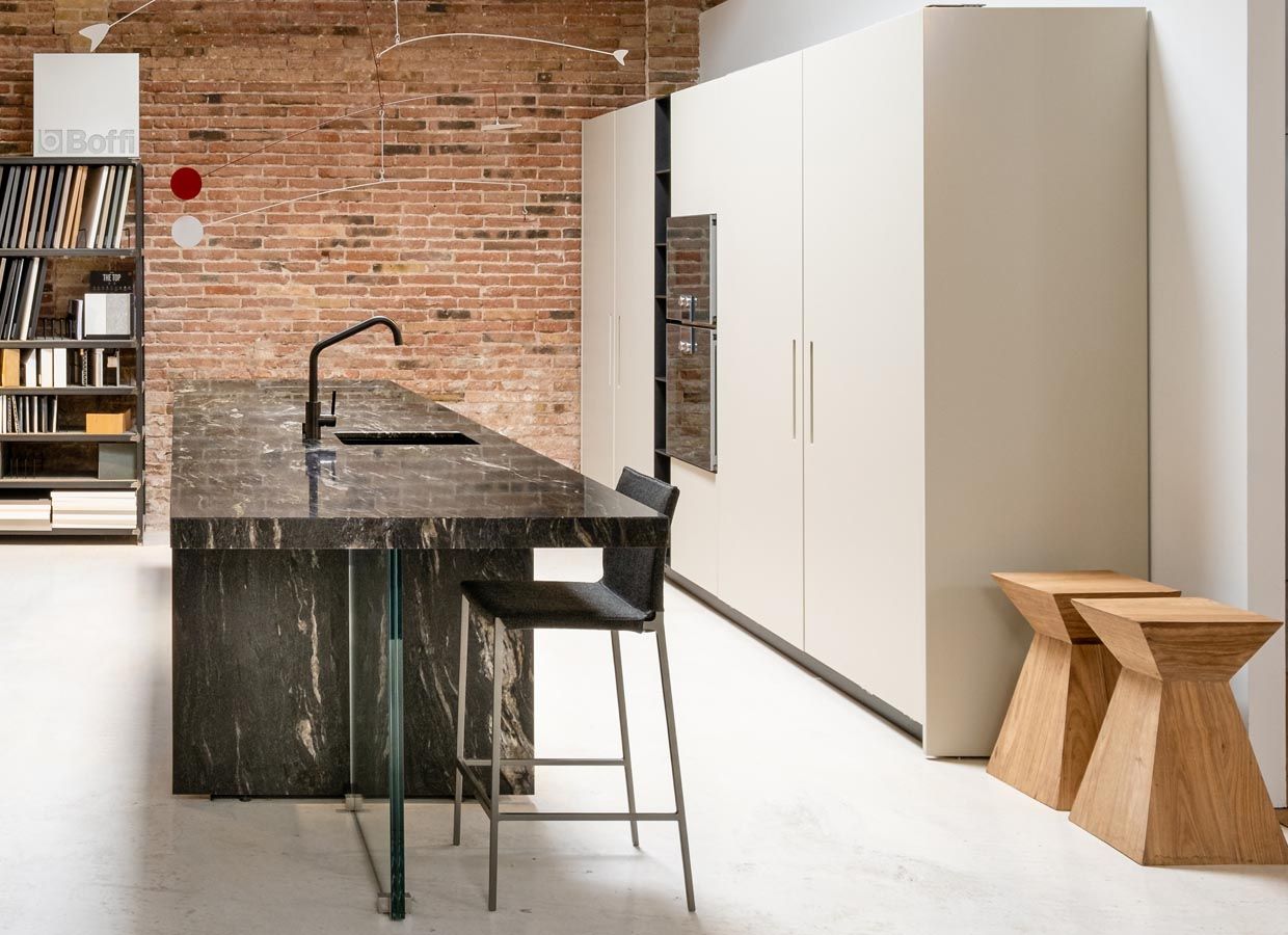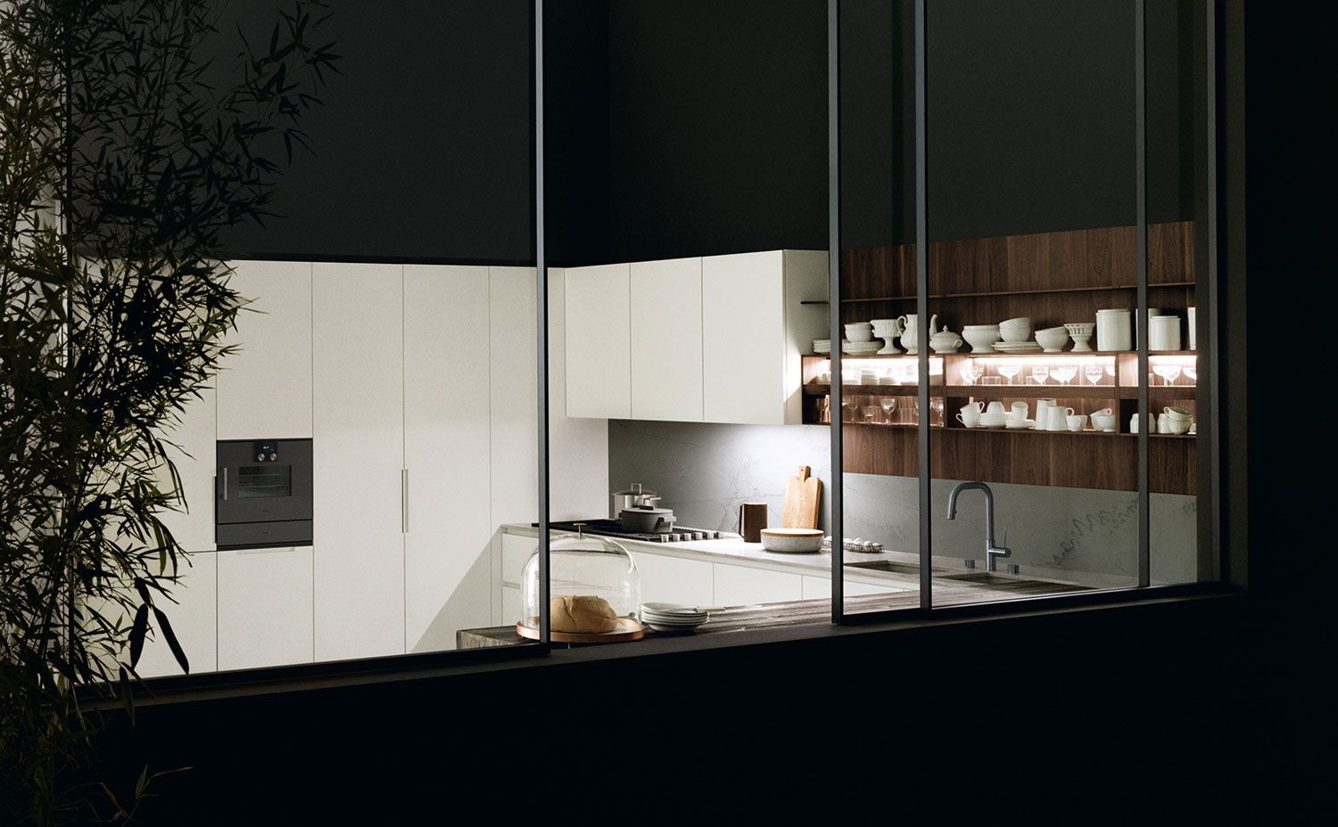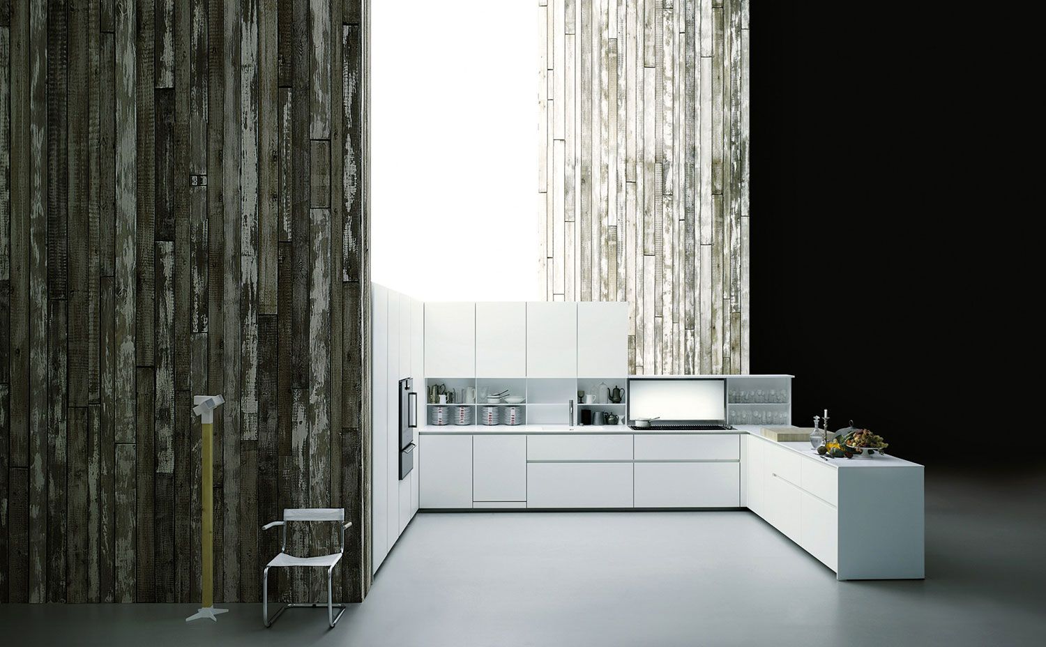 Sistema modular de bases y columnas SIN tirador. La abertura de los frentes es posible gracias a los perfiles superiores e intermedios en bases y a los distanciadores verticales, en columnas. También se puede utilizar el sistema TIP-ON (abertura automática a presión)para cajón intermedio e inferior, eliminando así el perfil intermedio. Para muebles altos, se utiliza el Programa Standard o Aprile. Contenedores de 19 mm de espesor, hidrófugos, en laminado. Cajones con sistema Legrabox. Puertas y frontales de 23 mm de espesor, en acabados según catálogo. Perfiles horizontales y distanciadores verticales, realizados en aluminio y disponibles en color inox, barnizado blanco mate o barnizado negro mate. Zócalo en aluminio, de altura 80 ó 120 mm, y acabado en color inox, barnizado blanco mate o barnizado negro mate.
