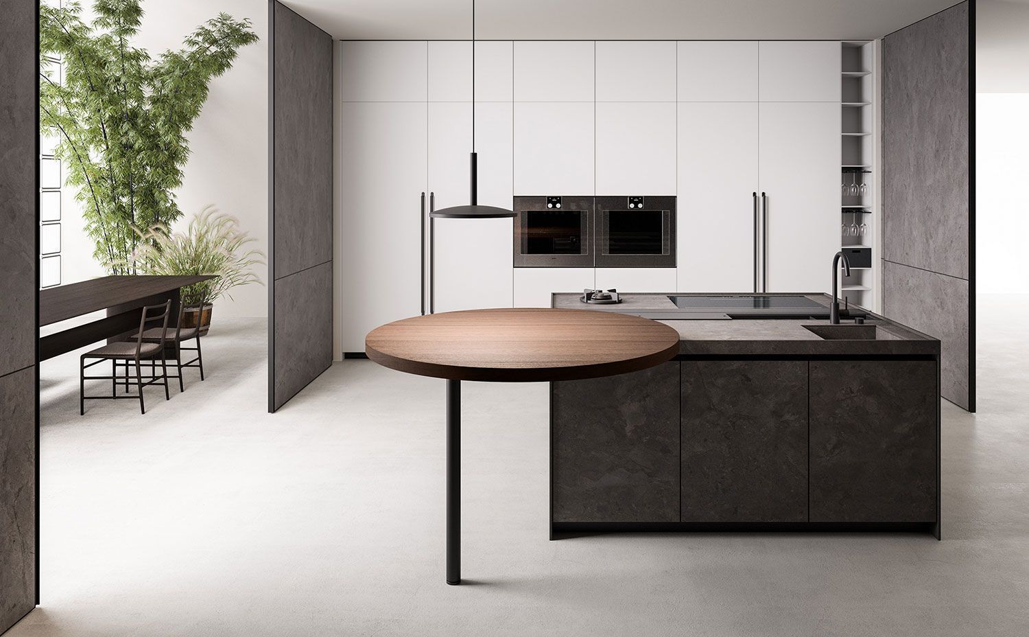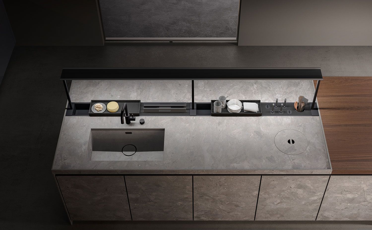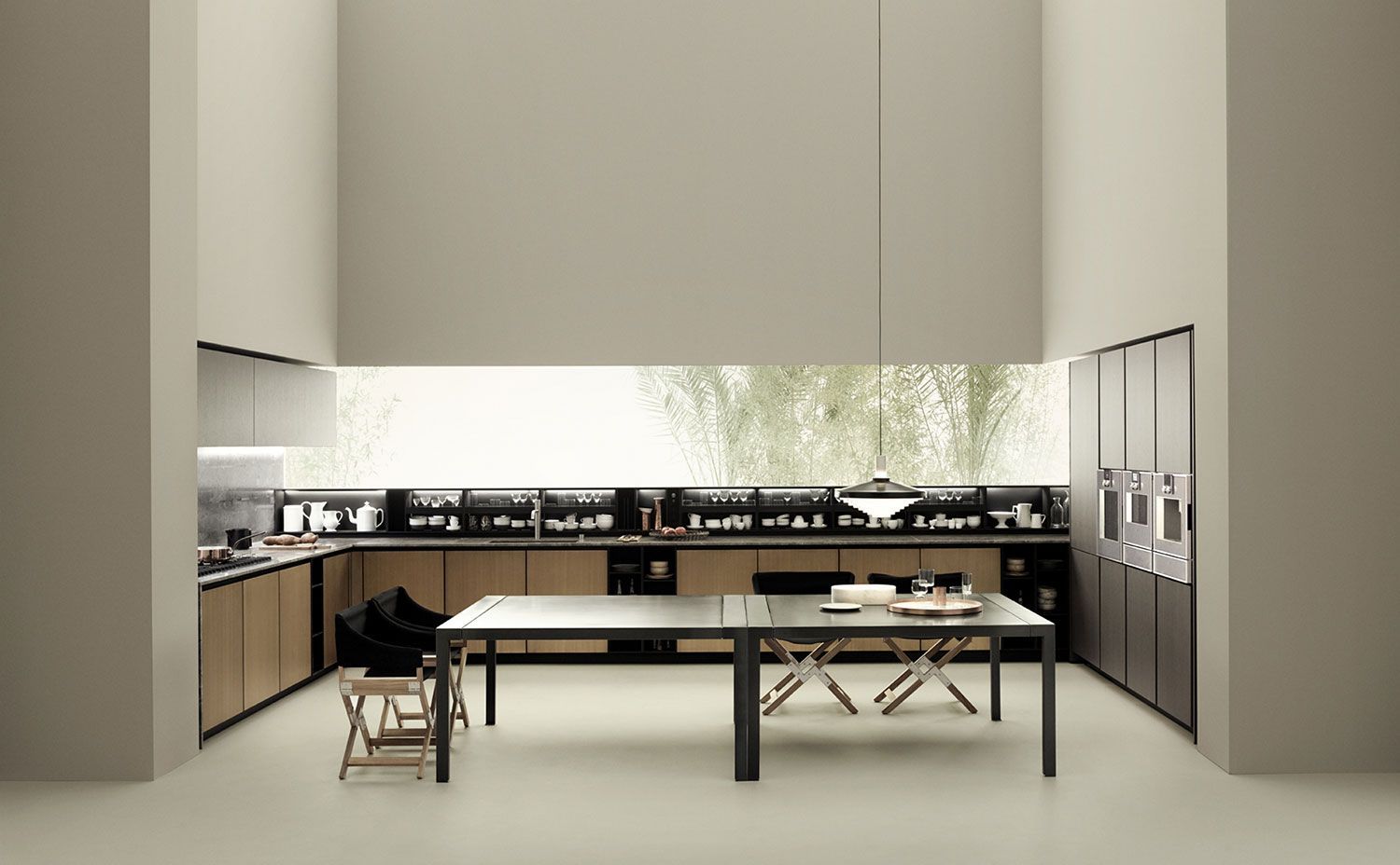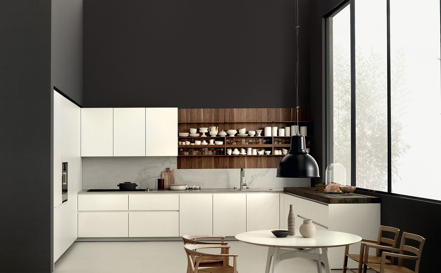 Sistema modular de bases y columnas SIN tirador. La abertura de los frentes es posible gracias a los perfiles superiores e intermedios en bases y a los distanciadores verticales, en columnas. También se puede utilizar el sistema TIP-ON (abertura automática a presión)para cajón intermedio e inferior, eliminando así el perfil intermedio. Para muebles altos, se utiliza el Programa Standard o Aprile. Contenedores de 19 mm de espesor, hidrófugos, en laminado. Cajones con sistema Legrabox. Puertas y frontales de 23 mm de espesor, en acabados según catálogo. Perfiles horizontales y distanciadores verticales, realizados en aluminio y disponibles en color inox, barnizado blanco mate o barnizado negro mate. Zócalo en aluminio, de altura 80 ó 120 mm, y acabado en color inox, barnizado blanco mate o barnizado negro mate.