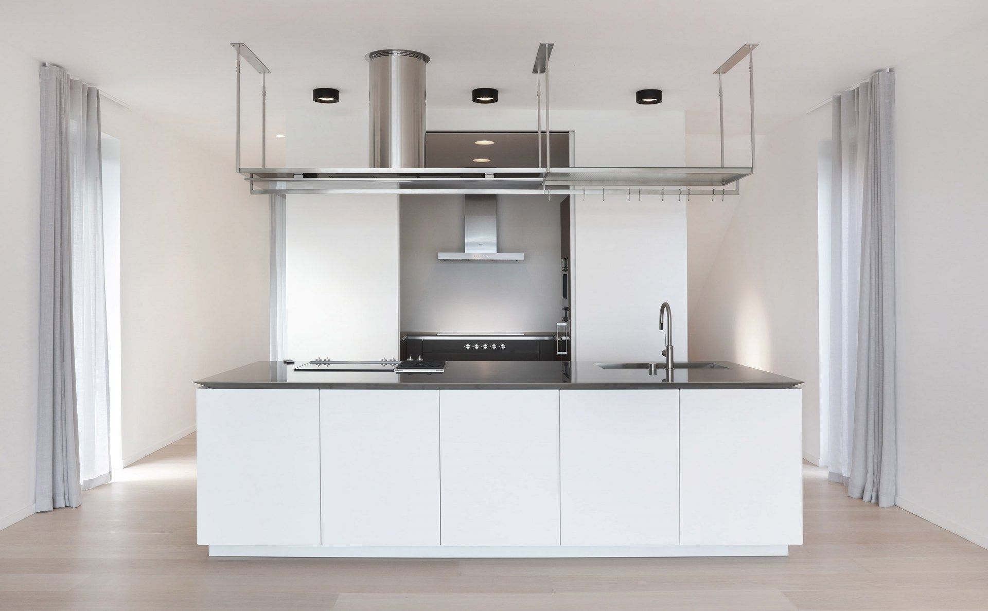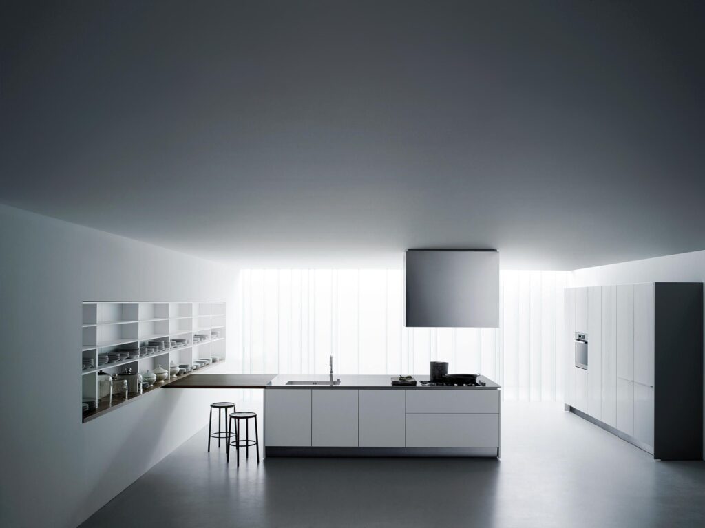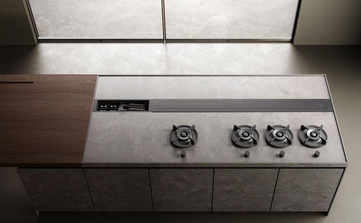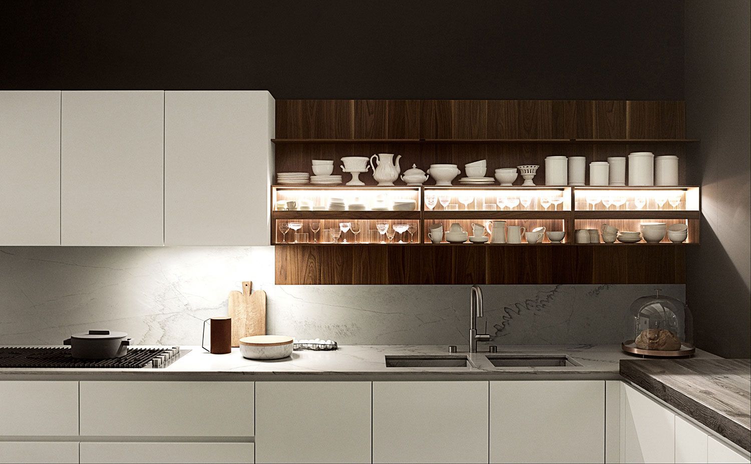 Sistema modular de bases y columnas SIN tirador. La abertura de los frentes es posible gracias a los perfiles superiores e intermedios en bases y a los distanciadores verticales, en columnas. También se puede utilizar el sistema TIP-ON (abertura automática a presión)para cajón intermedio e inferior, eliminando así el perfil intermedio. Para muebles altos, se utiliza el Programa Standard o Aprile. Contenedores de 19 mm de espesor, hidrófugos, en laminado. Cajones con sistema Legrabox. Puertas y frontales de 23 mm de espesor, en acabados según catálogo. Perfiles horizontales y distanciadores verticales, realizados en aluminio y disponibles en color inox, barnizado blanco mate o barnizado negro mate. Zócalo en aluminio, de altura 80 ó 120 mm, y acabado en color inox, barnizado blanco mate o barnizado negro mate.